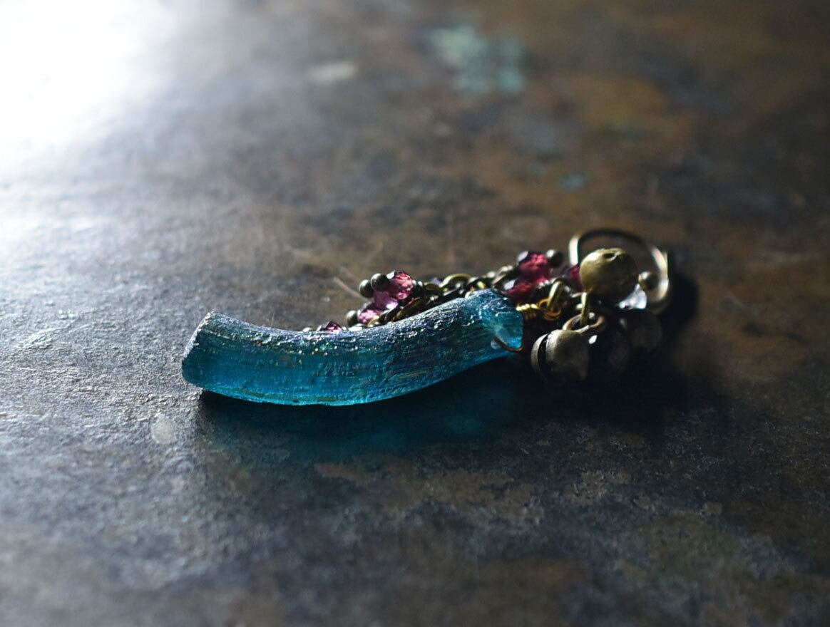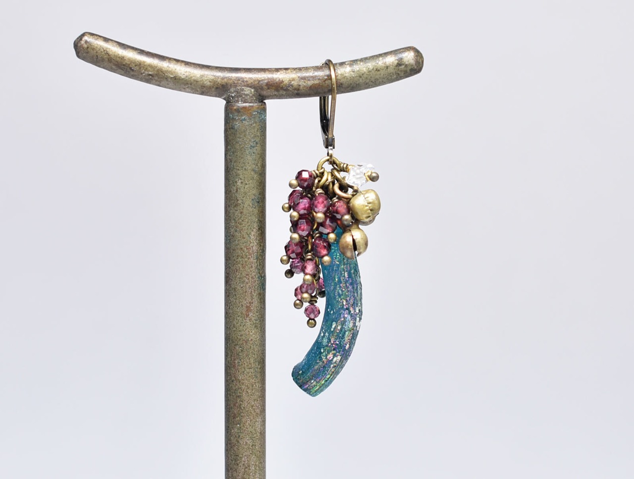銀化ブルーローマングラスとたわわなガーネット、ハーキマーダイヤモンド、民族鈴を繋いだ片耳ピアスです。