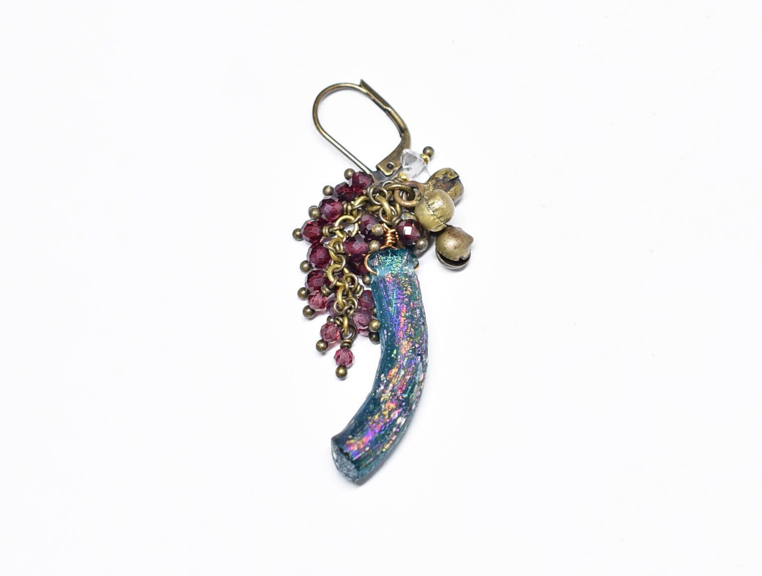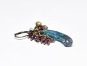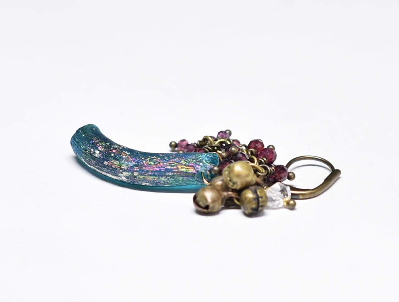 銀化ブルーローマングラスとたわわなガーネット、ハーキマーダイヤモンド、民族鈴の片耳ピアス