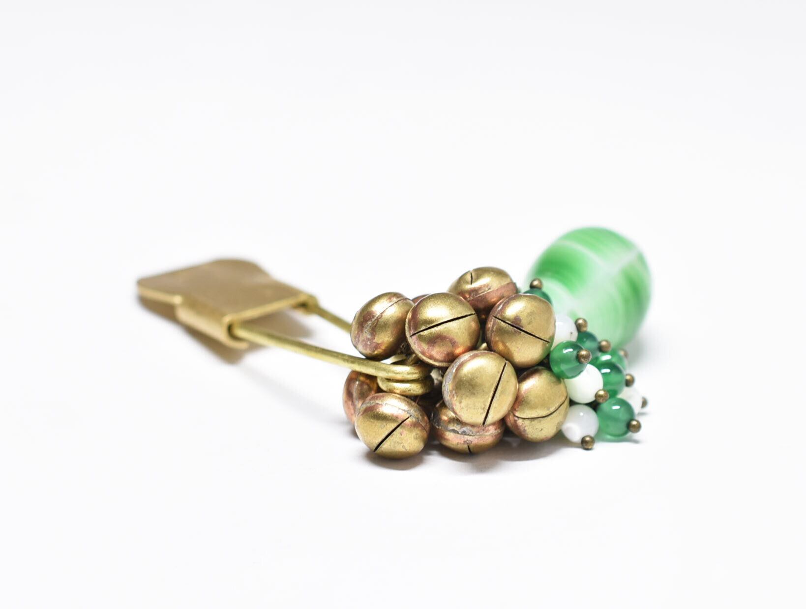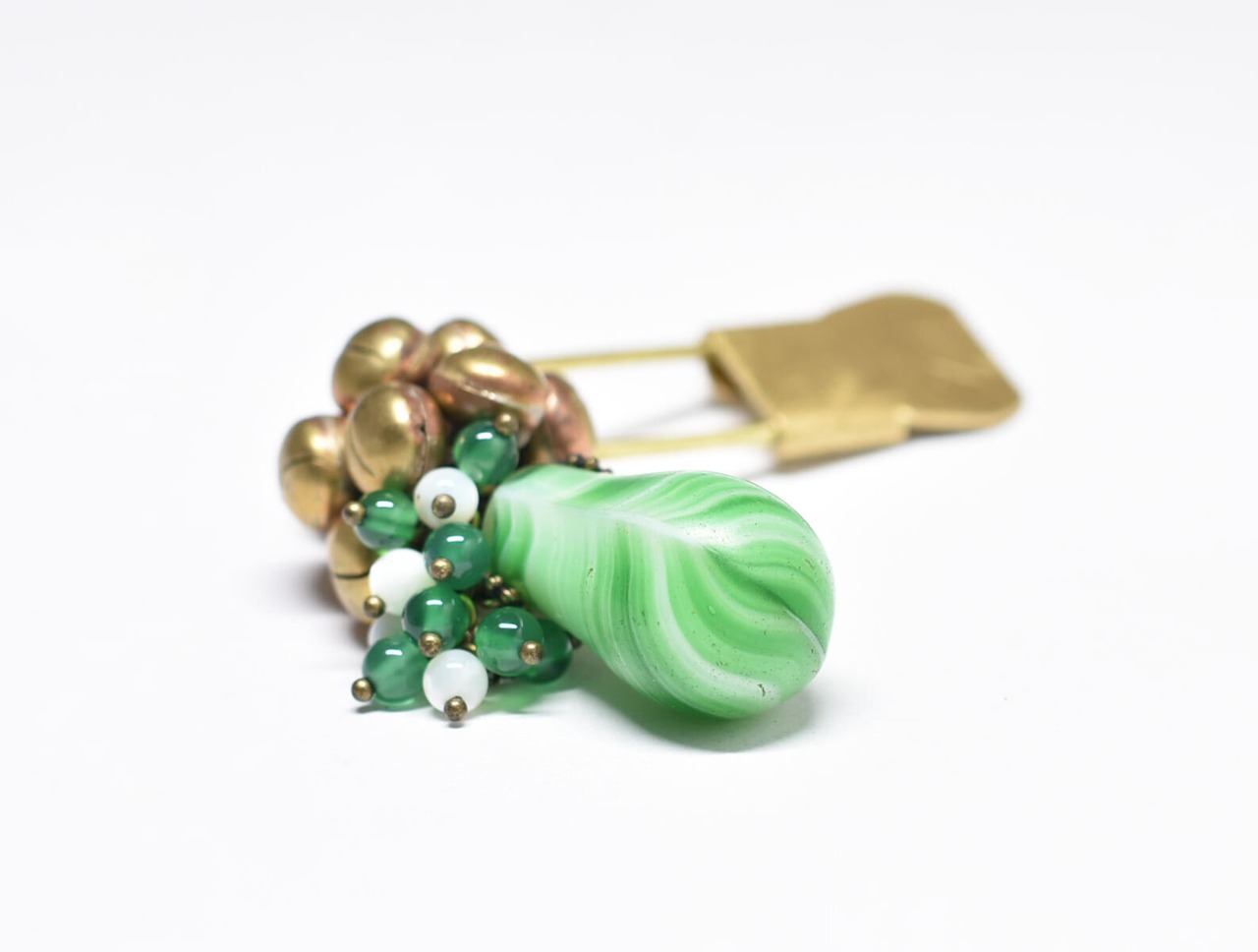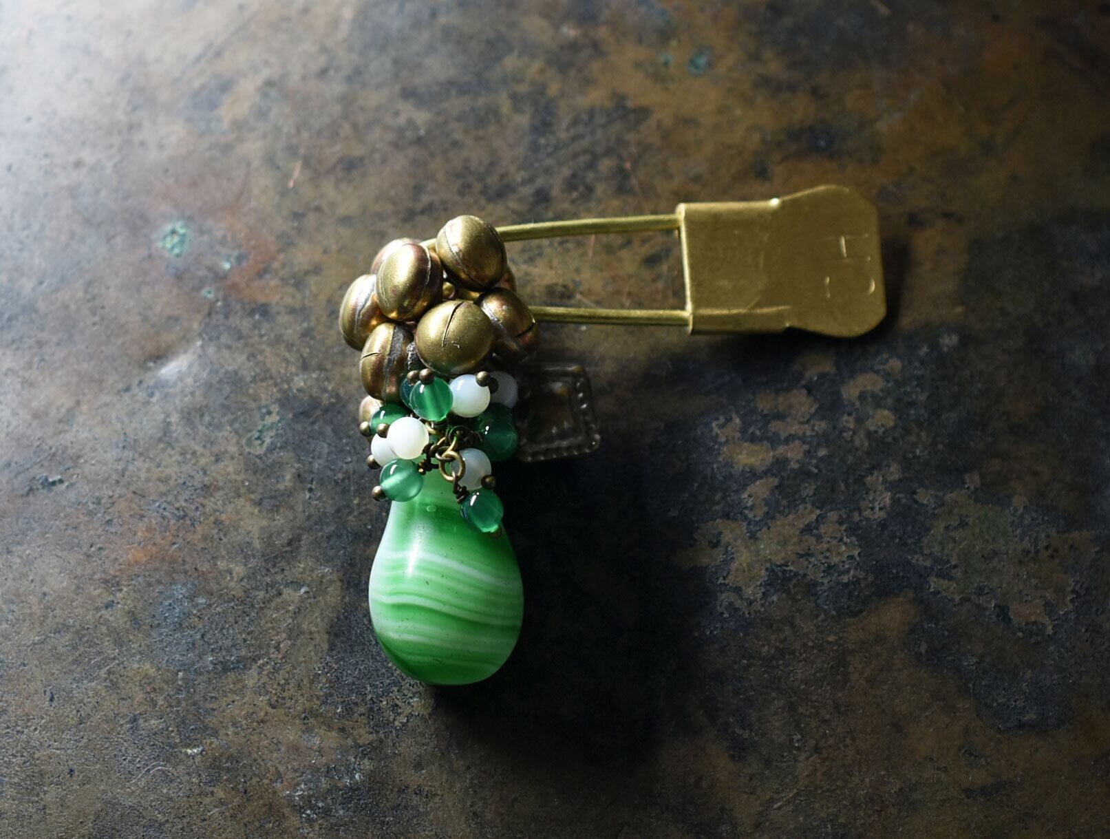 グリーンマーブルウエディングビーズとたわわな鈴&グリーン瑪瑙と白蝶貝、アフガンパーツを繋いだランドリーピンブローチです。