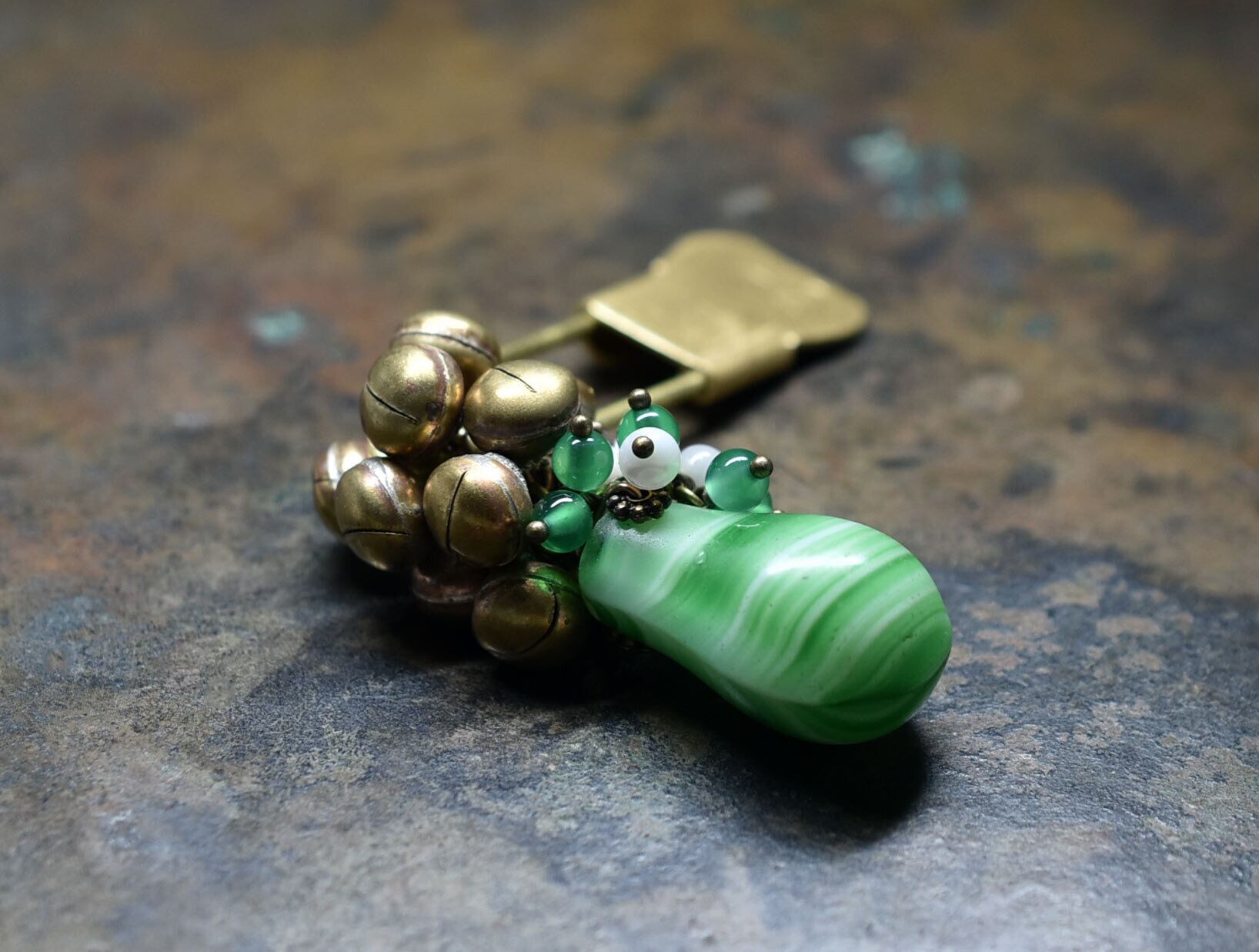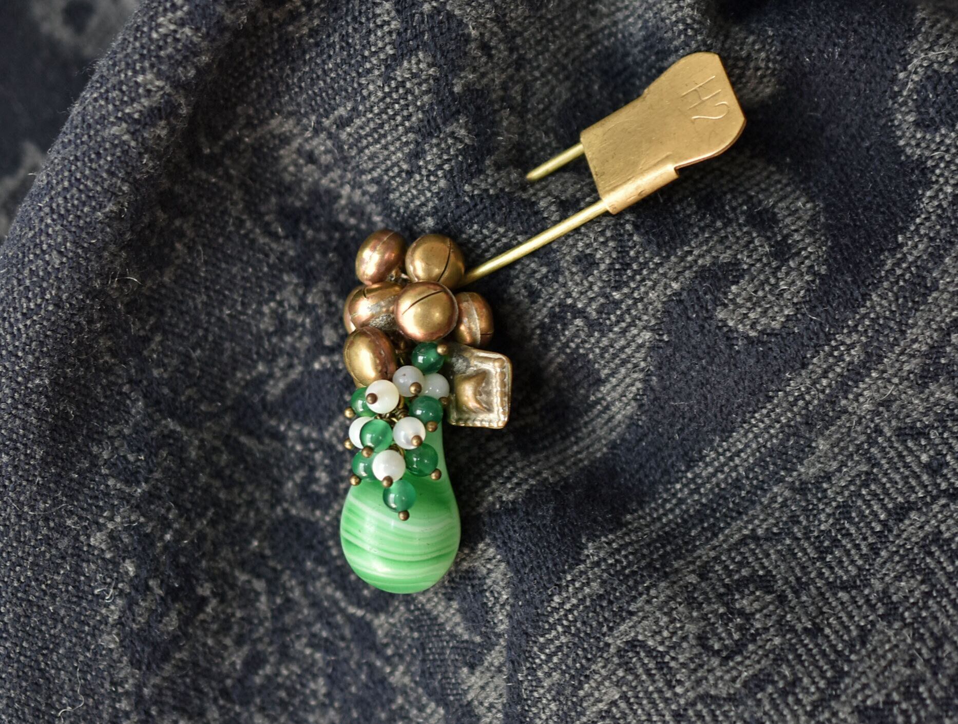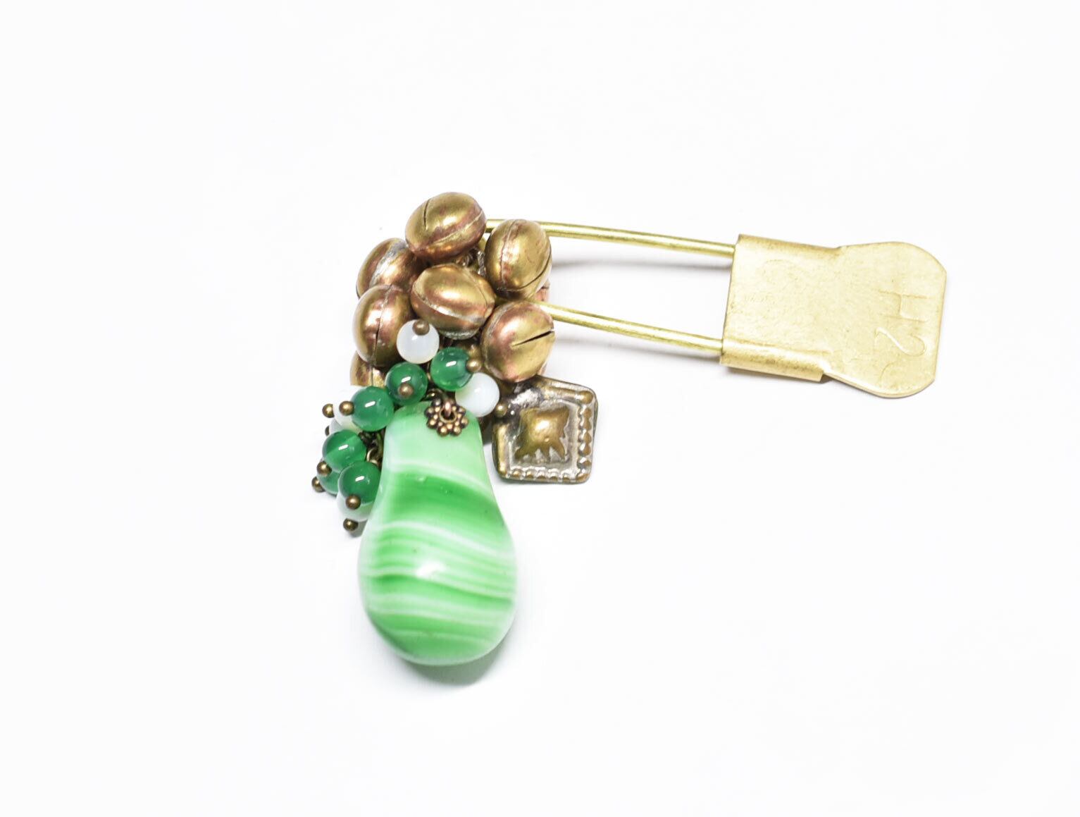 グリーンマーブルウエディングビーズとたわわな鈴&グリーン瑪瑙と白蝶貝、アフガンパーツを繋いだランドリーピンブローチです。