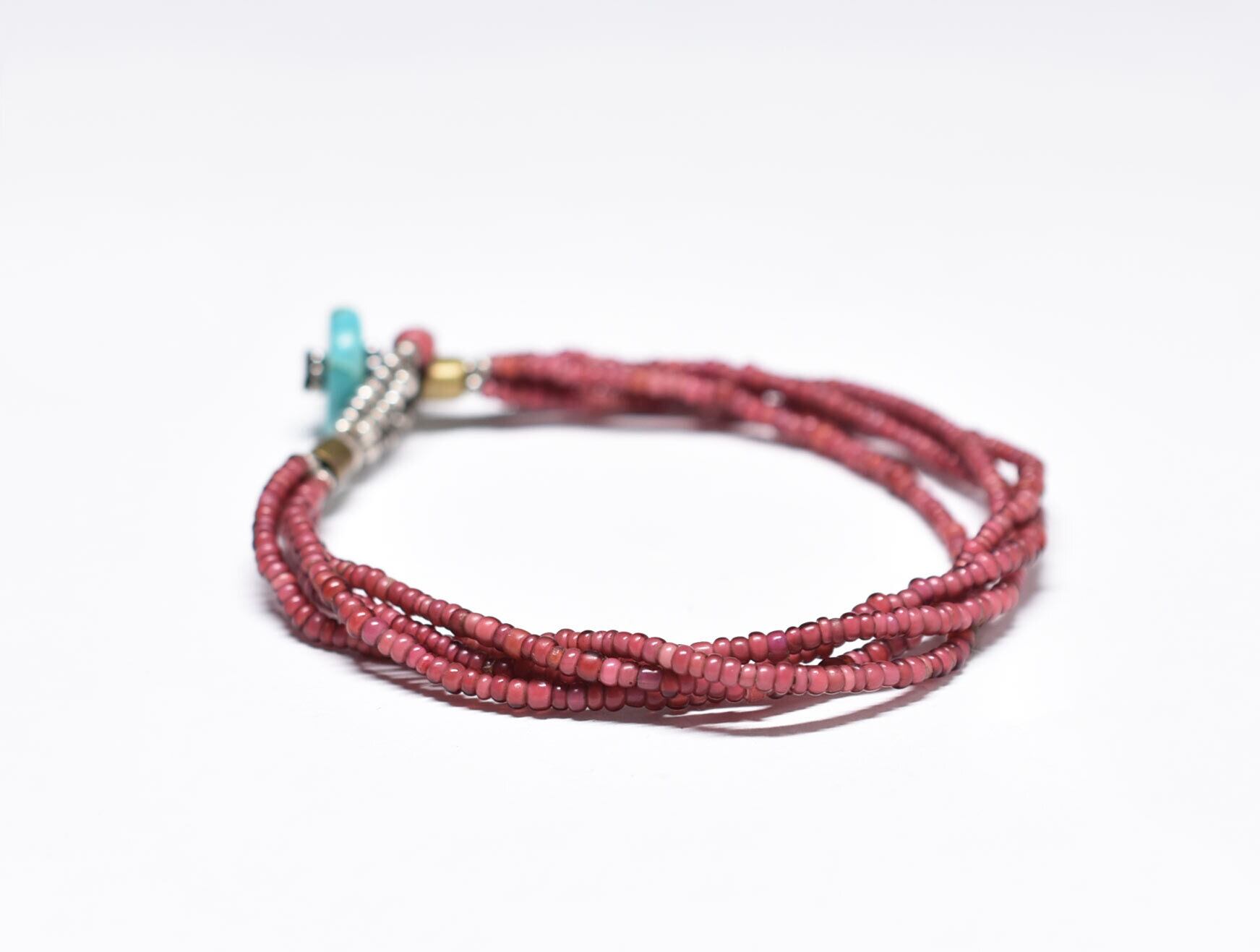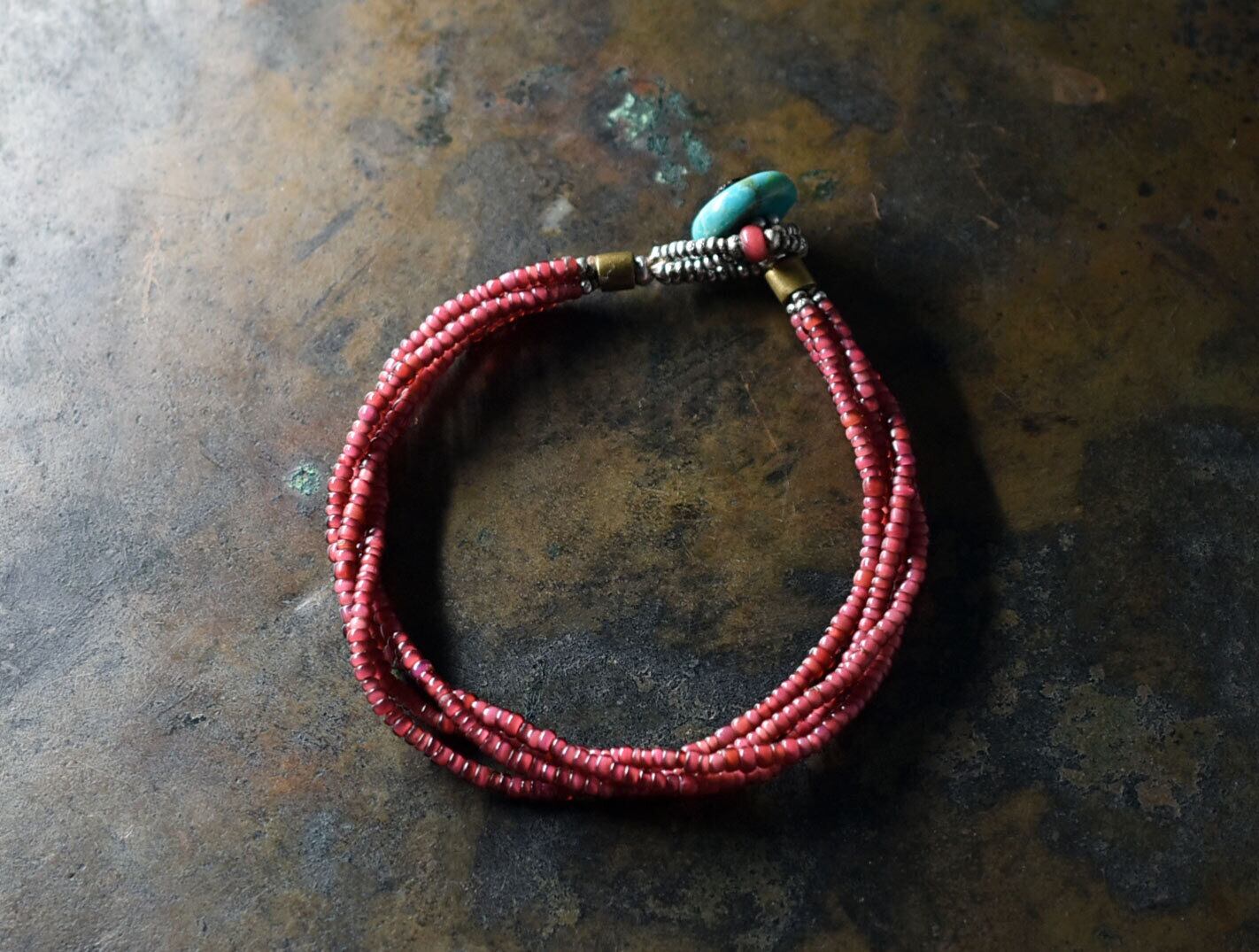 渋い赤色のビーズはホワイトハーツと呼ばれるアンティークビーズです。芯(ハート)部分が白いことからこう呼ばれています。こちらは19~20世紀頃のヴェネチア産のビーズです。渋い赤色は金で赤色を発色させているため、このようなお色をしています、