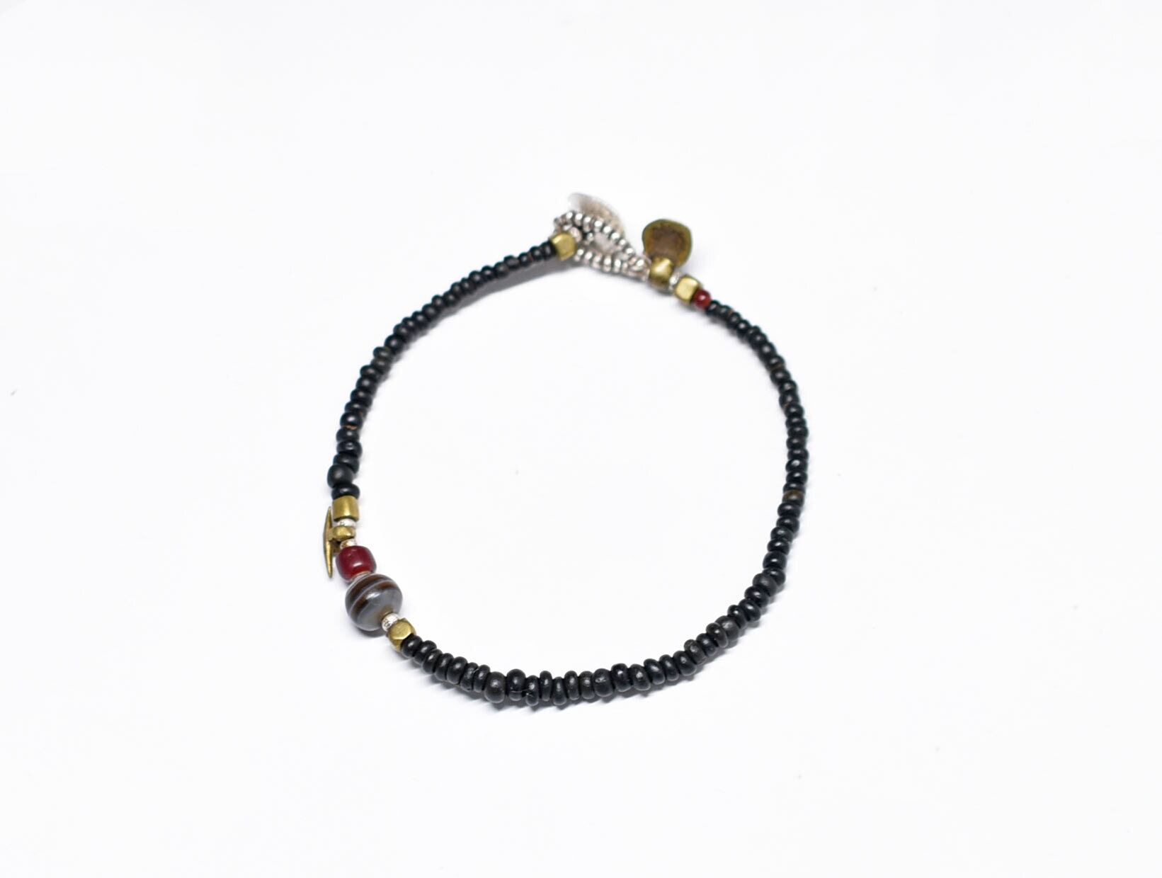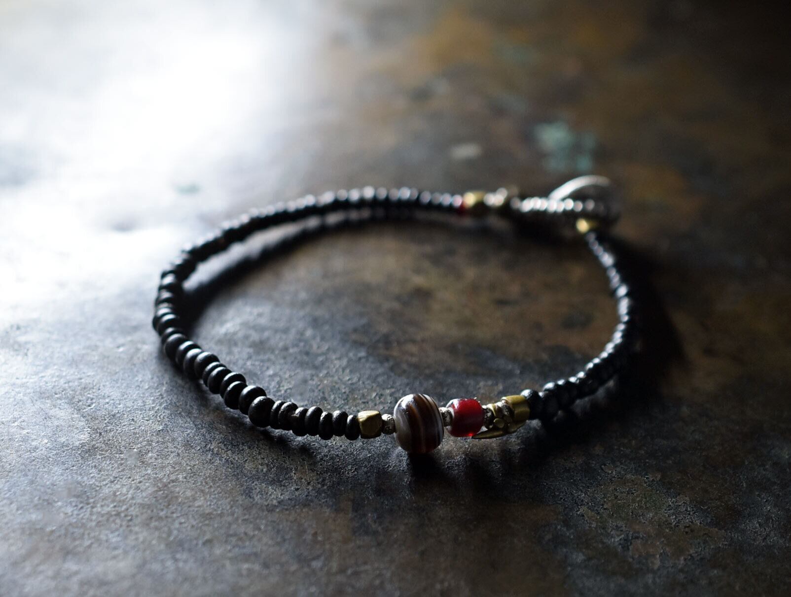 古代瑪瑙と血赤ホワイトハーツ、オリッサブラス、漆黒ビーズを繋いだ華奢なブレスです。