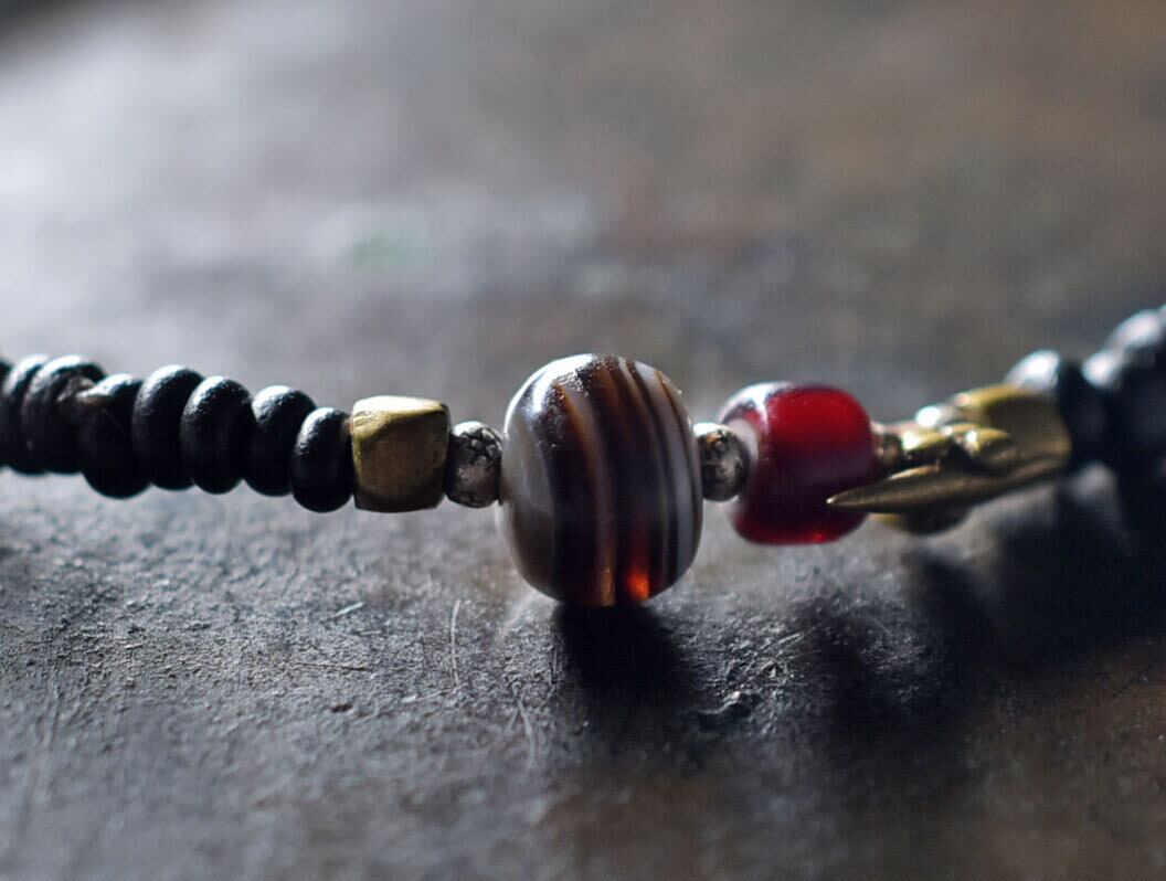 古代瑪瑙と血赤ホワイトハーツ、オリッサブラス、漆黒ビーズの華奢なブレス
