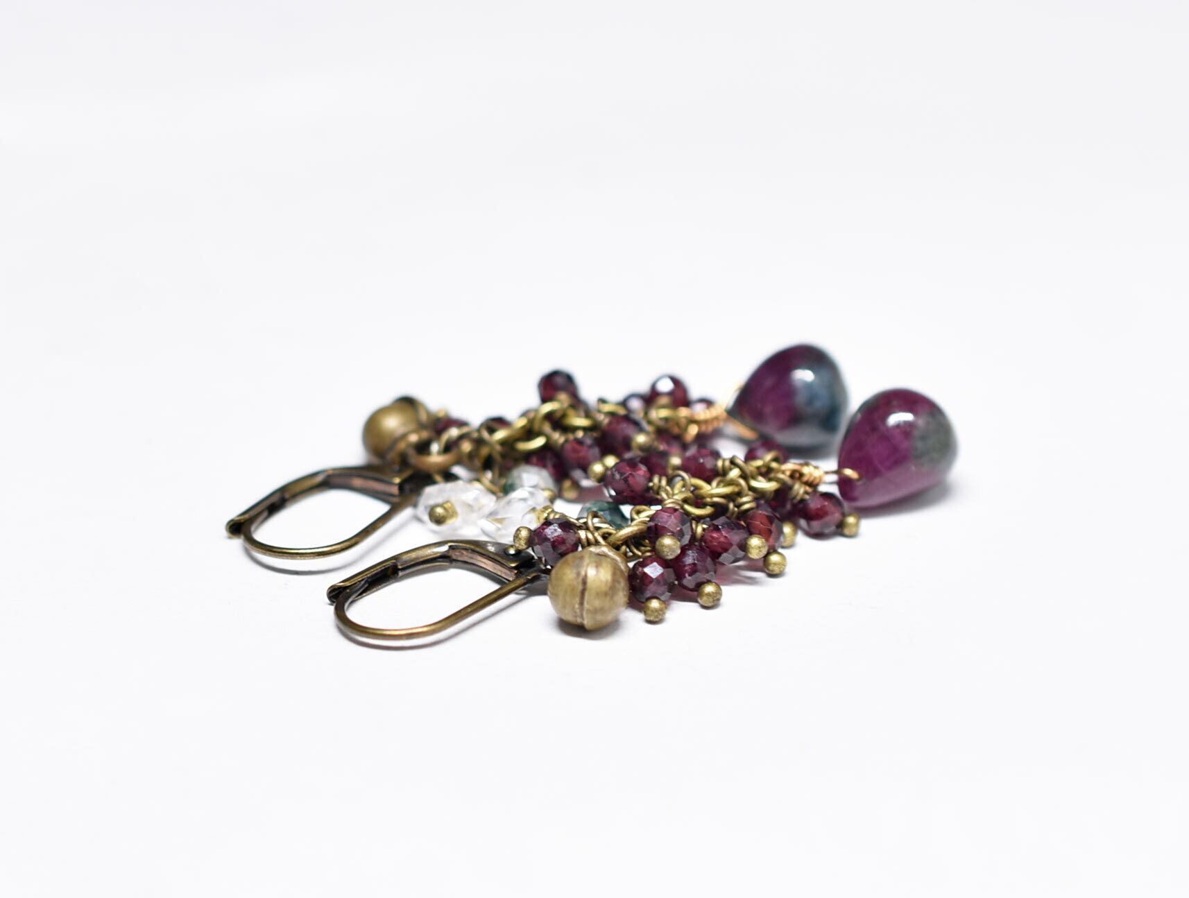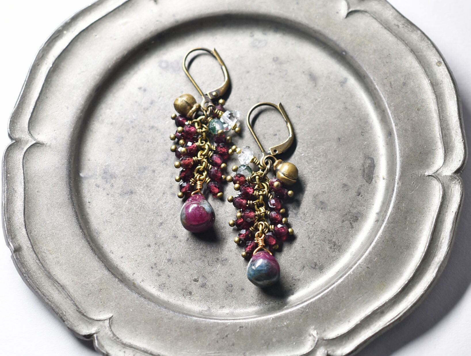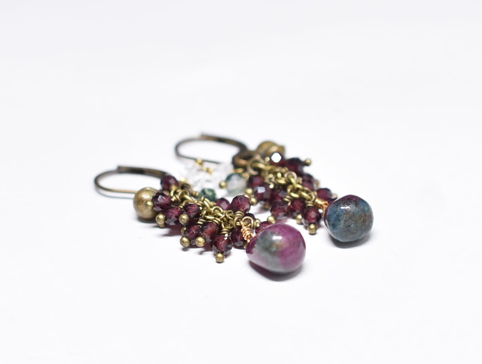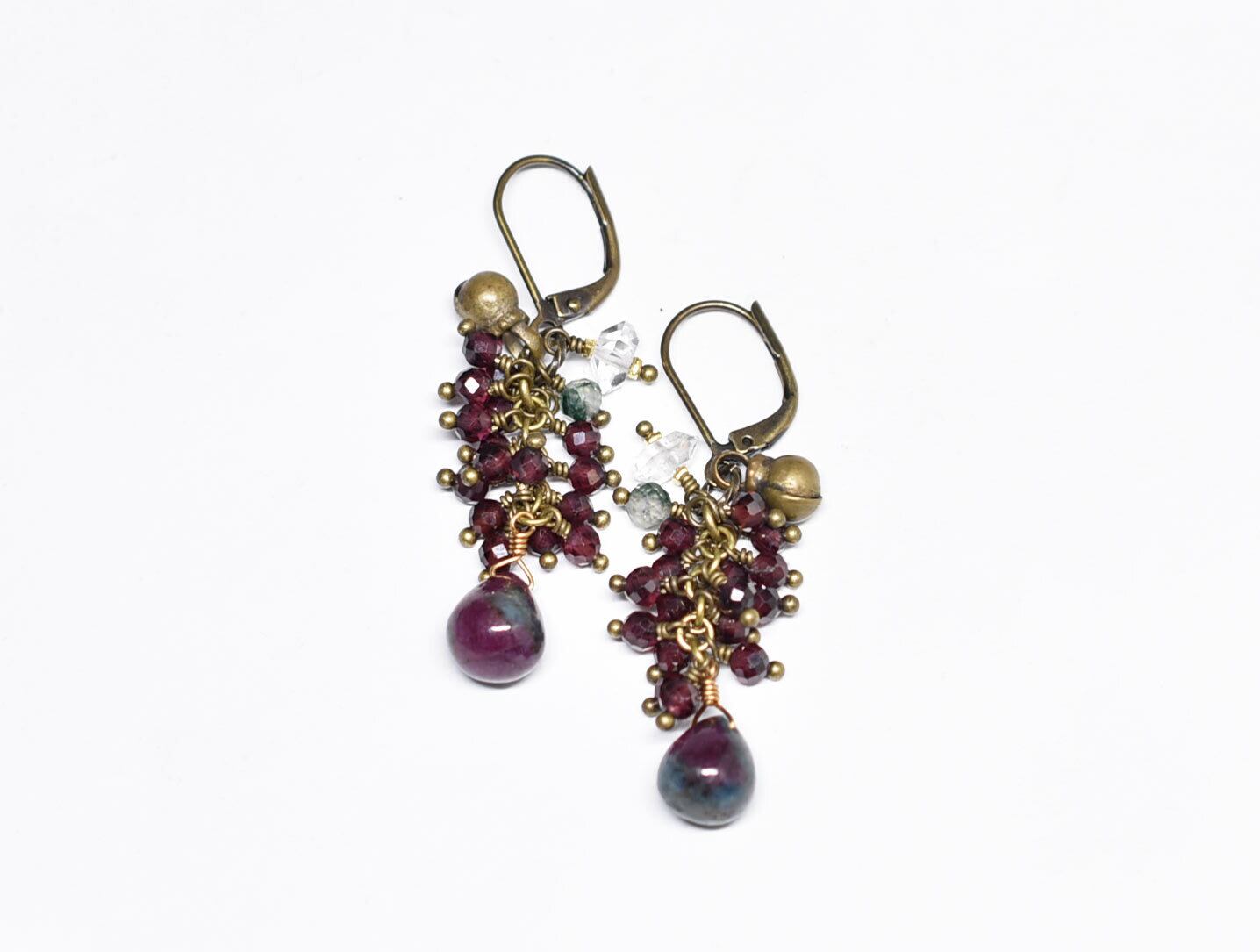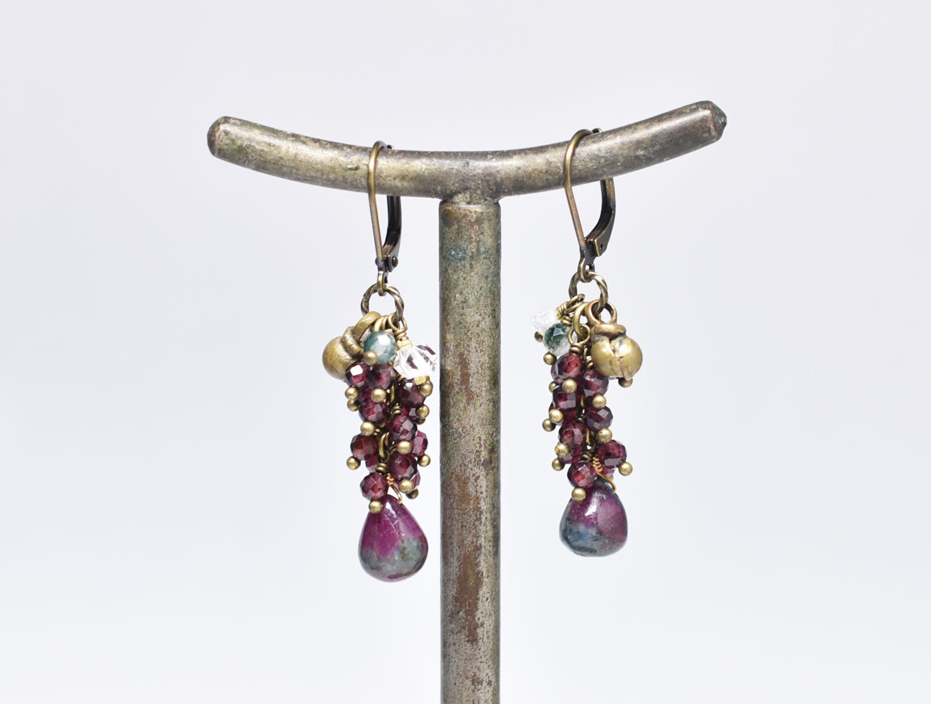 雫ルビーインゾイサイト、たわわなガーネット、モスアゲート、ハーキマーダイヤモンド、民族鈴を繋いだピアスです。