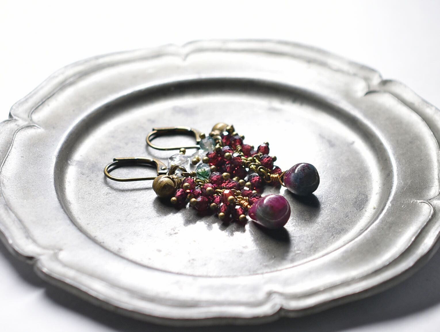 雫ルビーインゾイサイト、たわわなガーネット、モスアゲート、ハーキマーダイヤモンド、民族鈴のピアス