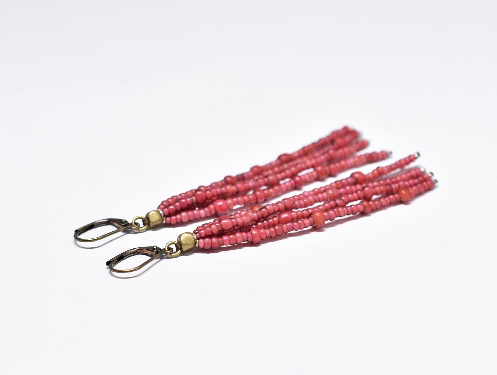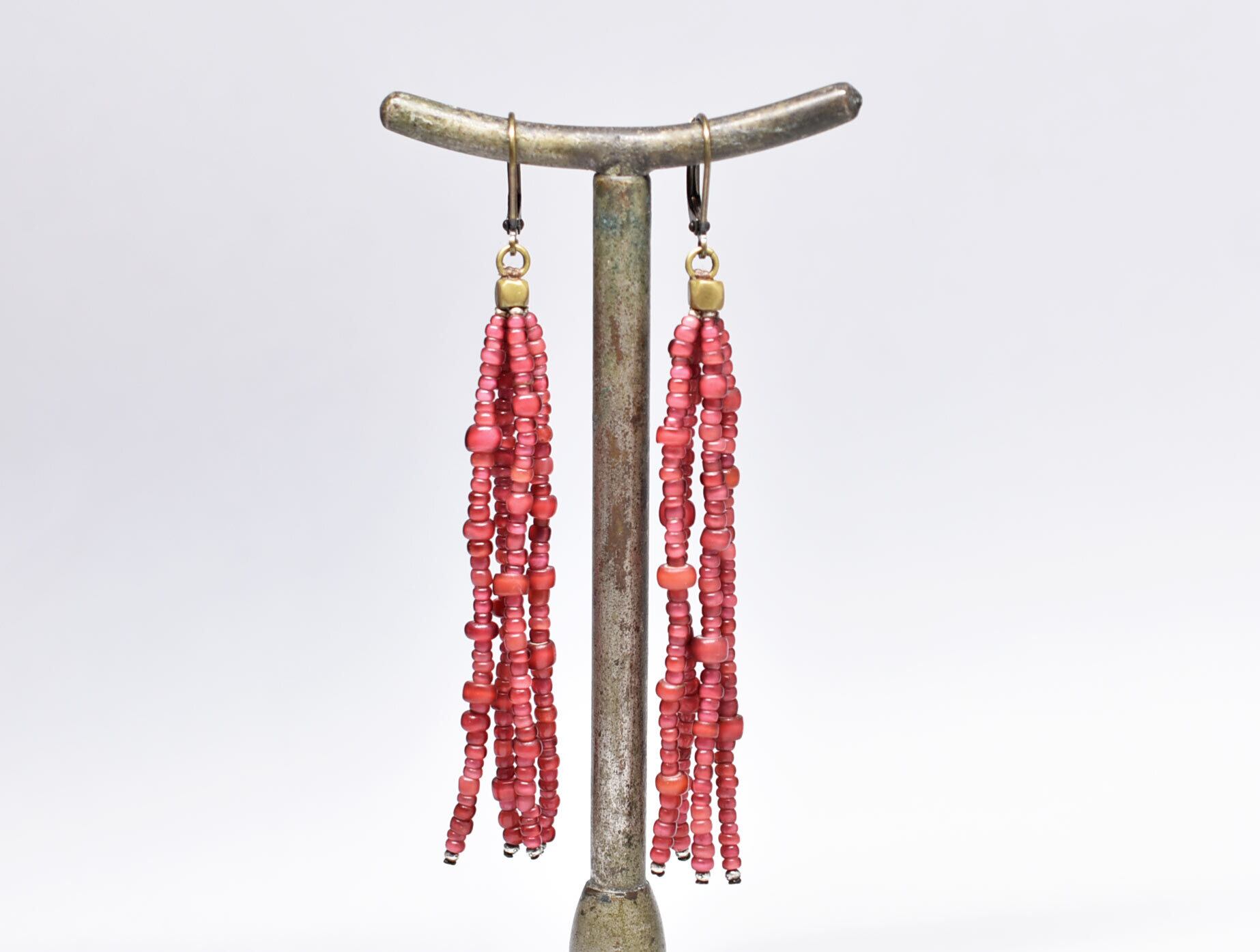 渋いピンク色のビーズはホワイトハーツと呼ばれるアンティークビーズです。芯(ハート)部分が白いことからこう呼ばれています。こちらは19~20世紀頃のベネチア産のビーズです。特にこちらは金で赤色を発色させているため、金赤ホワイトハーツと呼ばれる希少なビーズです。