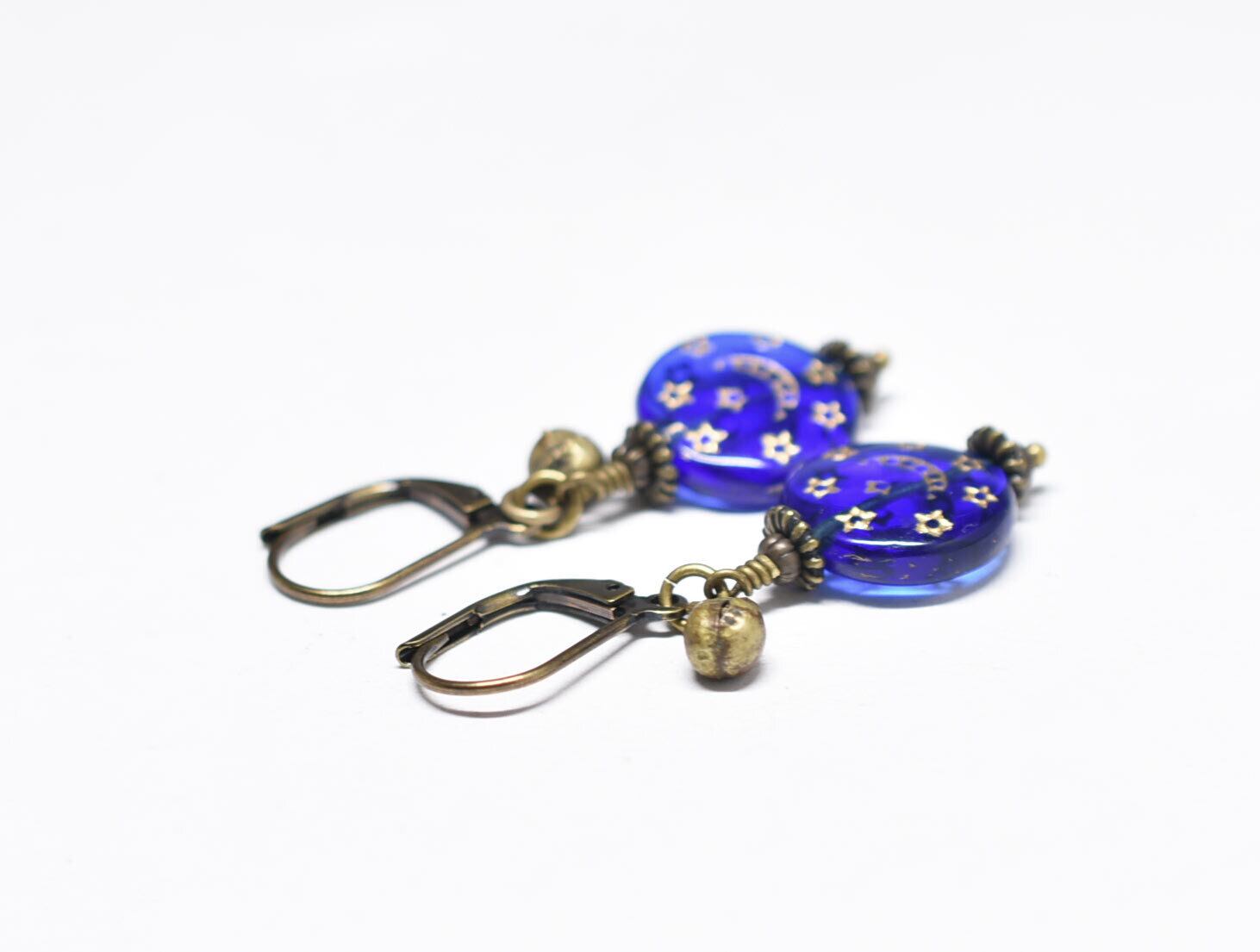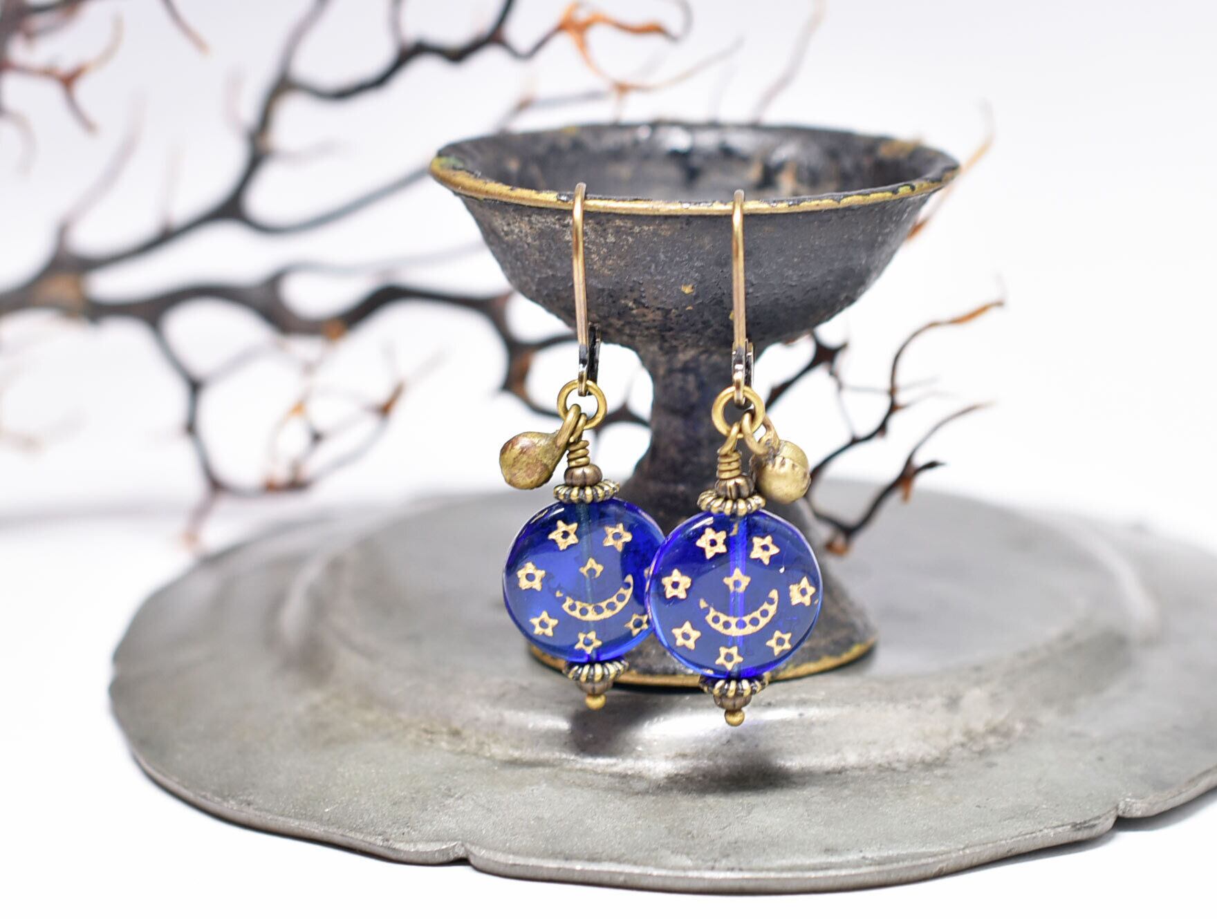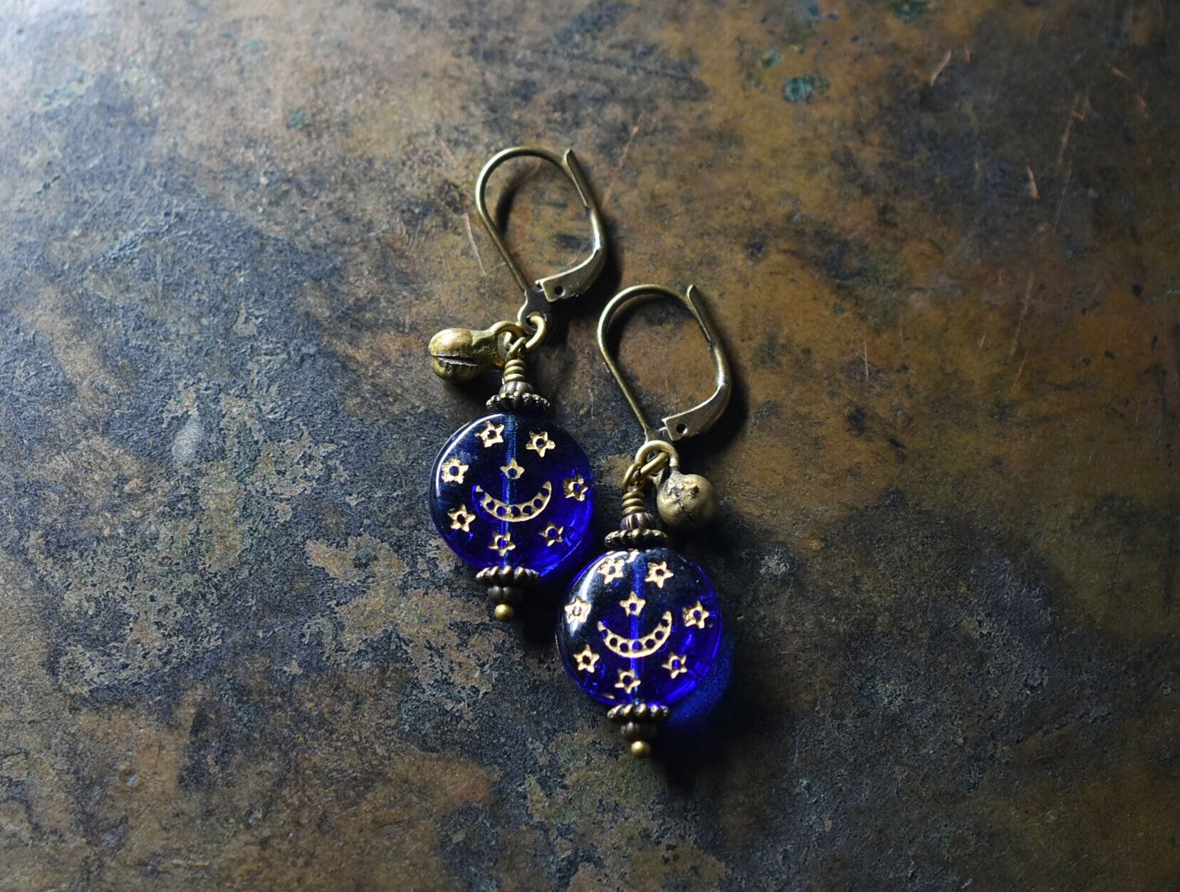 月と星の模様が施された聖者のビーズと、小さな鈴を繋いだピアスです。