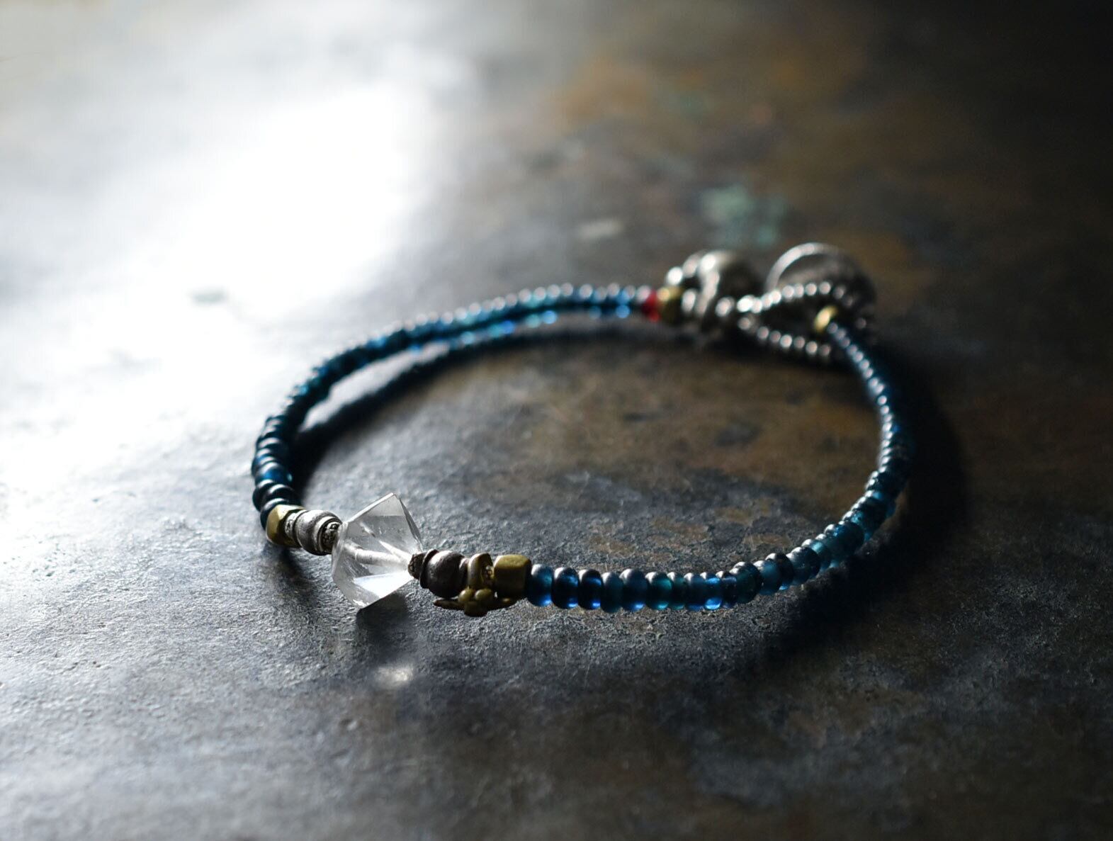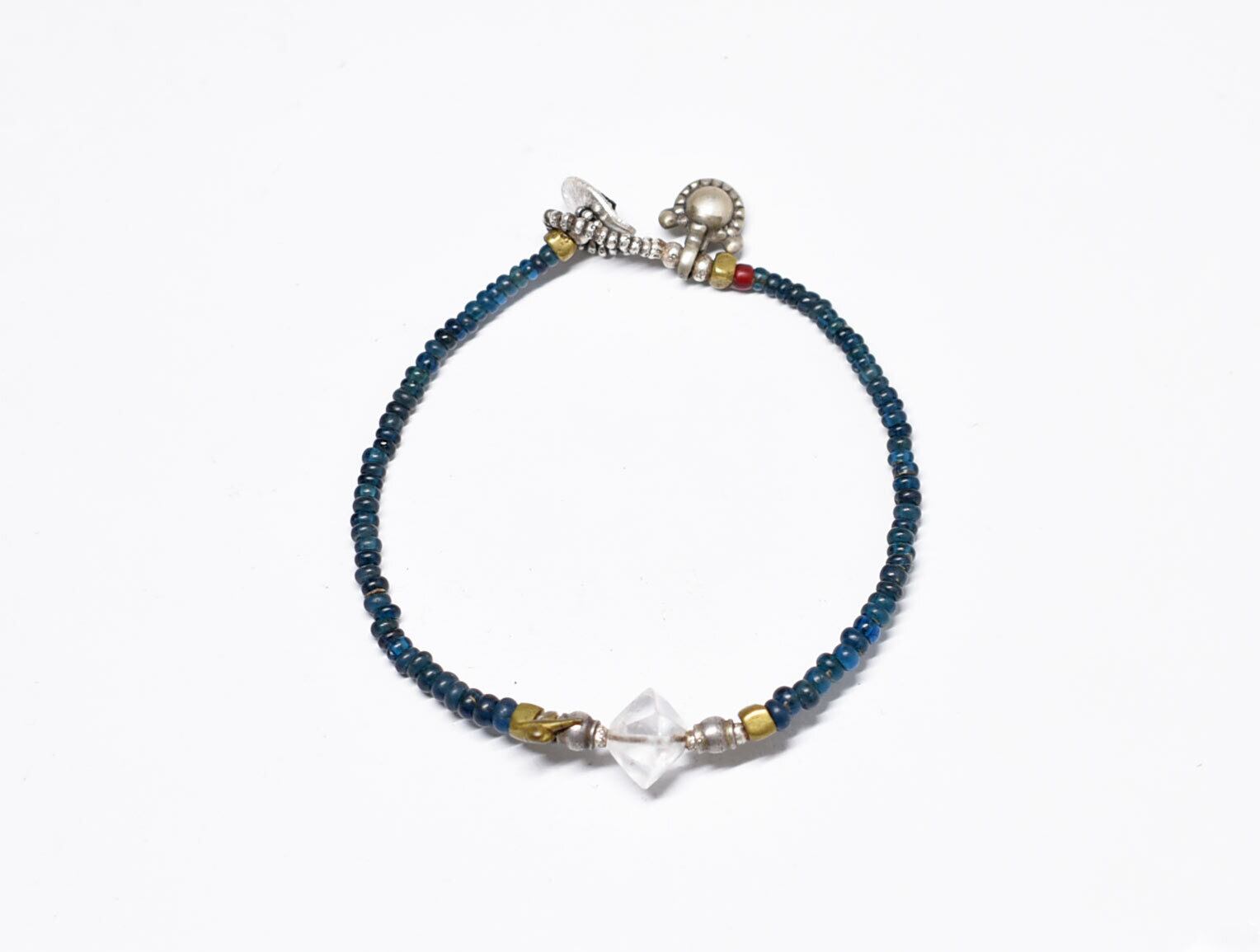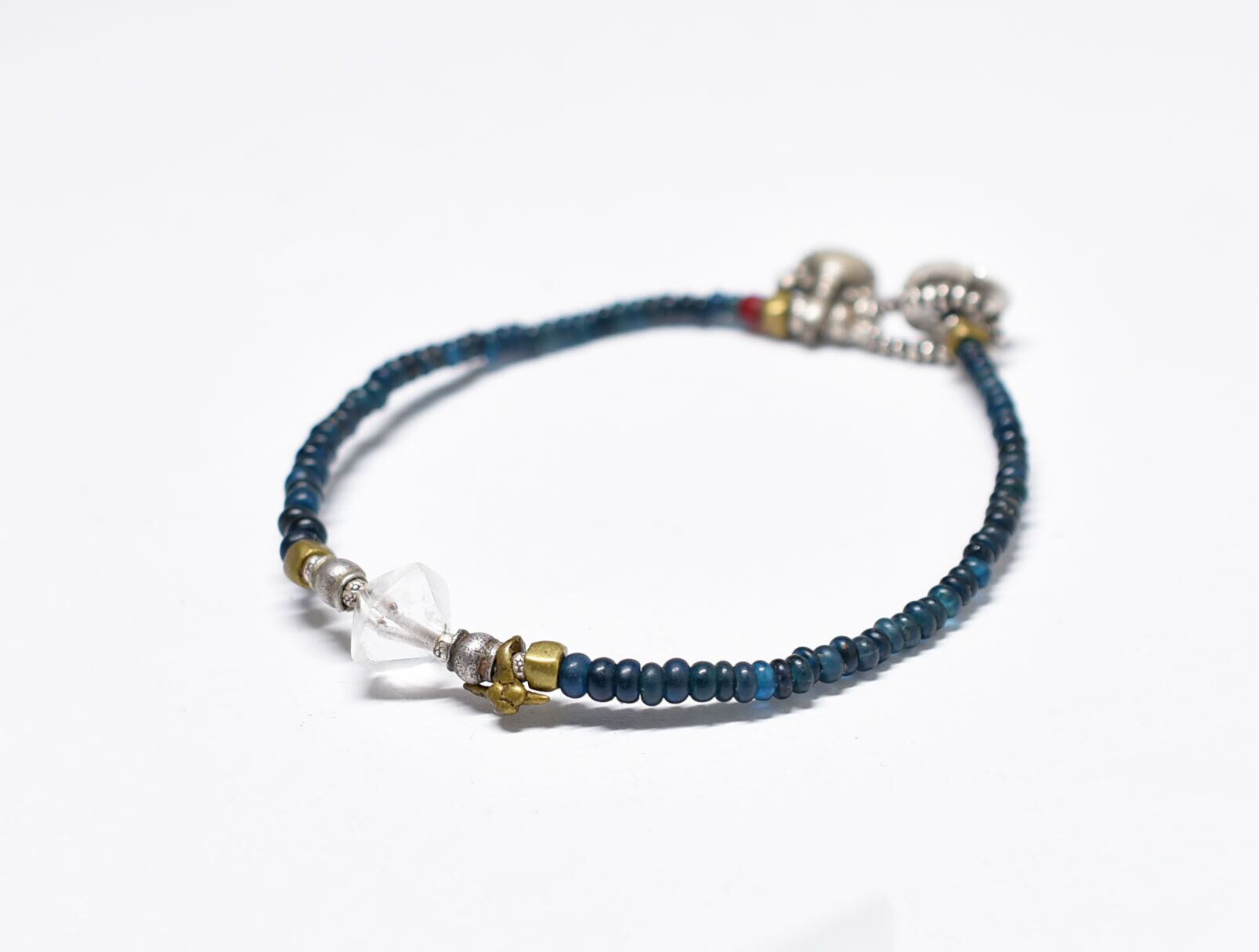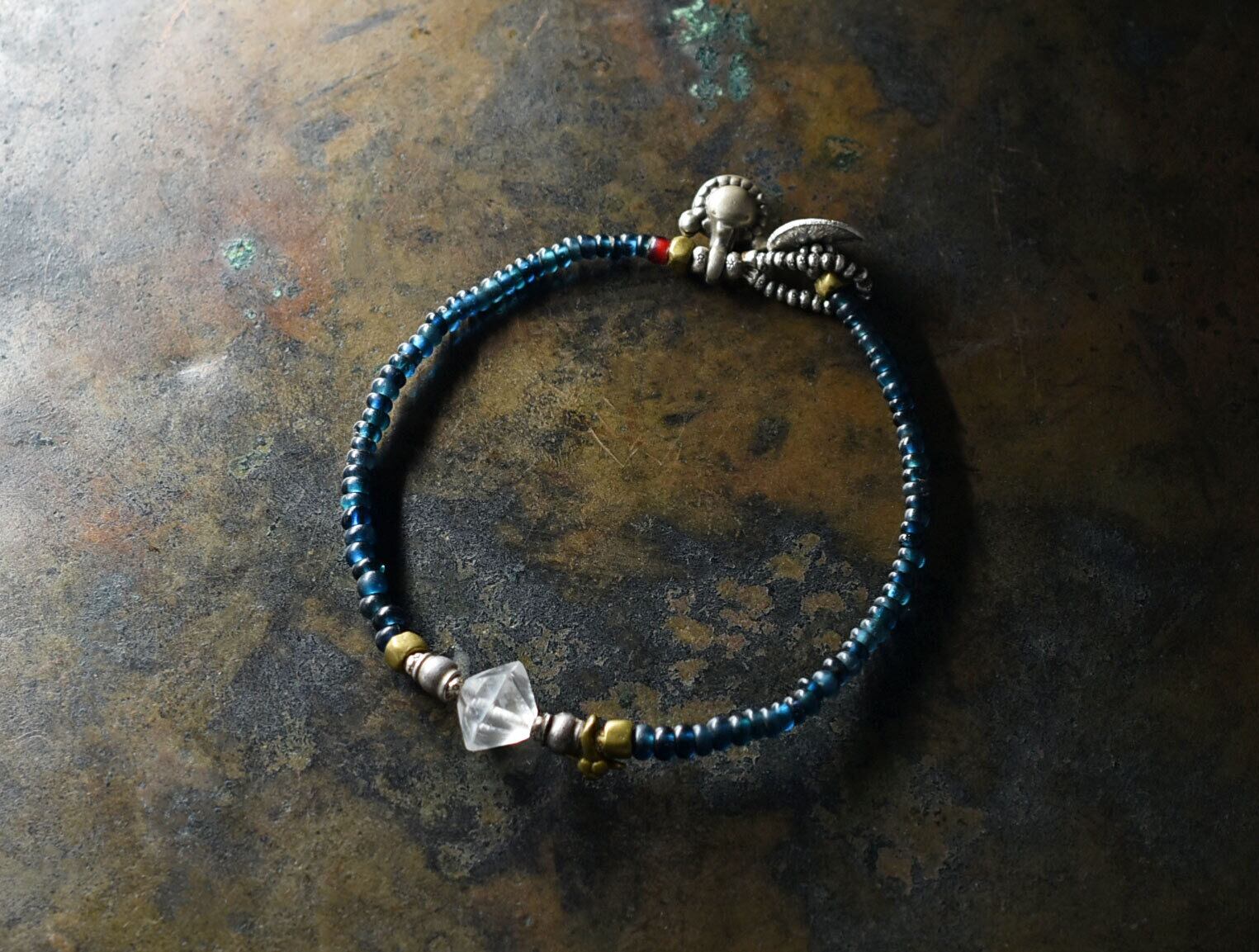 インディゴブルーmixアンティークビーズと算盤型古代水晶、oldインドシルバーチャーム、oldチンシルバー&オリッサブラスを繋いだ華奢なブレスです。