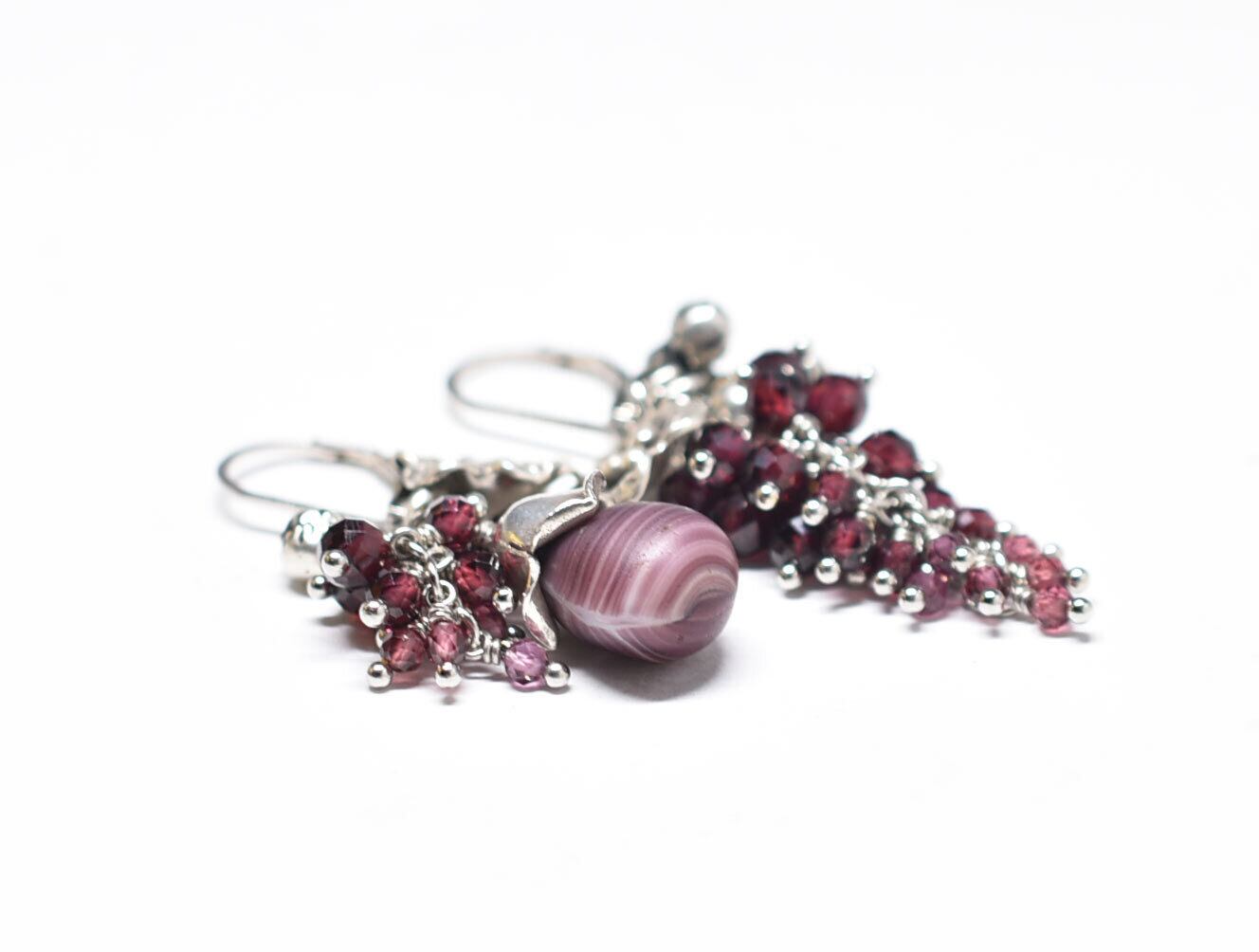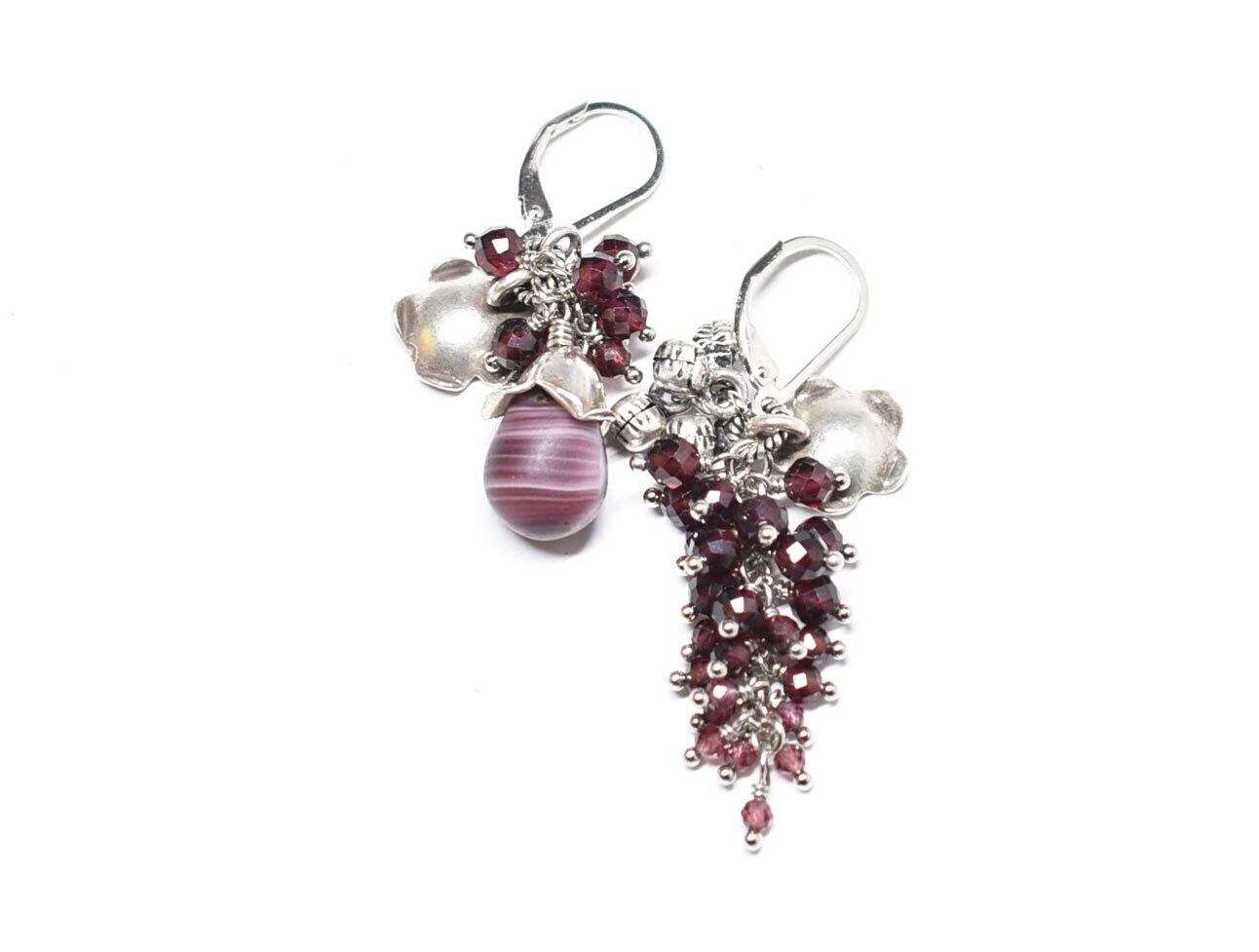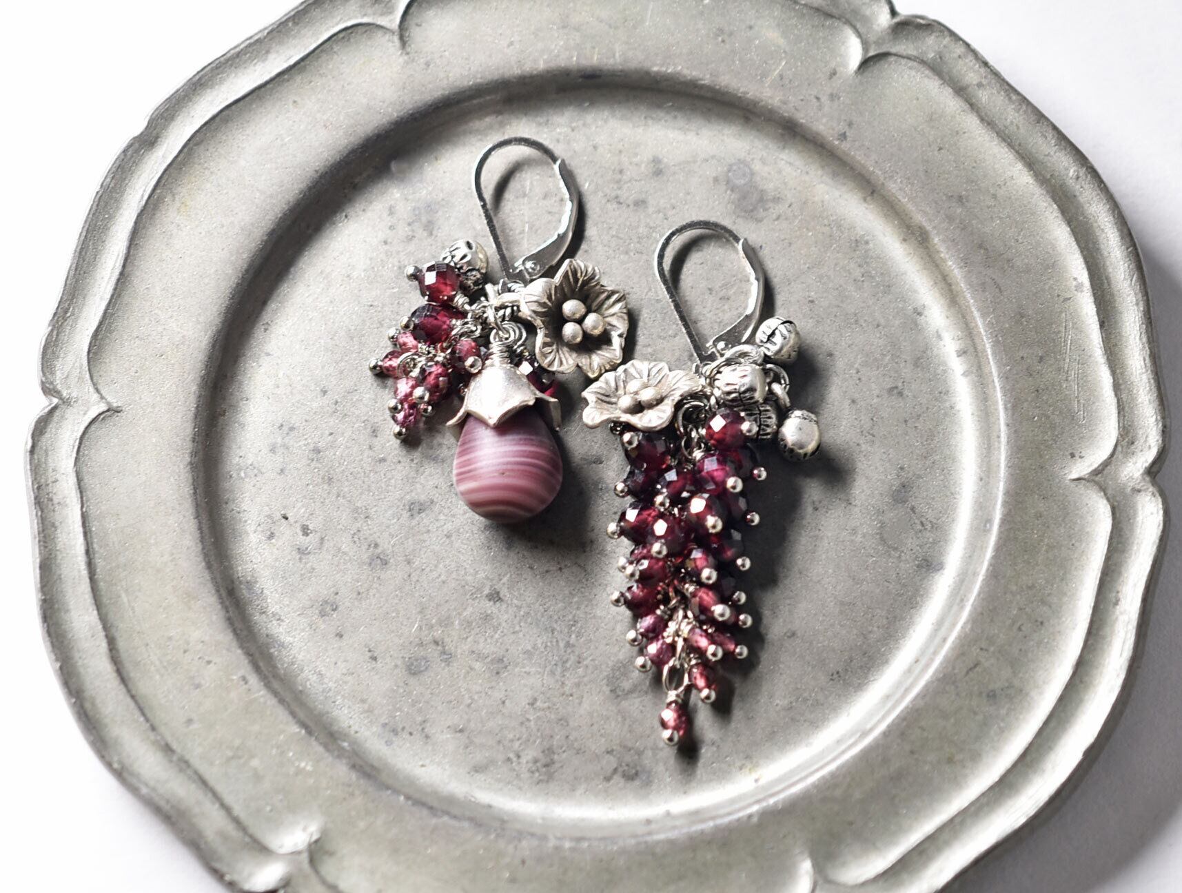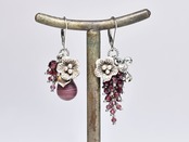 葡萄色マーブルウエディングビーズとたわわなガーネット、お花カレンシルバーと小さな鈴のアンシメトリーピアス