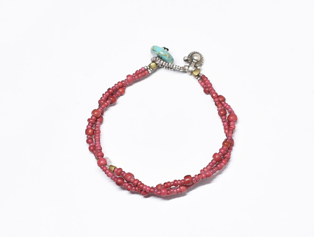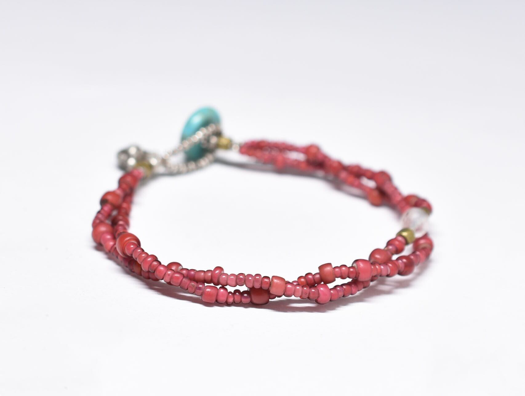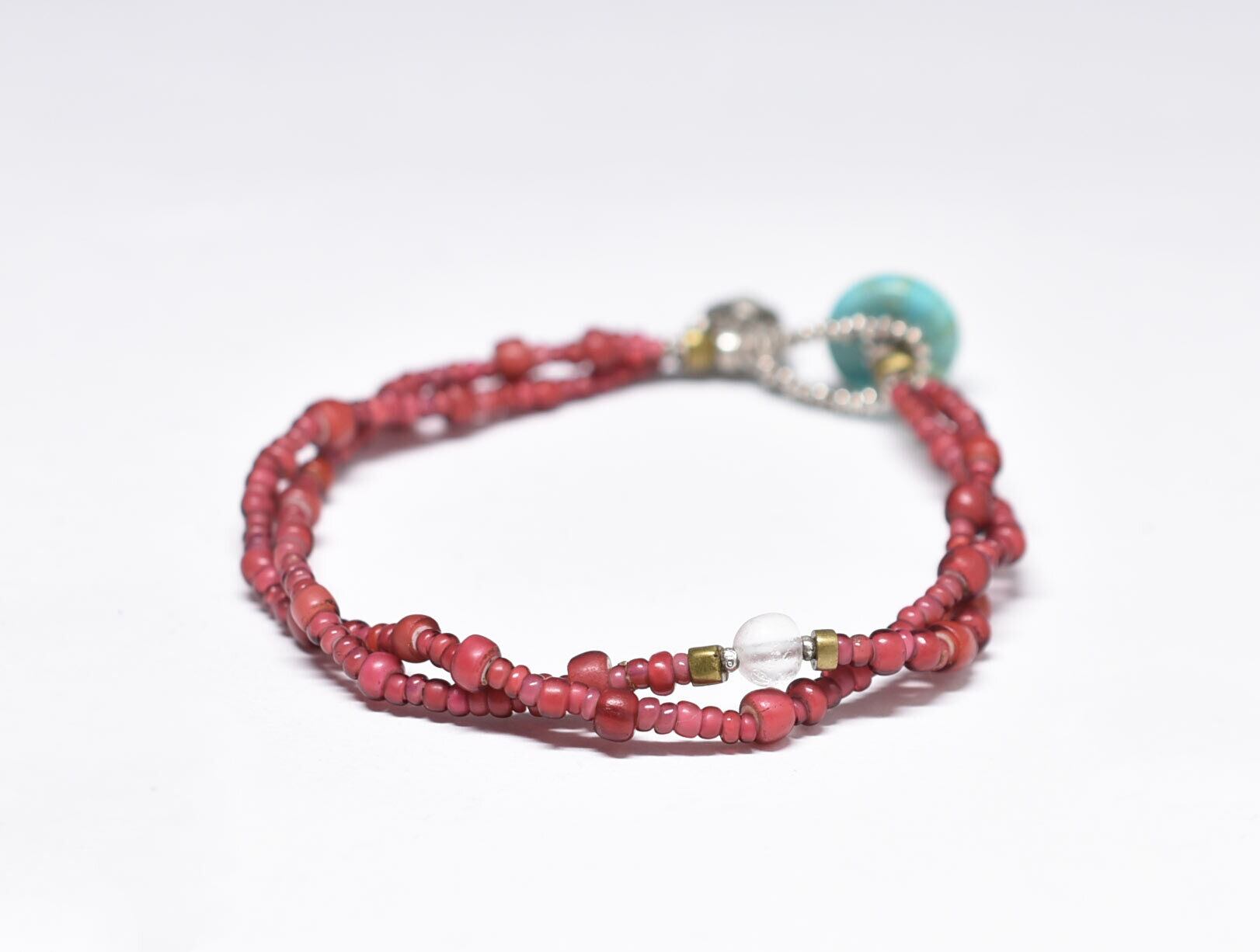 渋い赤色のビーズはホワイトハーツと呼ばれるアンティークビーズです。芯(ハート)部分が白いことからこう呼ばれています。こちらは19~20世紀頃のヴェネチア産のビーズです。渋い赤色は金で赤色を発色させているため、このようなお色をしています、