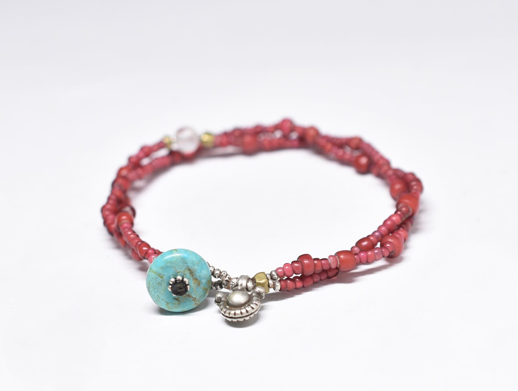 素材:ガラス、カレンシルバー、古代水晶、oldオリッサブラス、oldインドシルバー、ターコイズ、ロウビキ紐