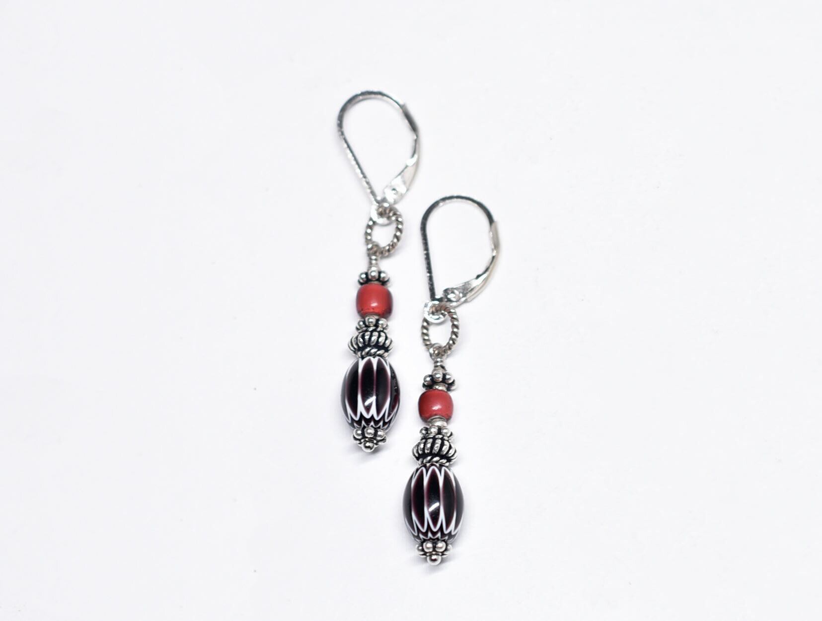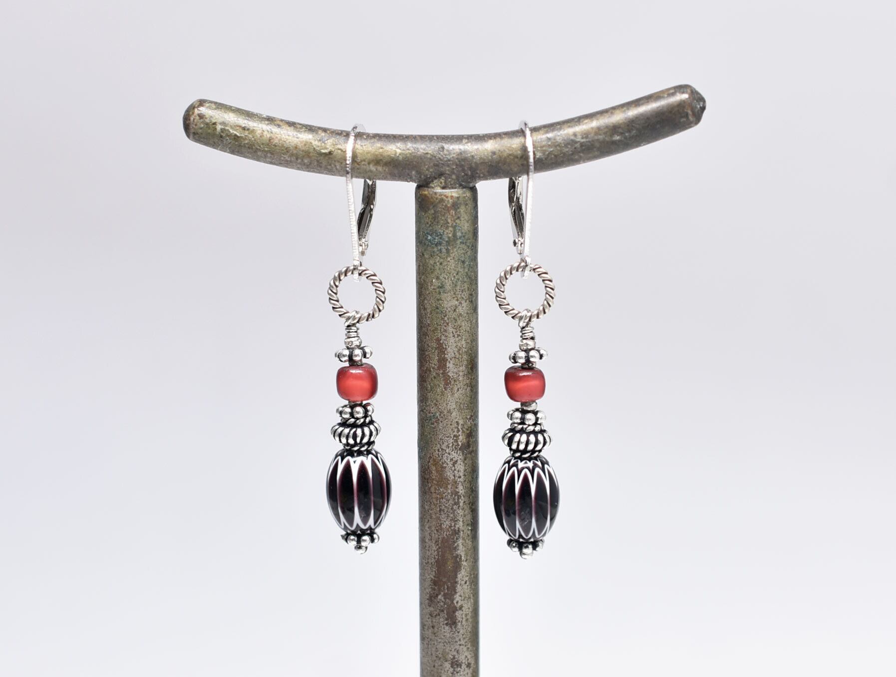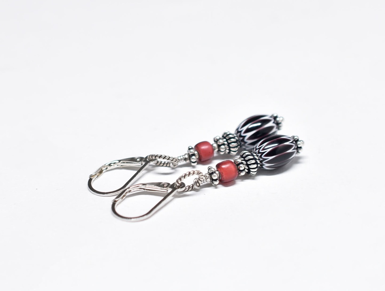 ブラックシェブロンビーズと金赤ホワイトハーツ、シルバービーズのピアス(ショート)