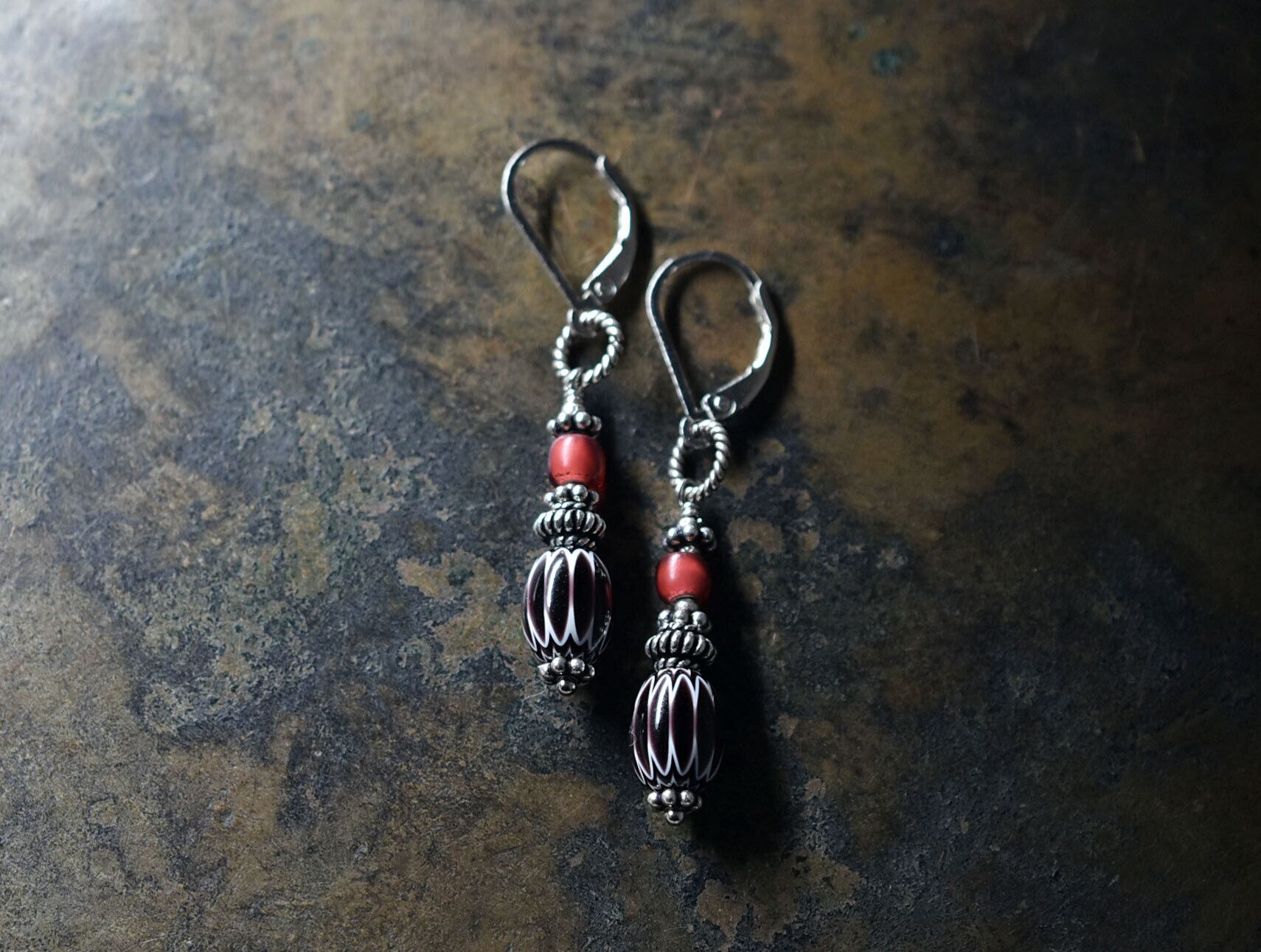 ブラックシェブロンビーズと金赤ホワイトハーツ、シルバービーズを繋いだピアスです。