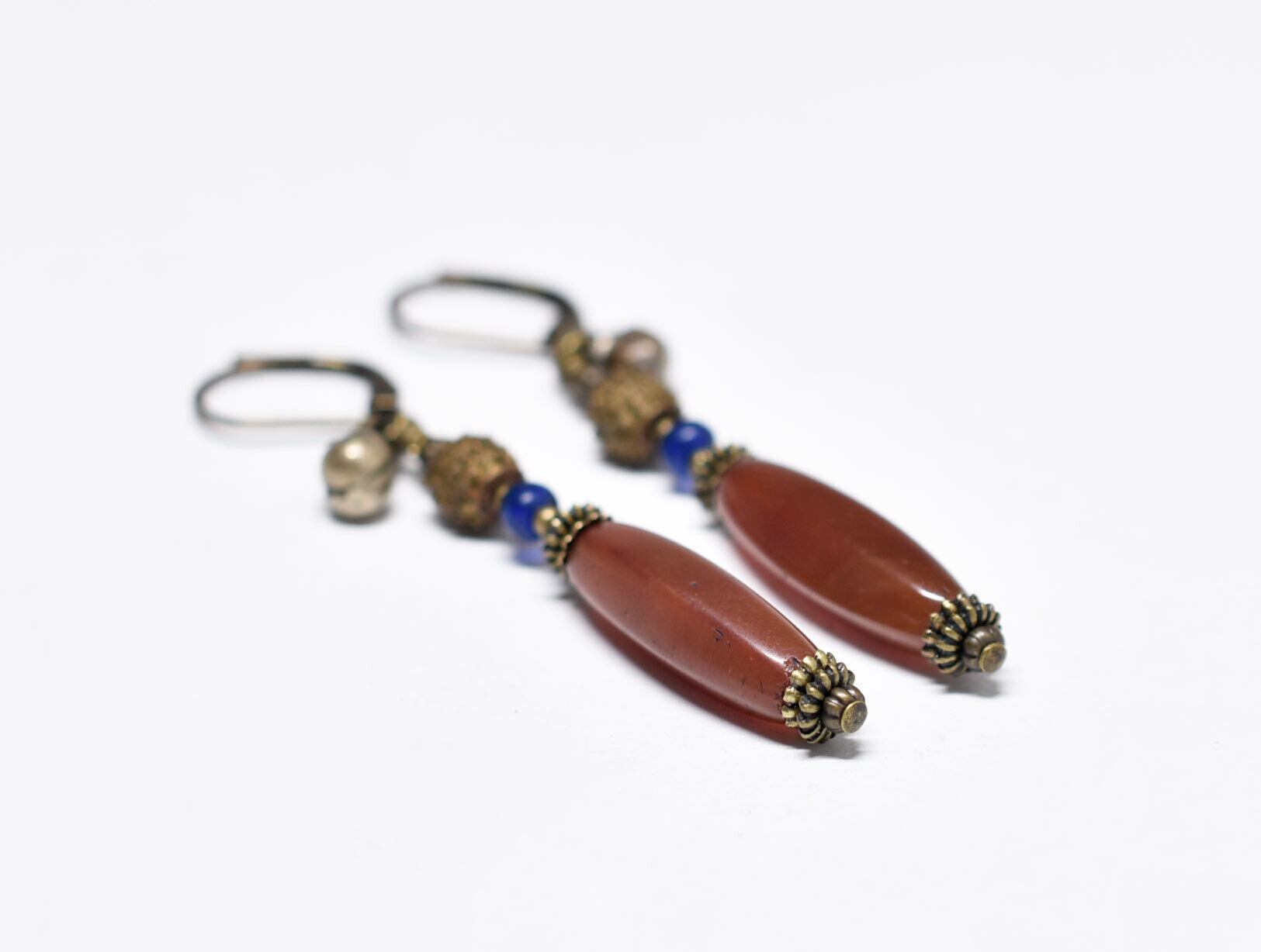 枯葉色アンティークボヘミアビーズとベニン族のツブツブビーズ、ブルービーズ、民族鈴を繋いだピアスです。