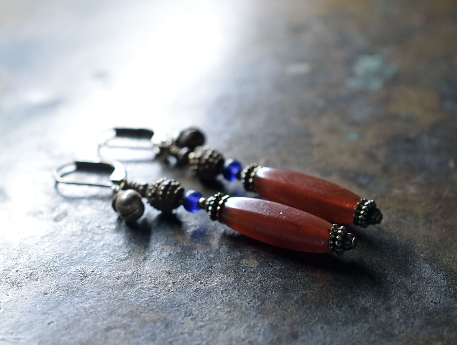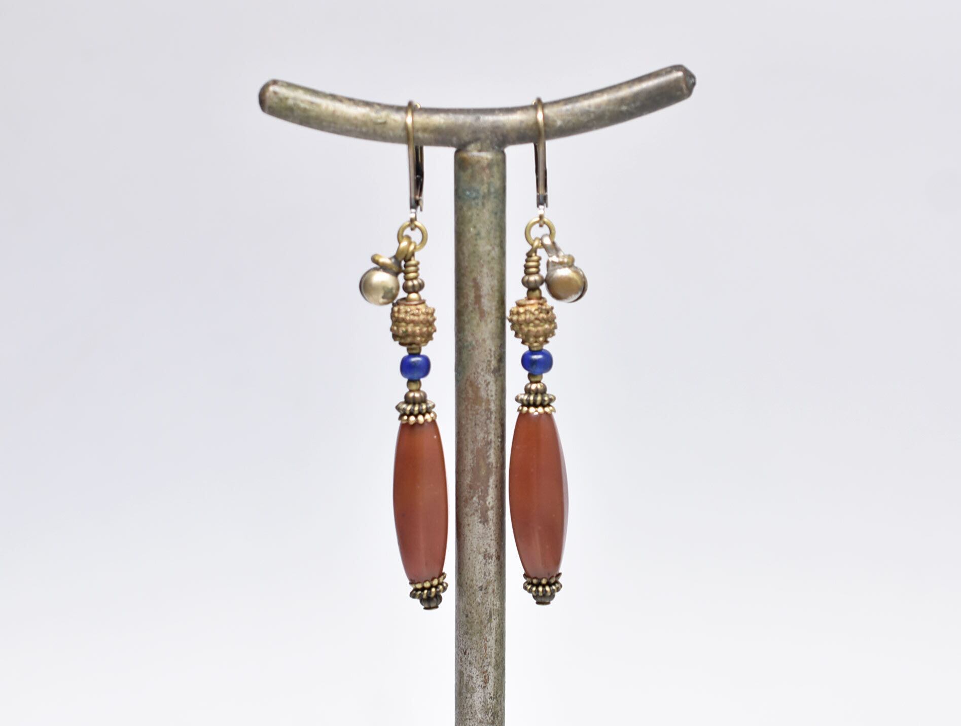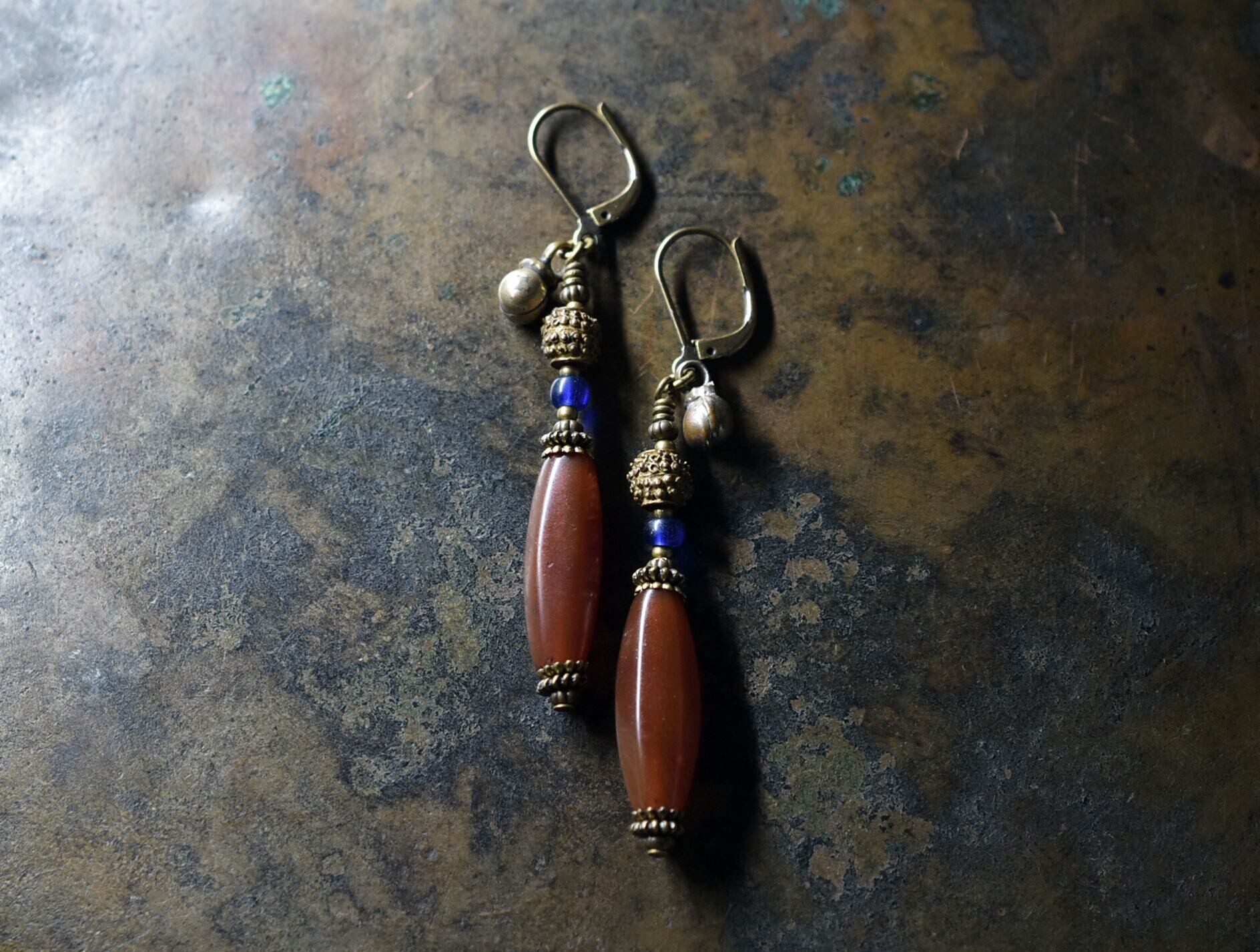 枯葉色アンティークボヘミアビーズとベニン族のツブツブビーズ、ブルービーズ、民族鈴のピアス