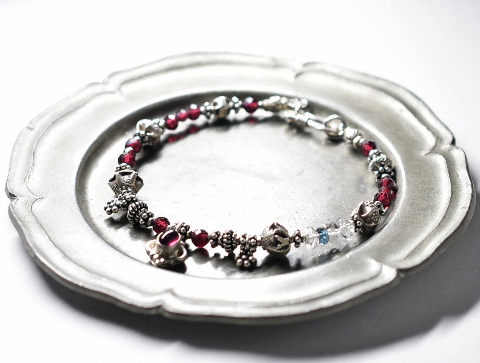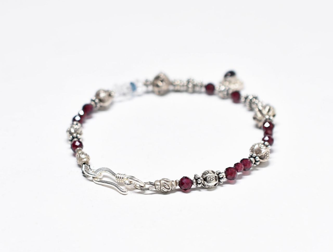 シルバー装飾ガーネットとお花インドシルバー、ハーキマーダイヤモンド、ロンドンブルートパーズ、カレンシルバー、ガーネットを繋いだブレスです。