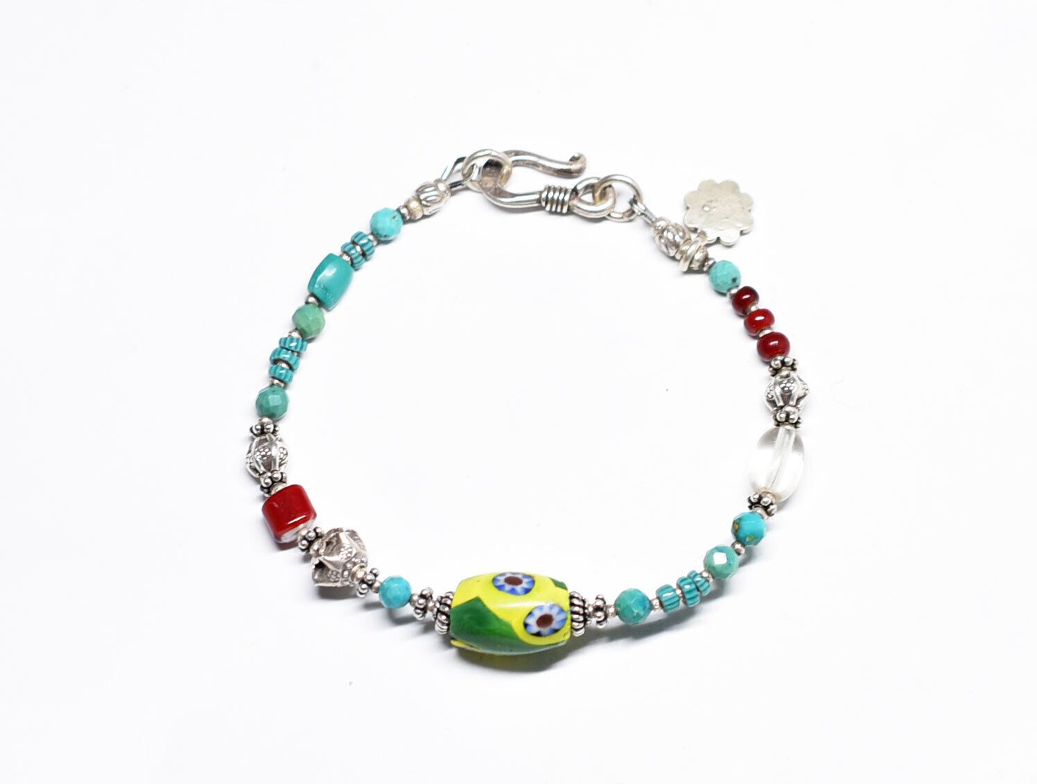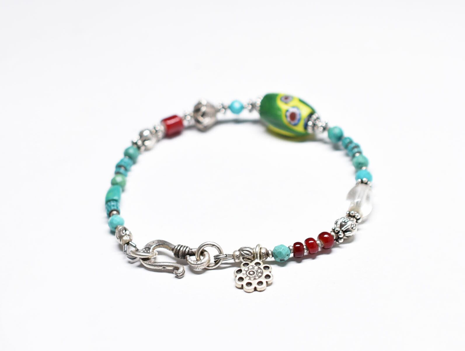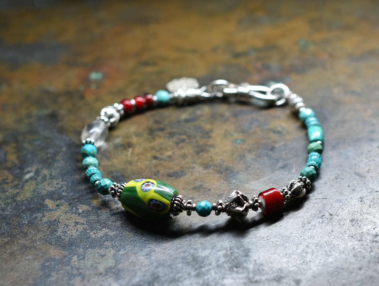 ヴェネチアアンティークミルフィオリと濃赤ホワイトハーツ、ターコイズブルーシェブロンビーズ、アンティークボヘミアビーズ、ターコイズ、カレンシルバーを繋いだブレスです。