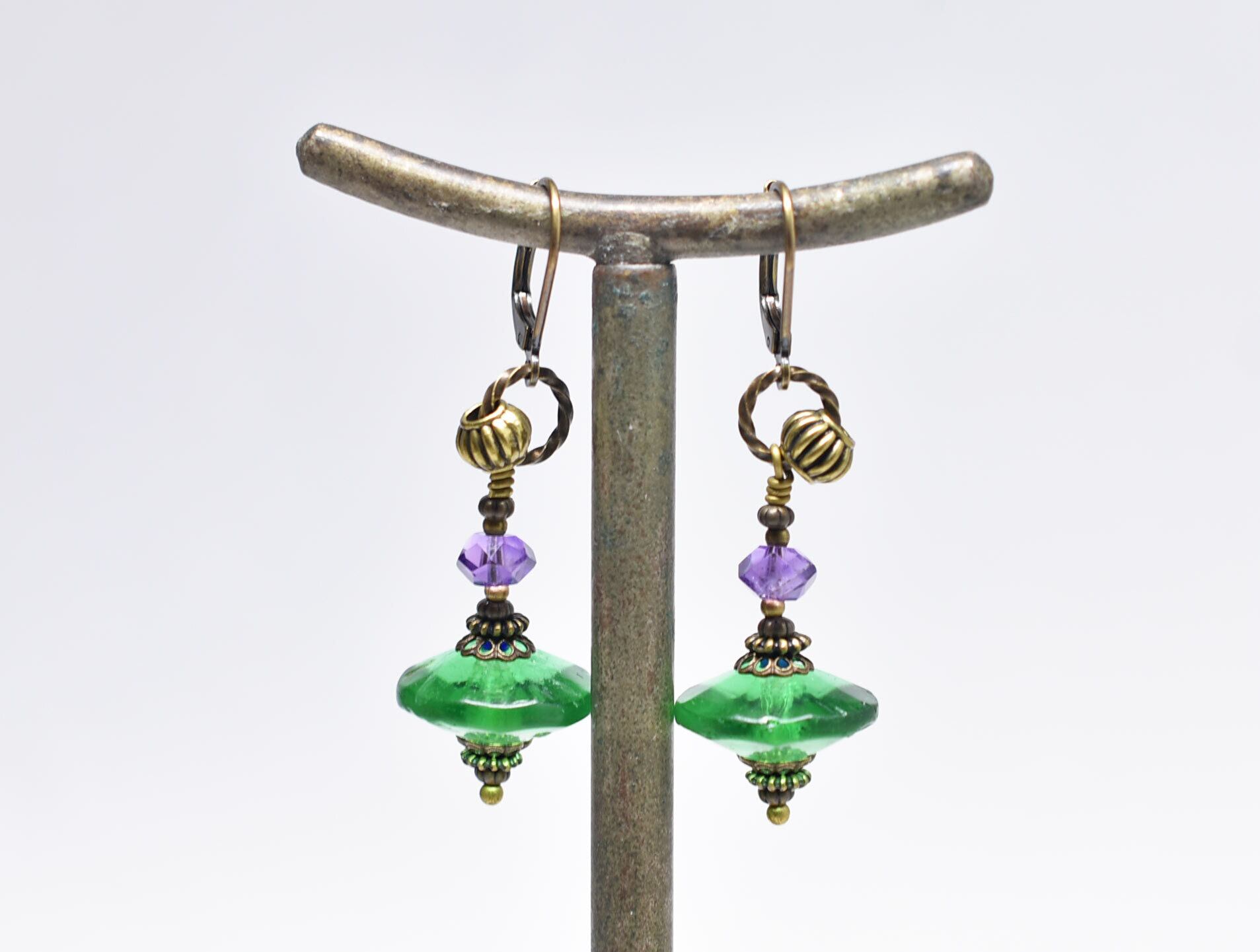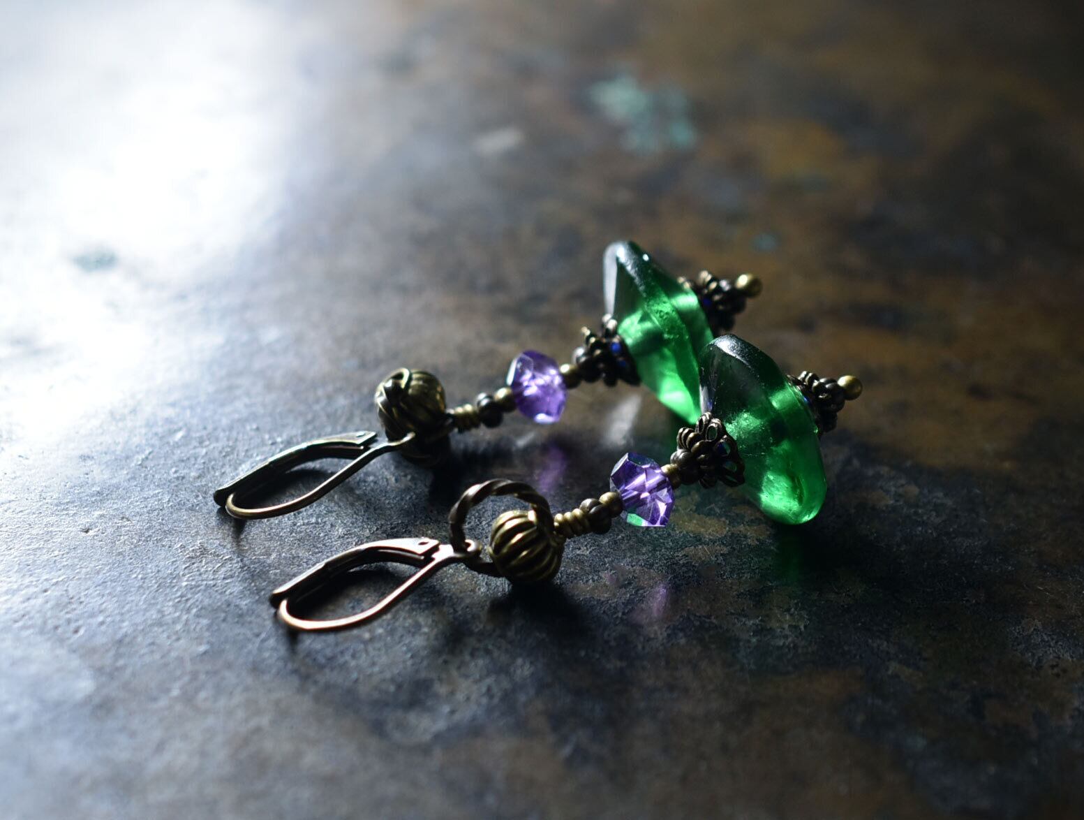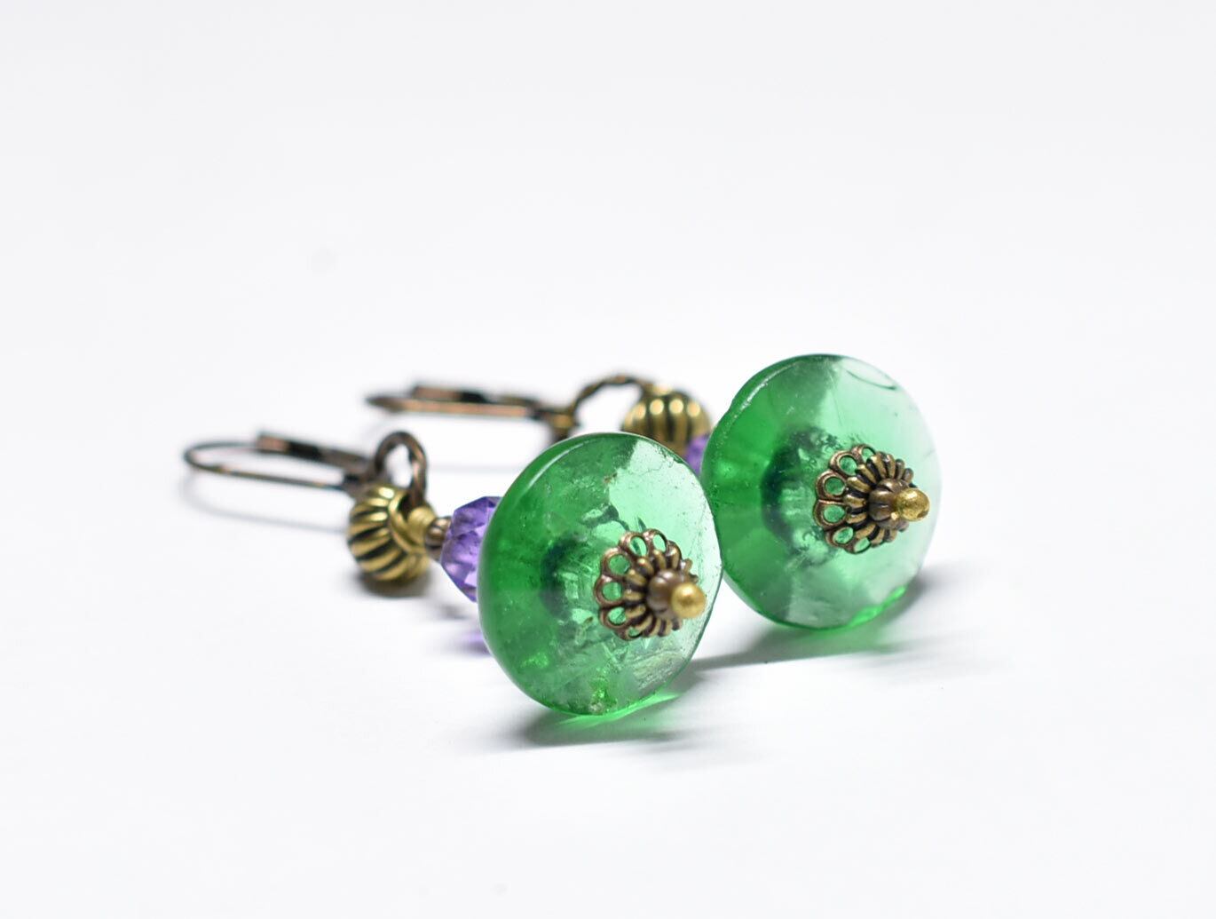 ディスク型アンティークボヘミアビーズと隠しブルービーズ、アメジストを繋いピアスです。