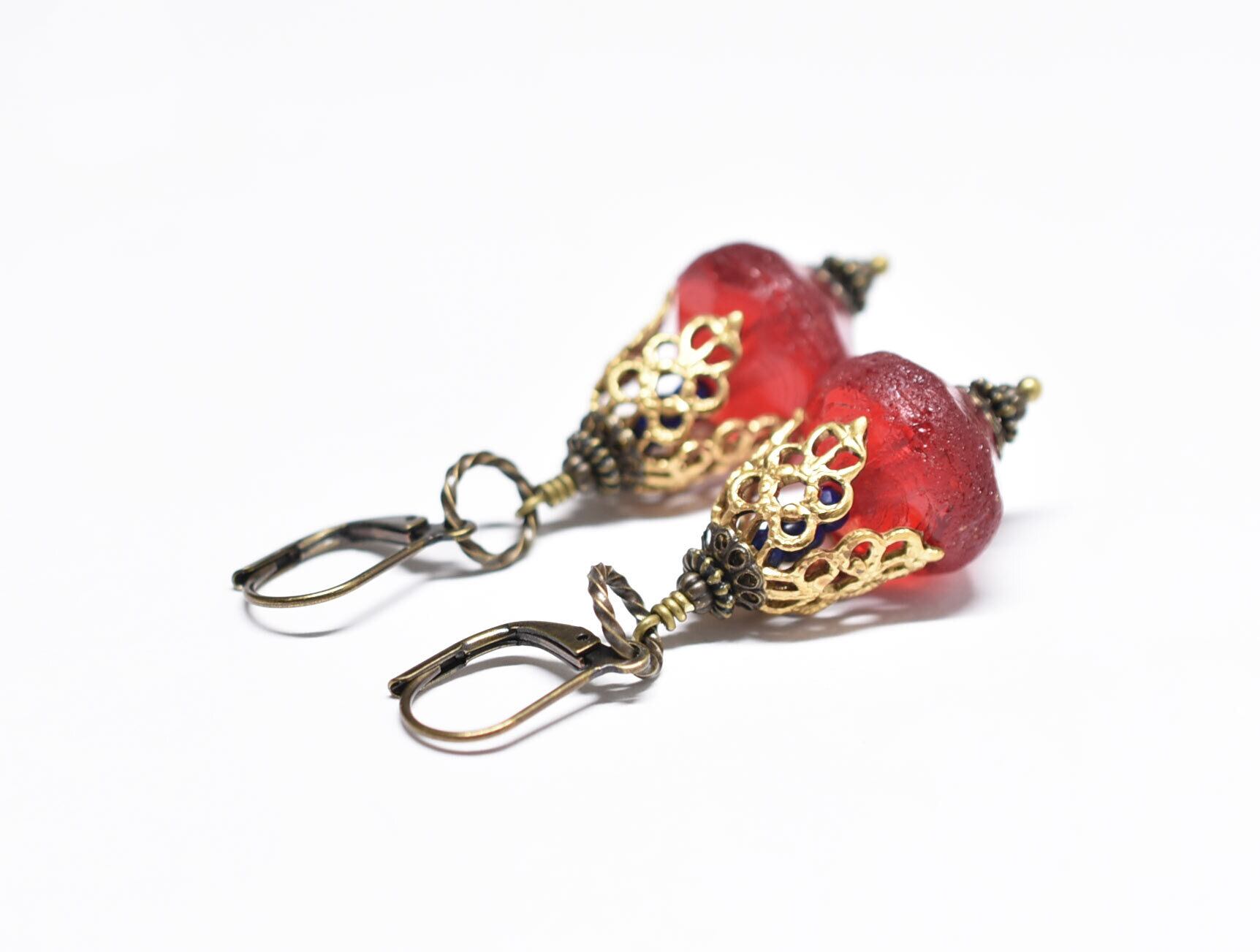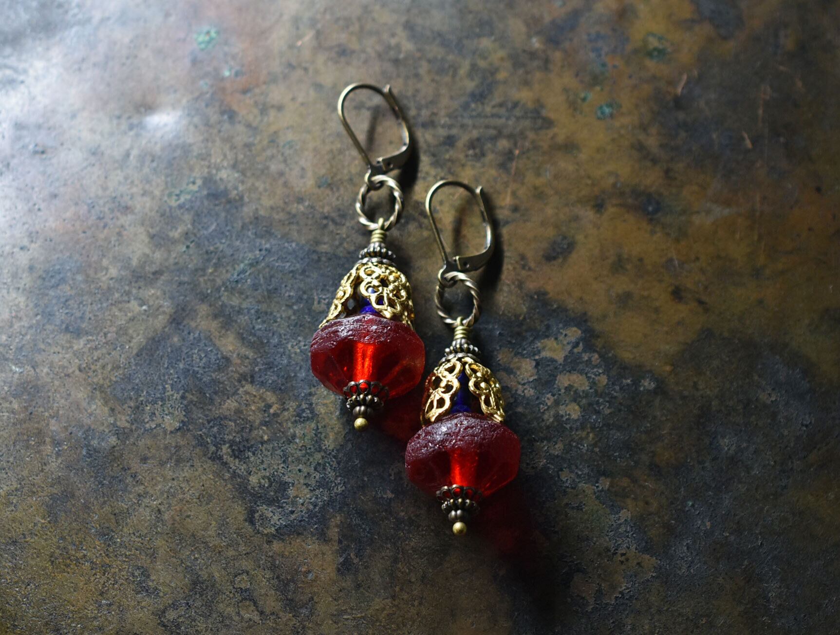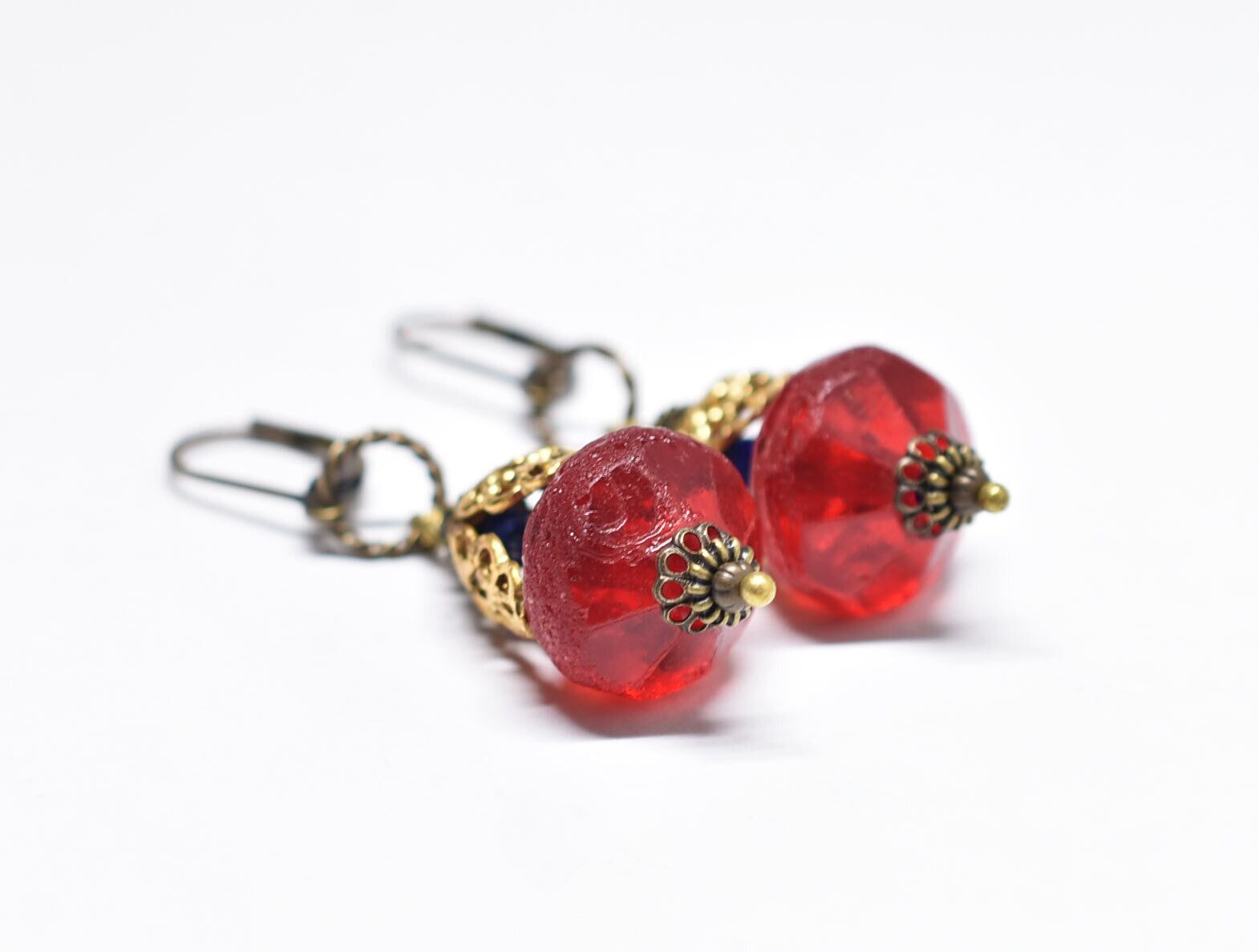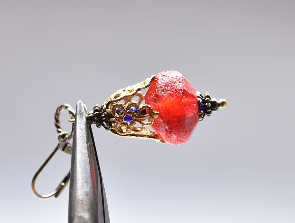 真っ赤な算盤型アンティークボヘミアビーズと繊細装飾ブラスキャップ、ラピスとブルービーズのピアス