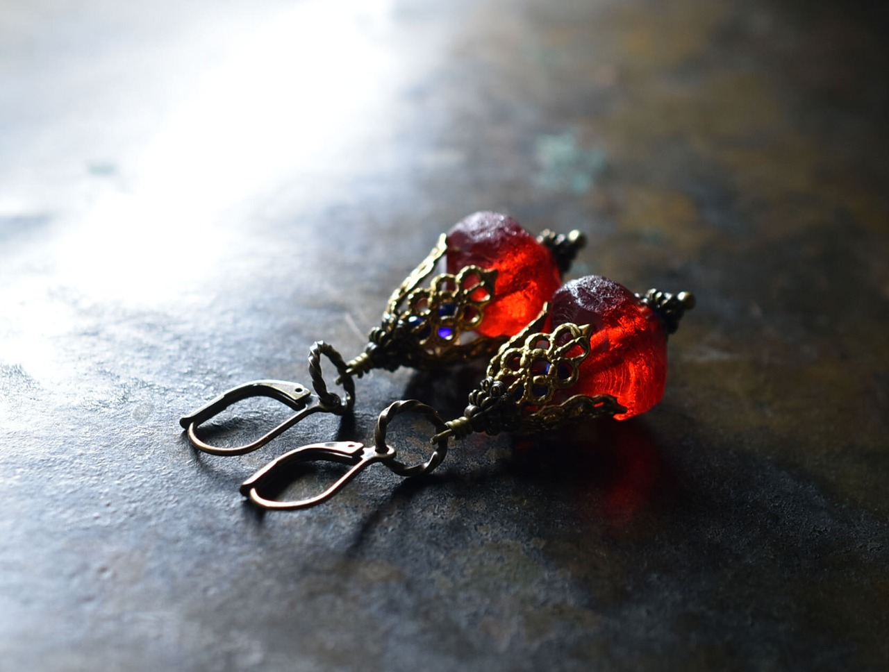 真っ赤な算盤型アンティークボヘミアビーズと繊細装飾ブラスキャップ、ラピスとブルービーズを繋いだボリュームのあるピアスです。