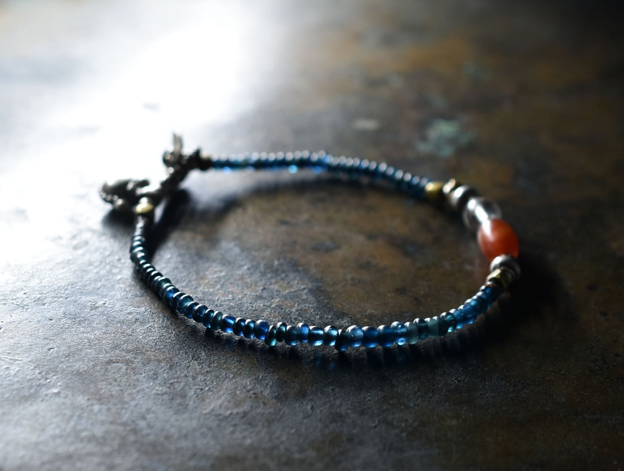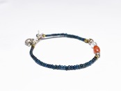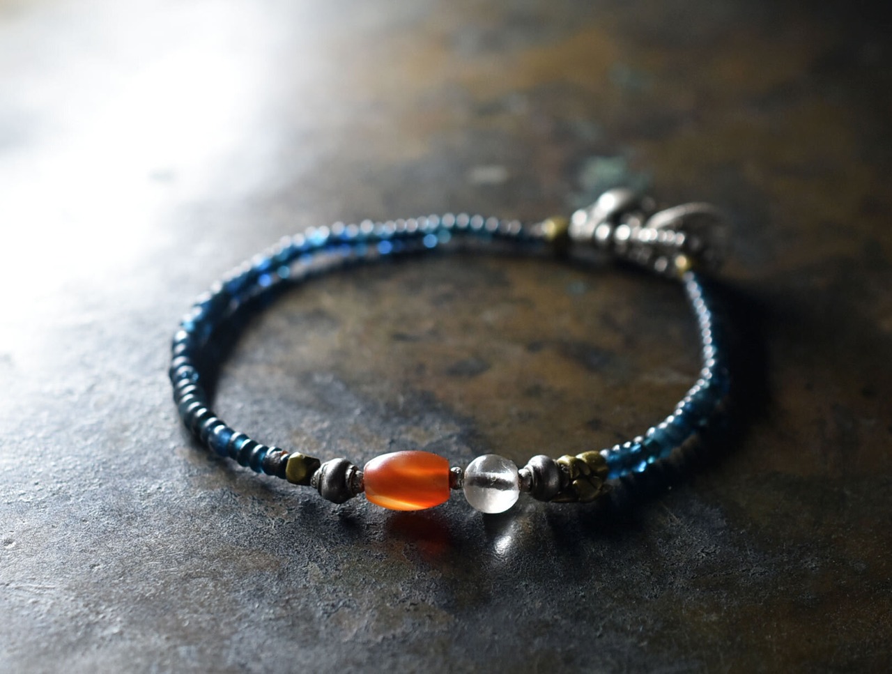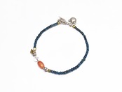 インディゴブルーmixアンティークビーズとシャン族カーネリアン&古代水晶、oldインドシルバーチャーム、oldチンシルバー&オリッサブラスを繋いだ華奢なブレスです。