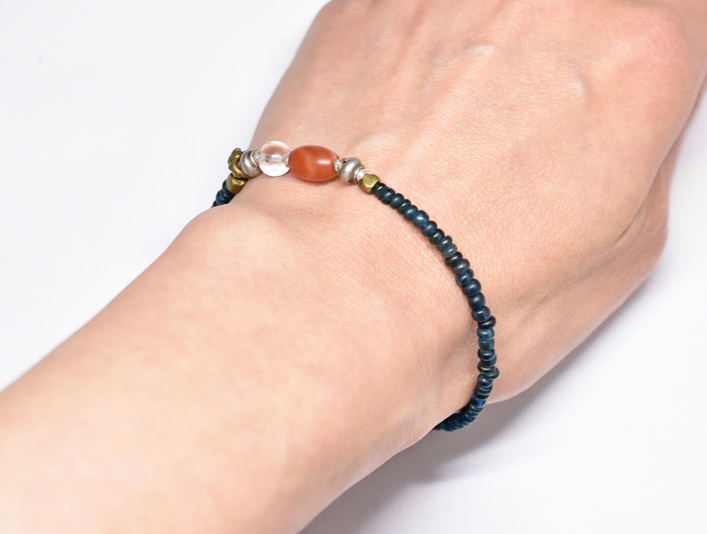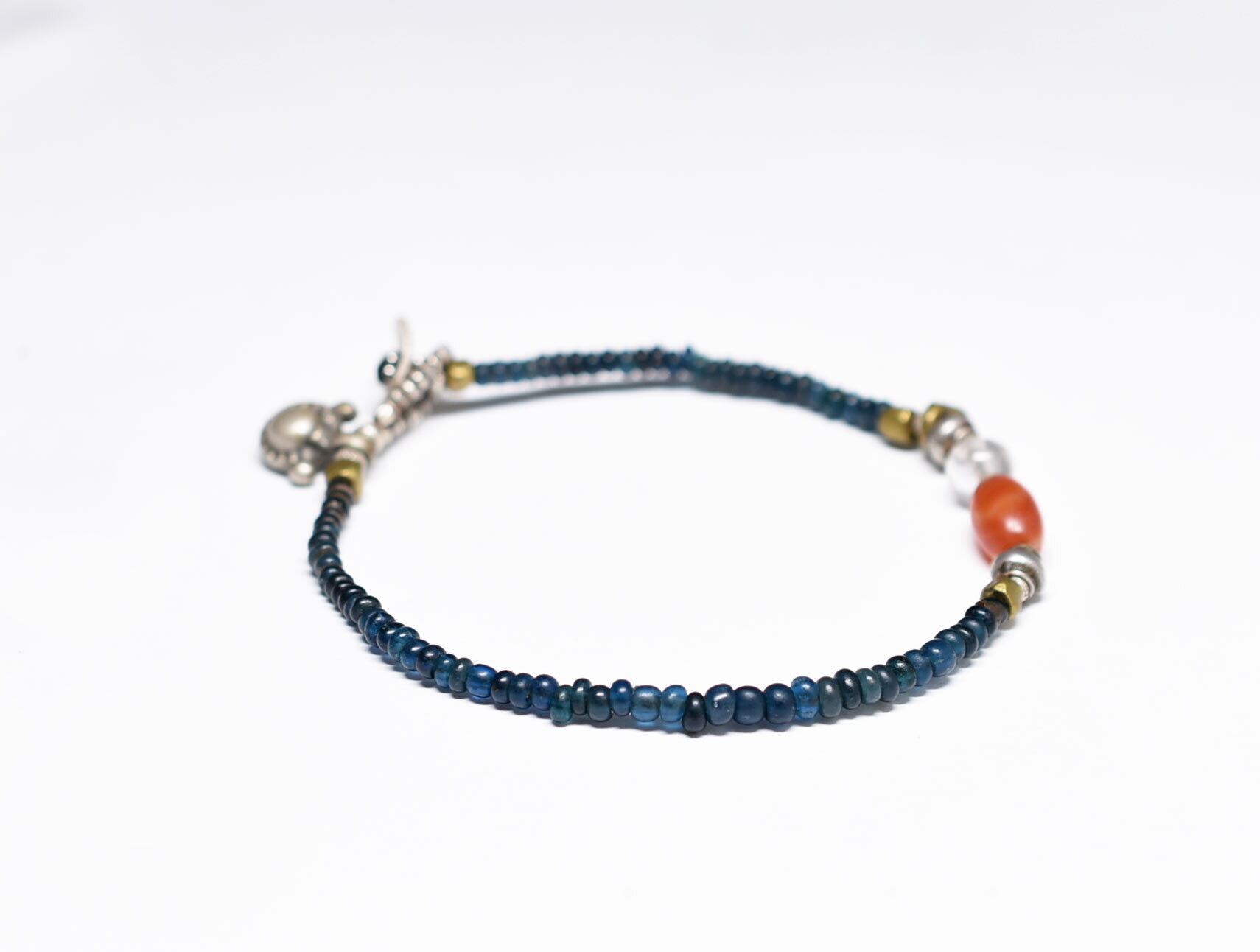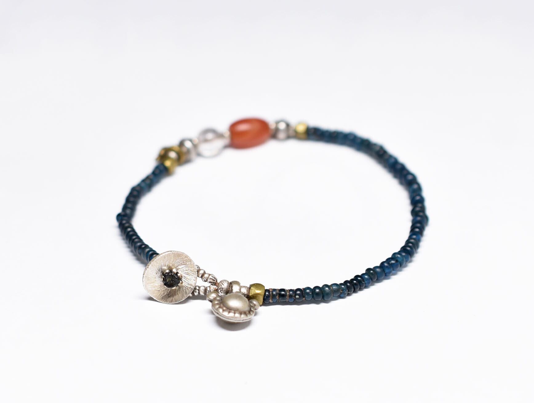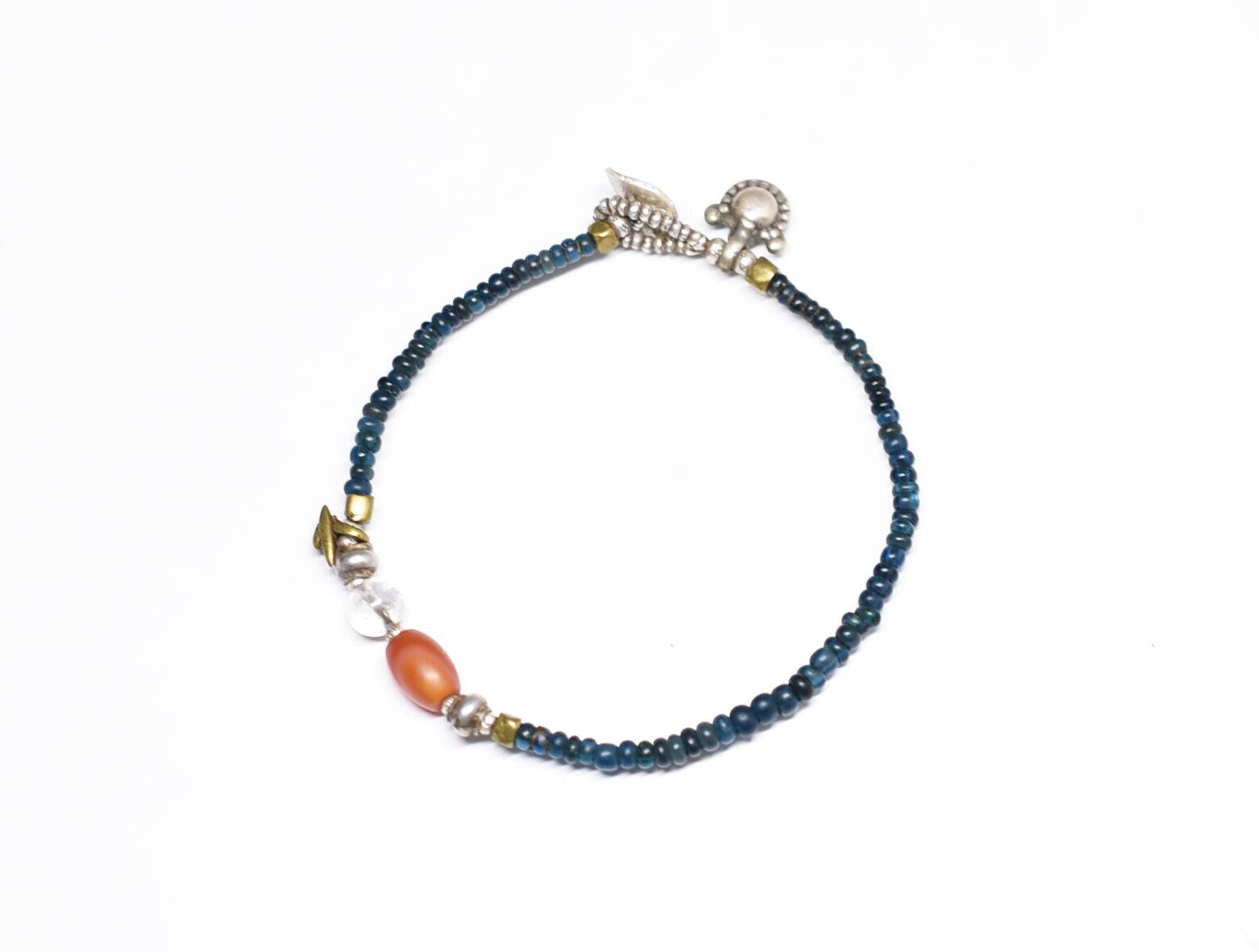 インディゴブルーmixアンティークビーズとシャン族カーネリアン&古代水晶、oldインドシルバーチャーム、oldチンシルバー&オリッサブラスの華奢なブレス
