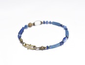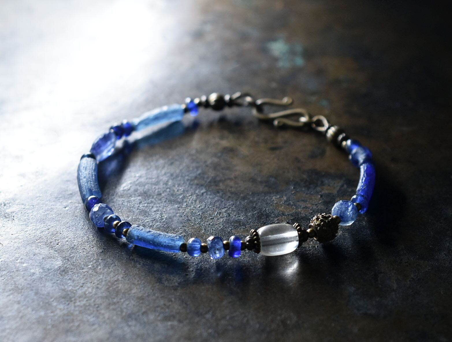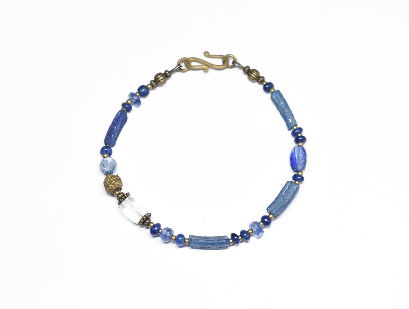ブルーローマングラスとアンティークボヘミアビーズ、つぶつぶブラス、カイヤナイトなどを繋いだブレスです。