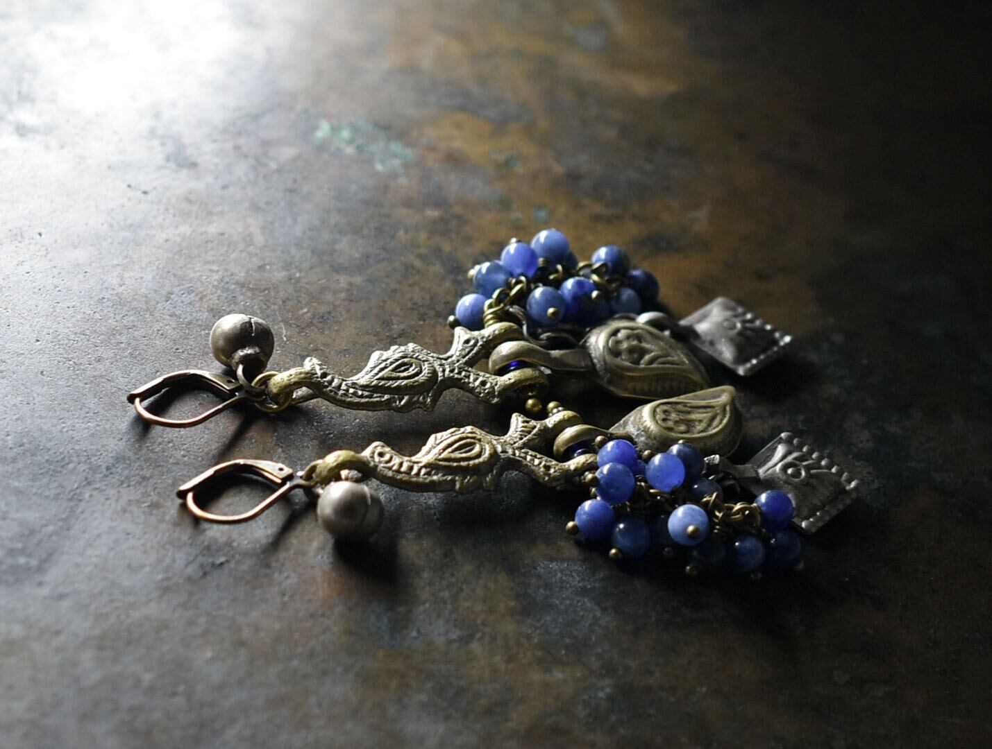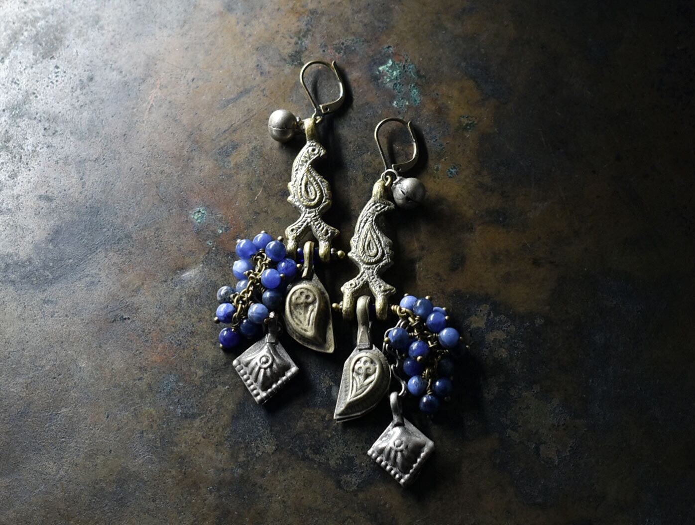 多彩アフガニスタンoldパーツと鈴、たわわなソーダライトを繋いだボリュームのあるピアスです。