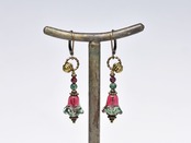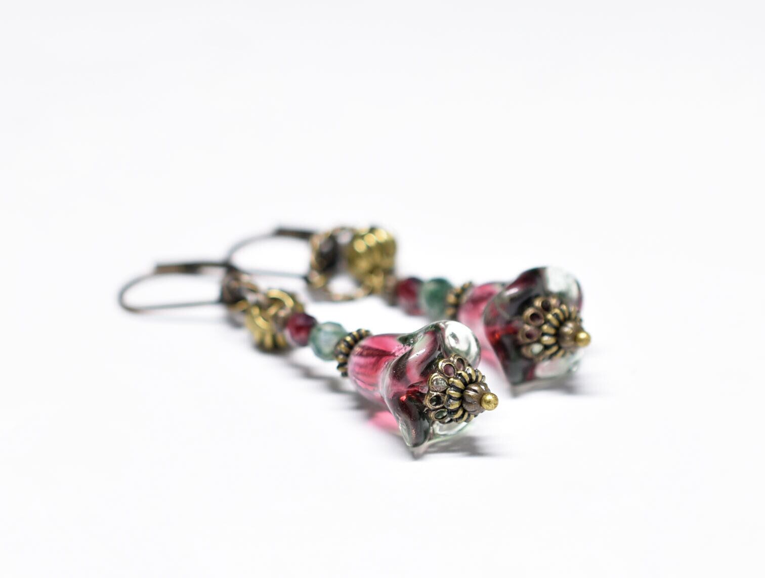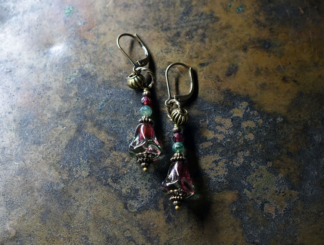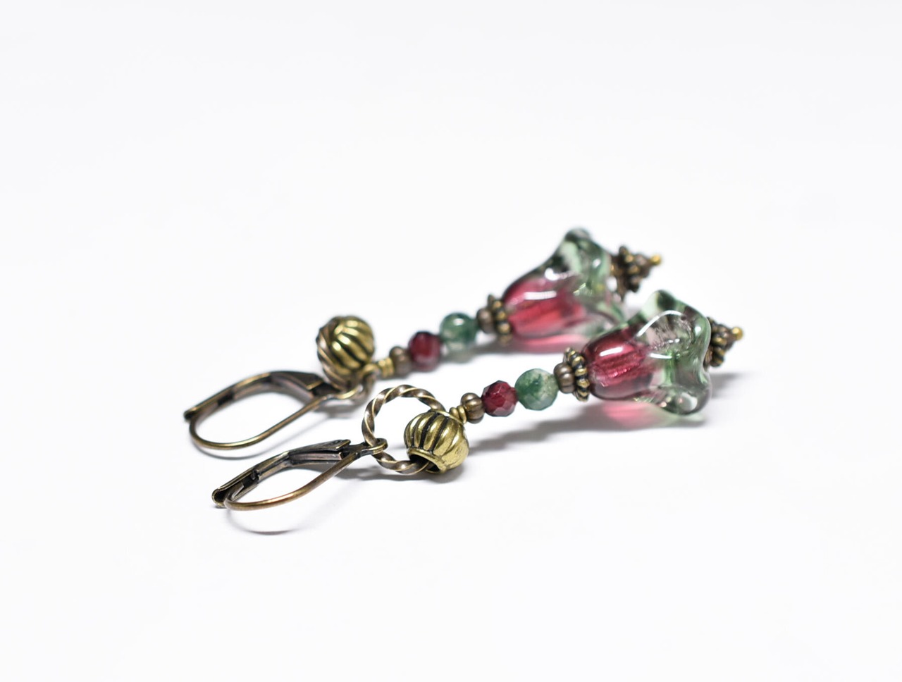エンジェルトランペットの様なドイツヴィンテージビーズとガーネット&モスアゲートなどを繋いだピアスです。