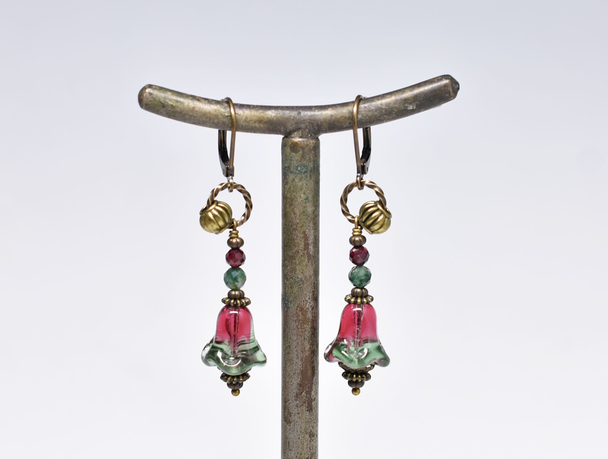 エンジェルトランペットの様なドイツヴィンテージビーズとガーネット&モスアゲートのピアス