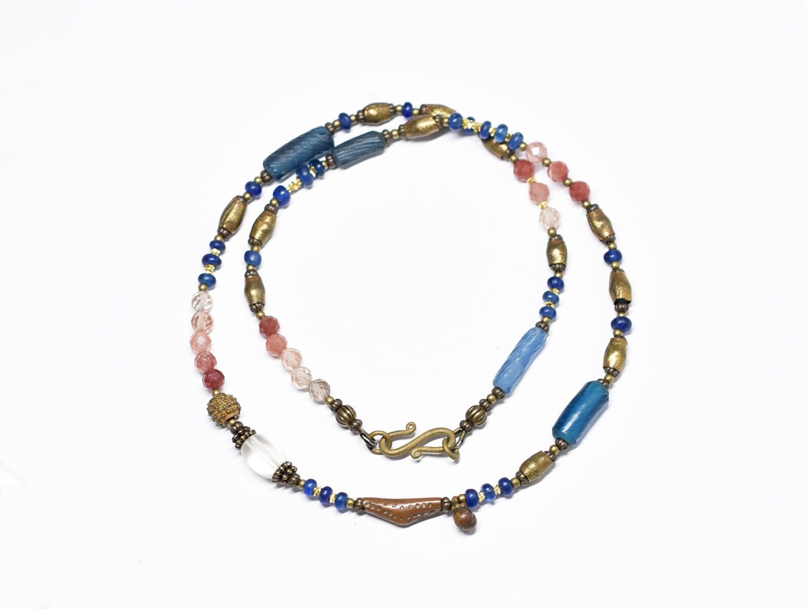 ローマングラスとアンティークボヘミアビーズ、つぶつぶ&アフリカンブラス、民族鈴、アンデシンを繋いだネックレスです。