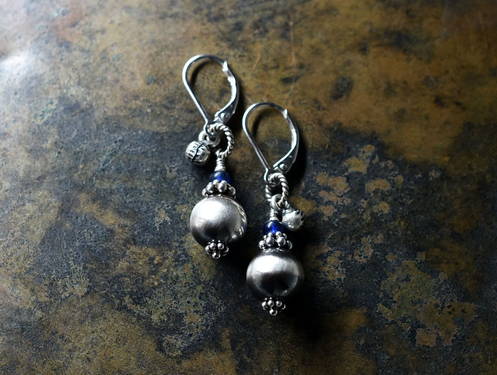 ナバホパールとブルーアンティークビーズ、インドシルバーの鈴とコロンとしたピアス