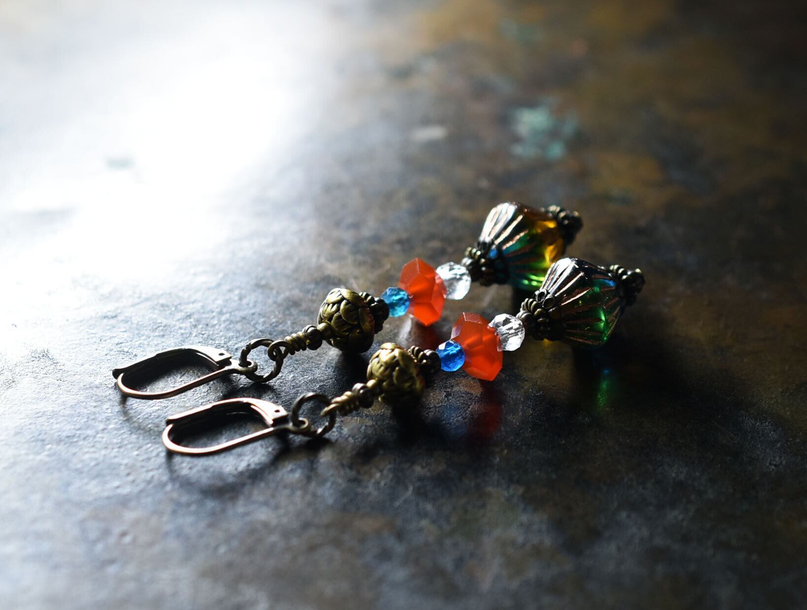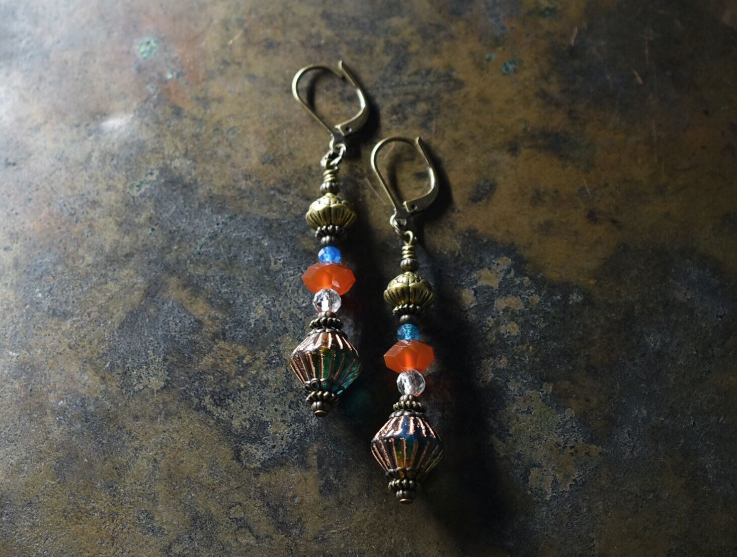 ブルー&琥珀色チェコビーズと蓮華ブラス、カーネリアン、クォーツ、アパタイトを繋いだピアスです。