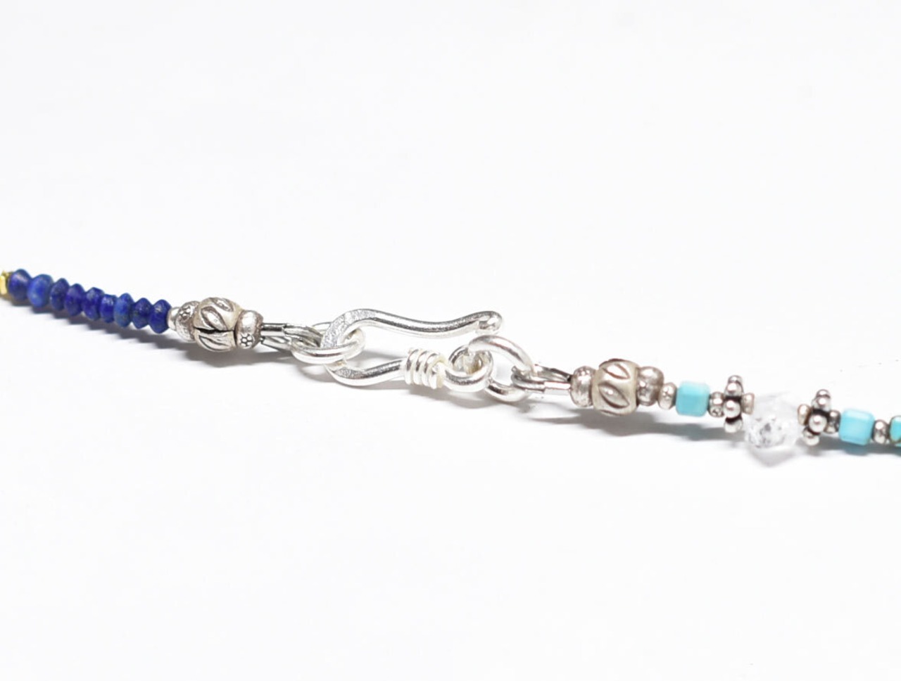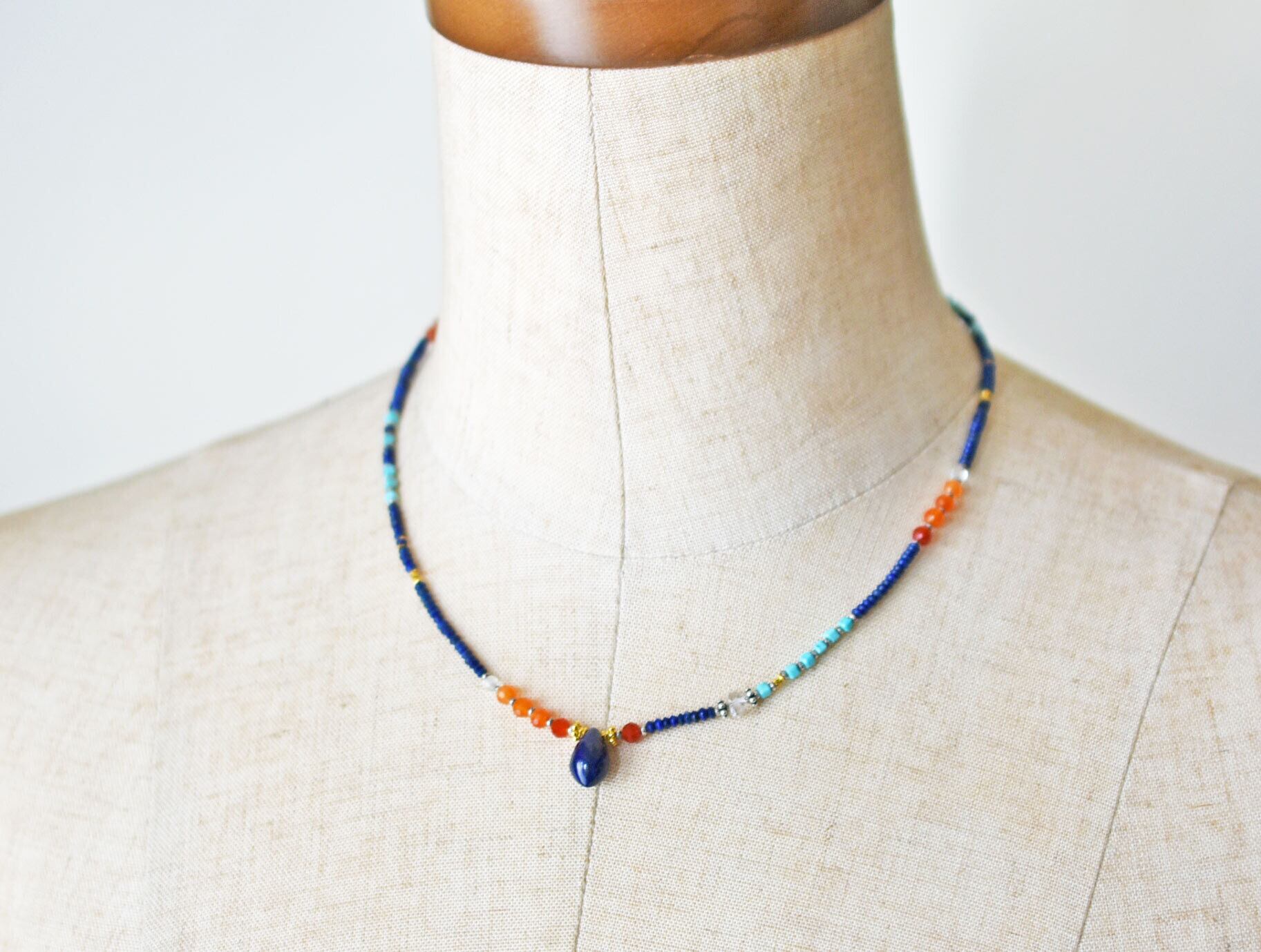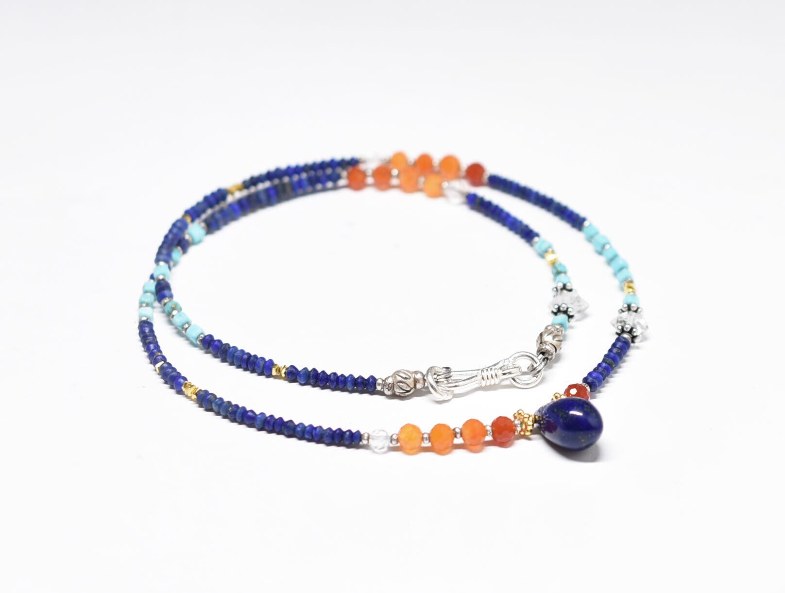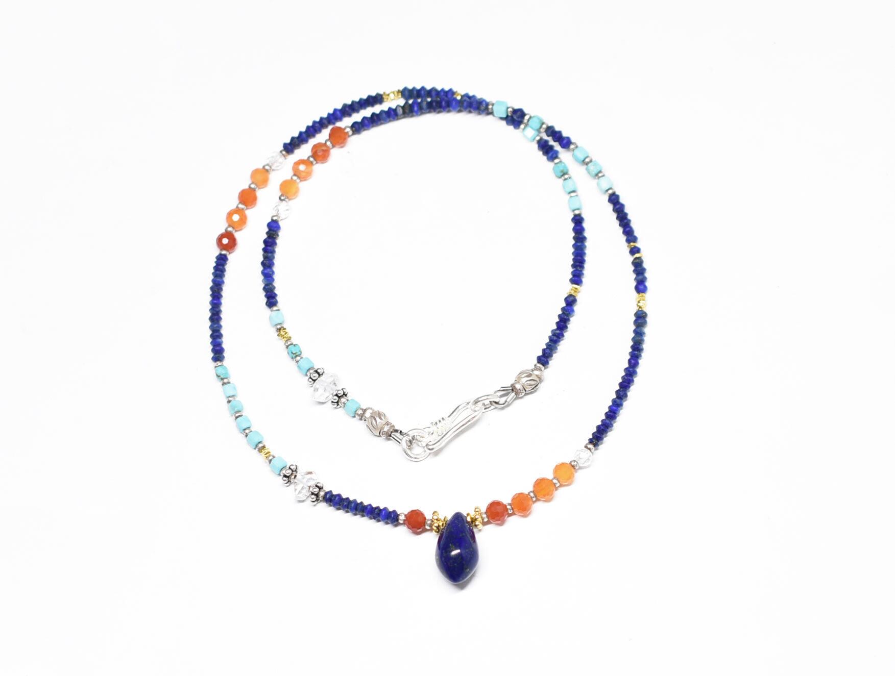 雫型ラピスとカーネリアン、ターコイズ、ハーキマーダイヤモンド、小さなラピス、カレンシルバーを繋いだ華奢なネックレスです。
