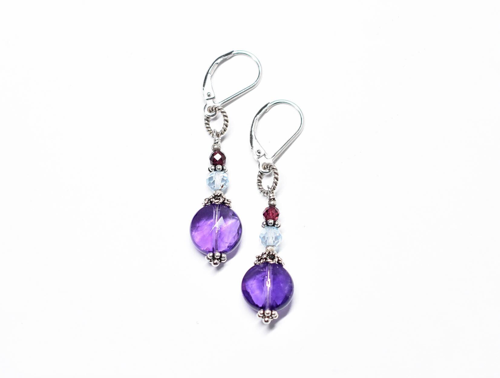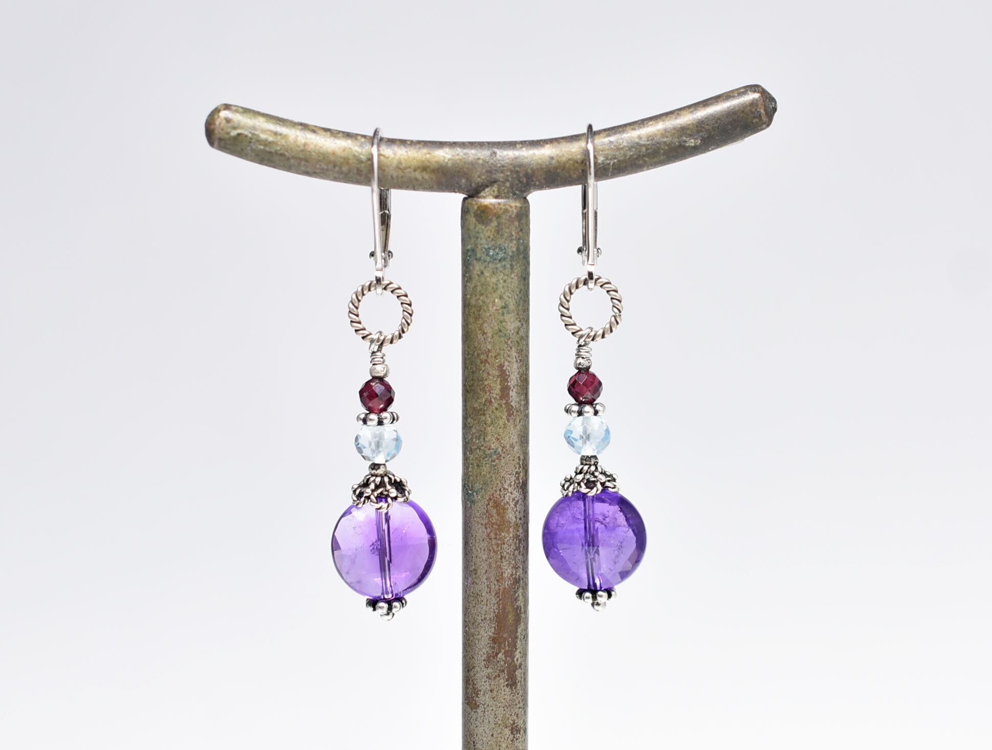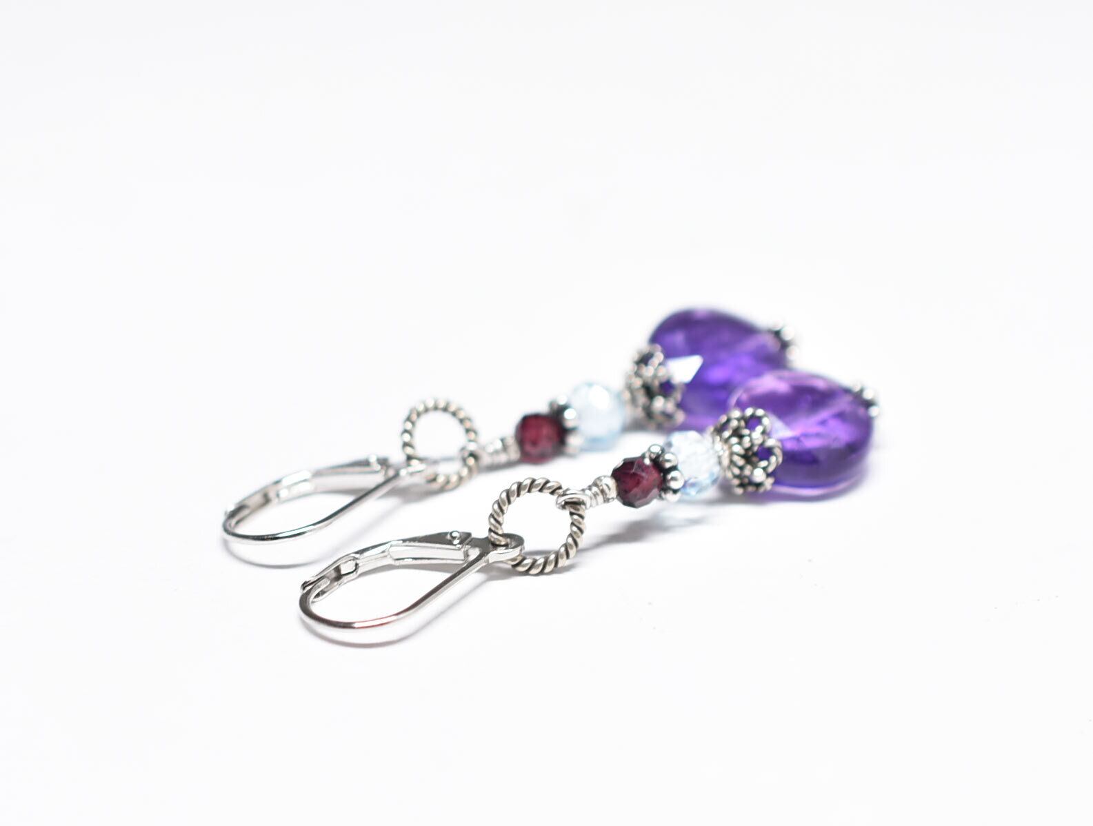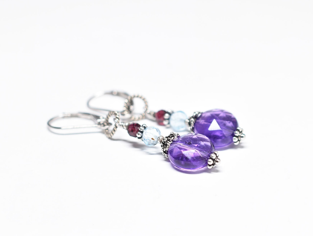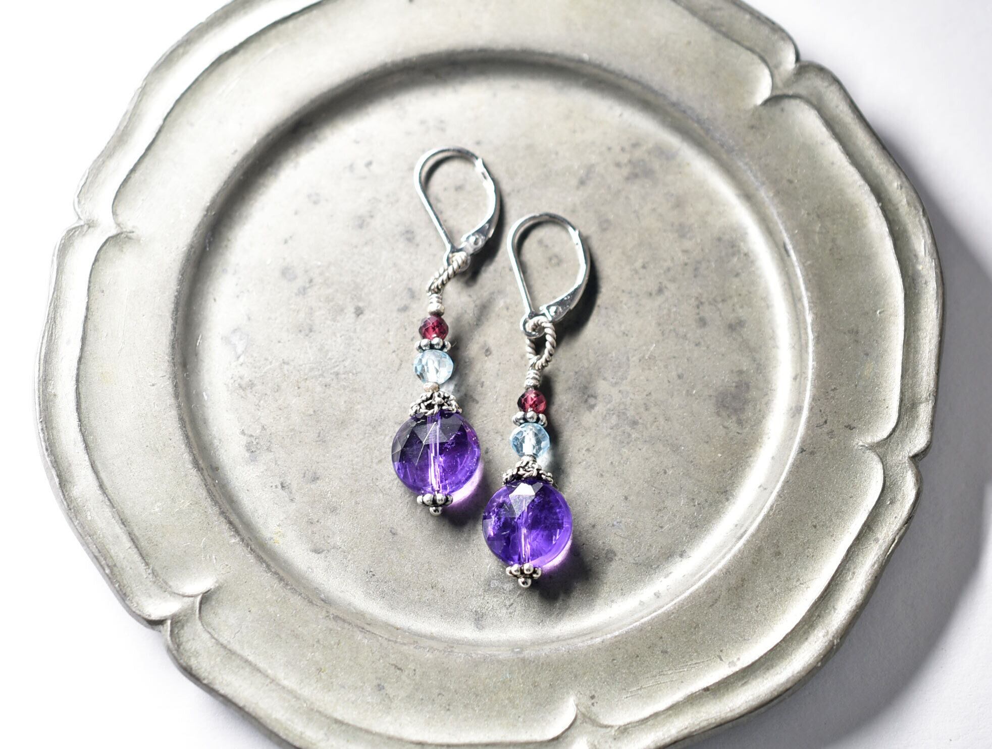 ザンビア産アメジストとブルートパーズ、ガーネットを繋いだピアスです。