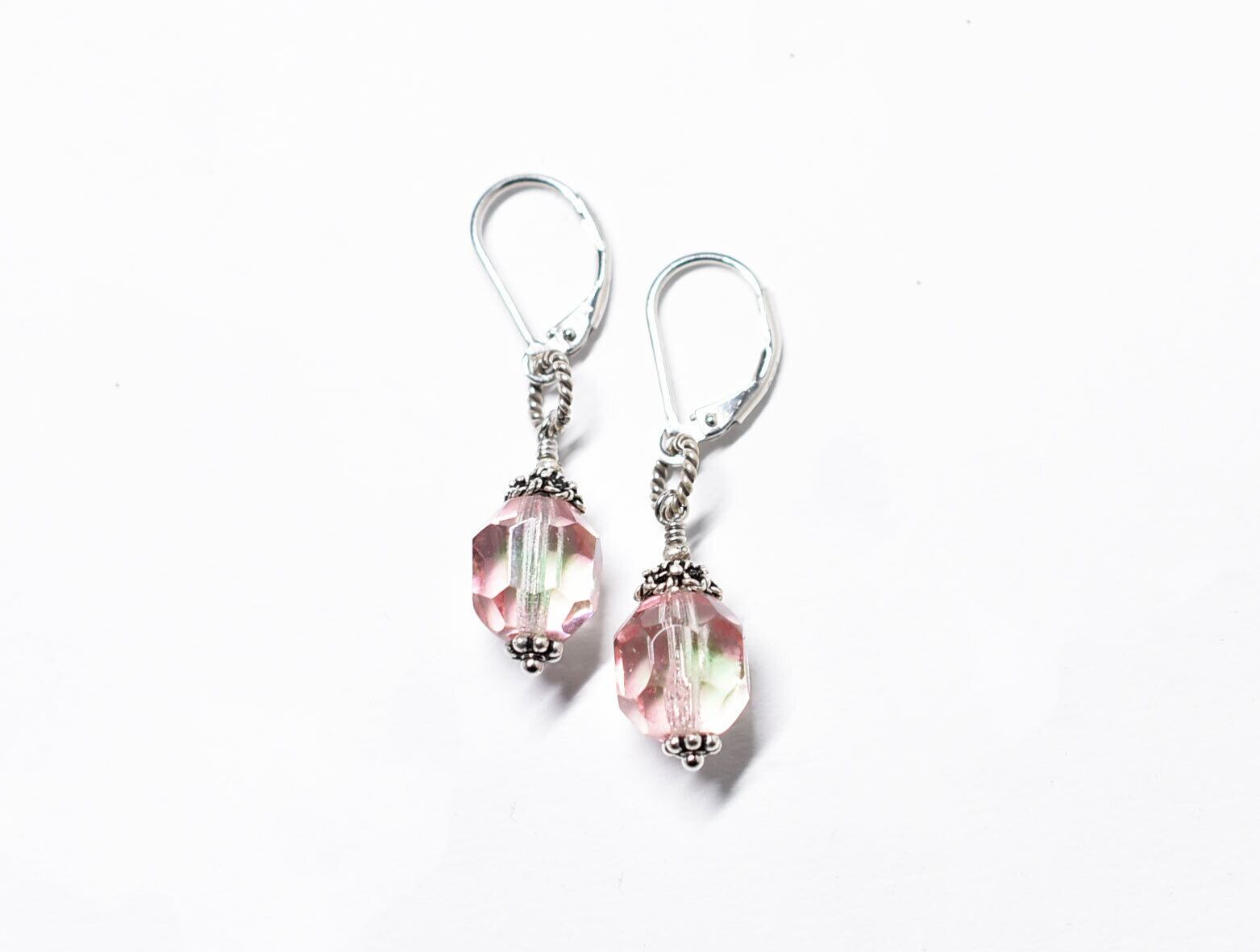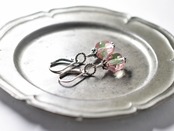 淡いピンク×グリーンのウランガラスビーズの一粒ピアス