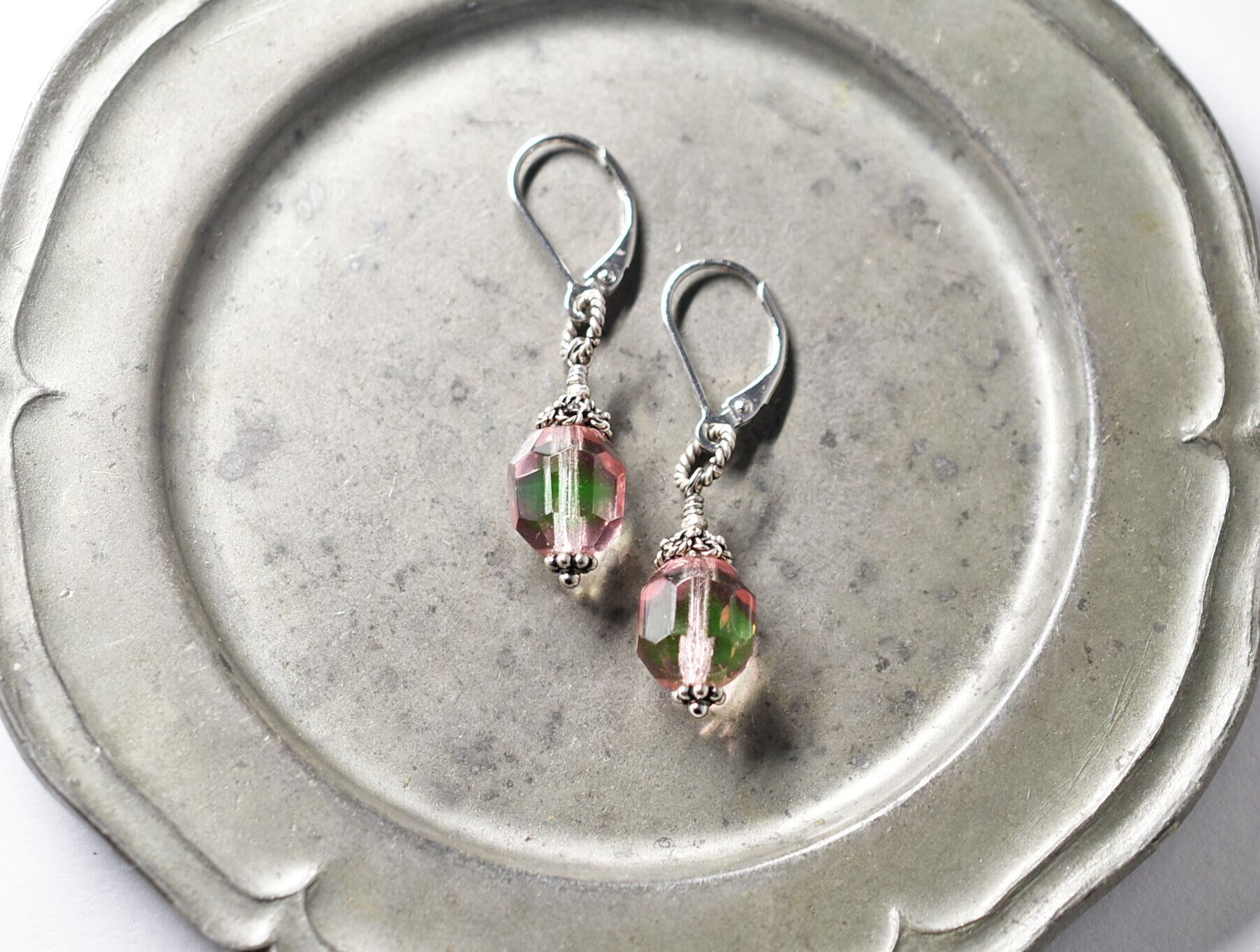 淡いピンク×グリーンのウランガラスビーズを繋いだ一粒ピアスです。