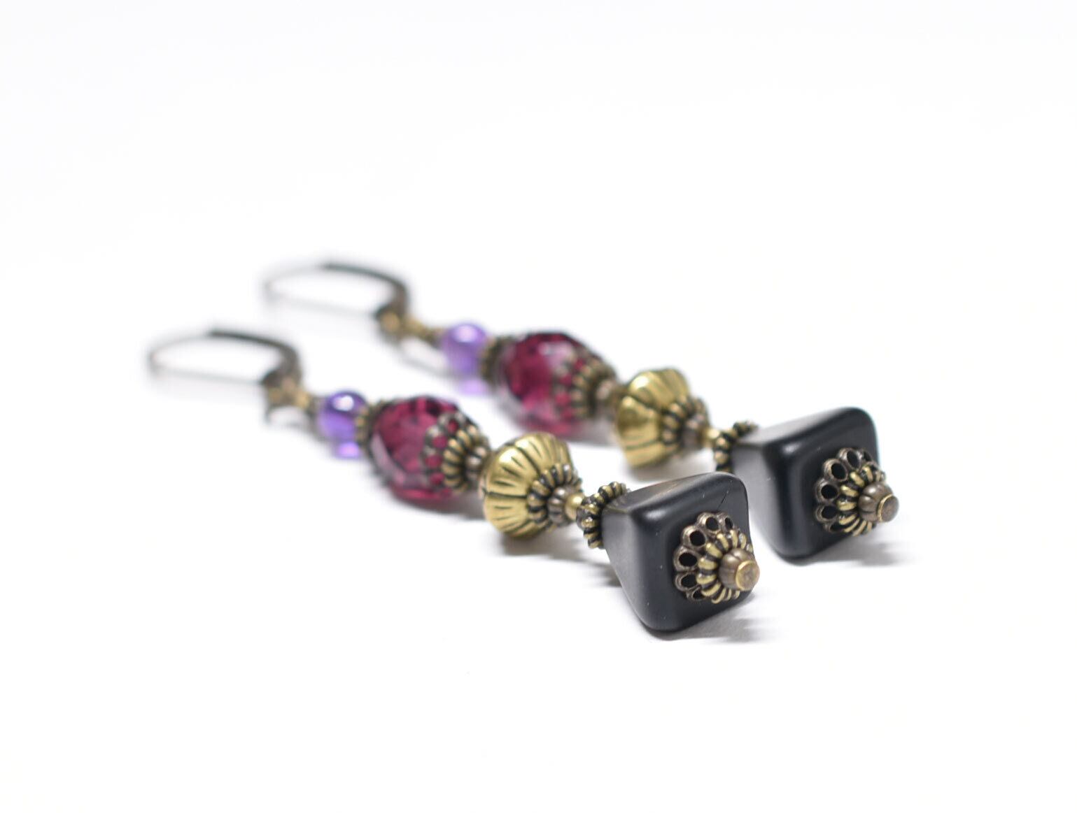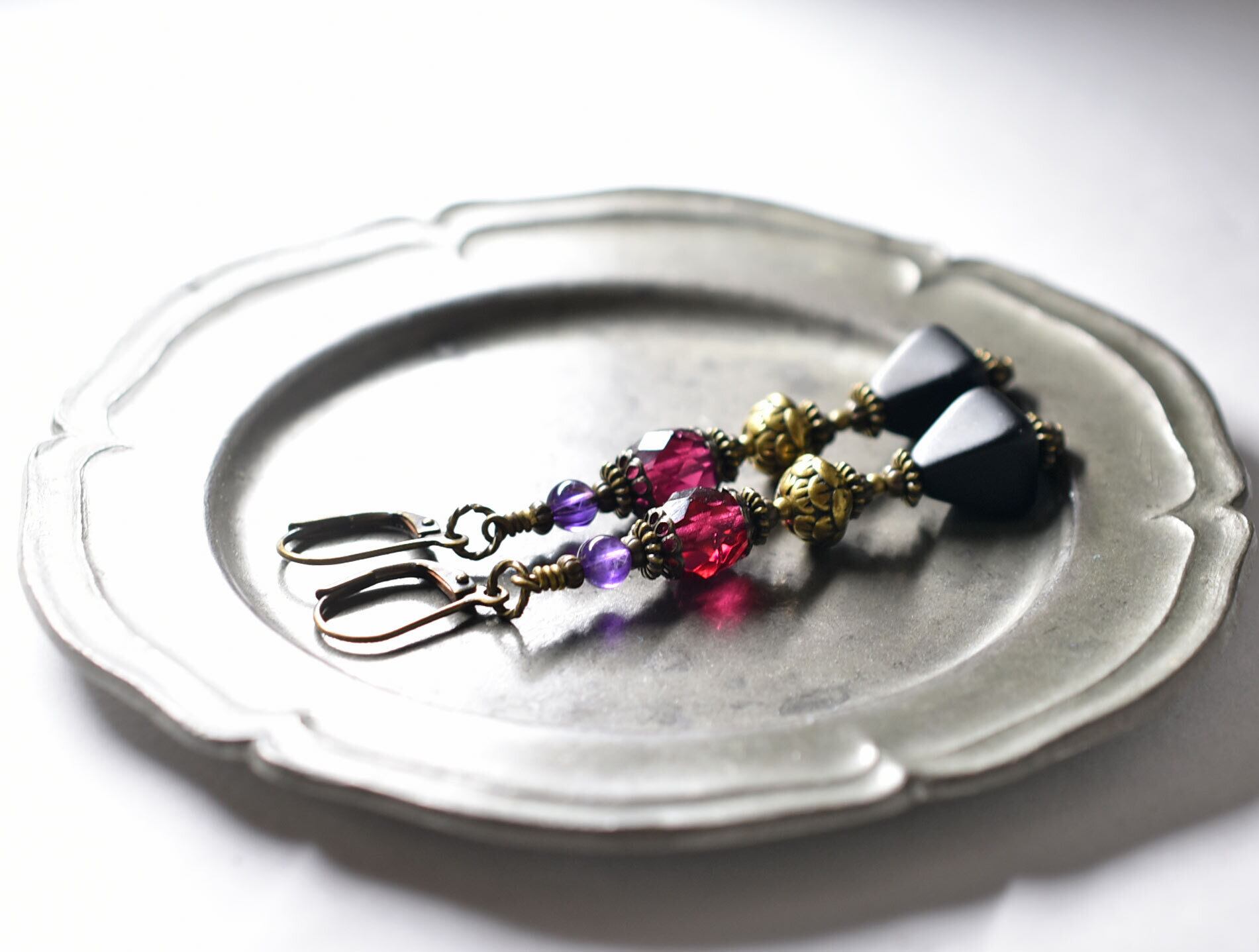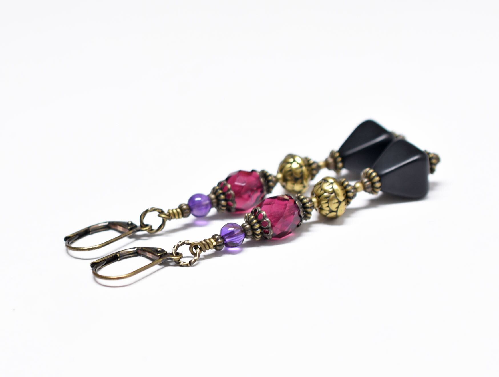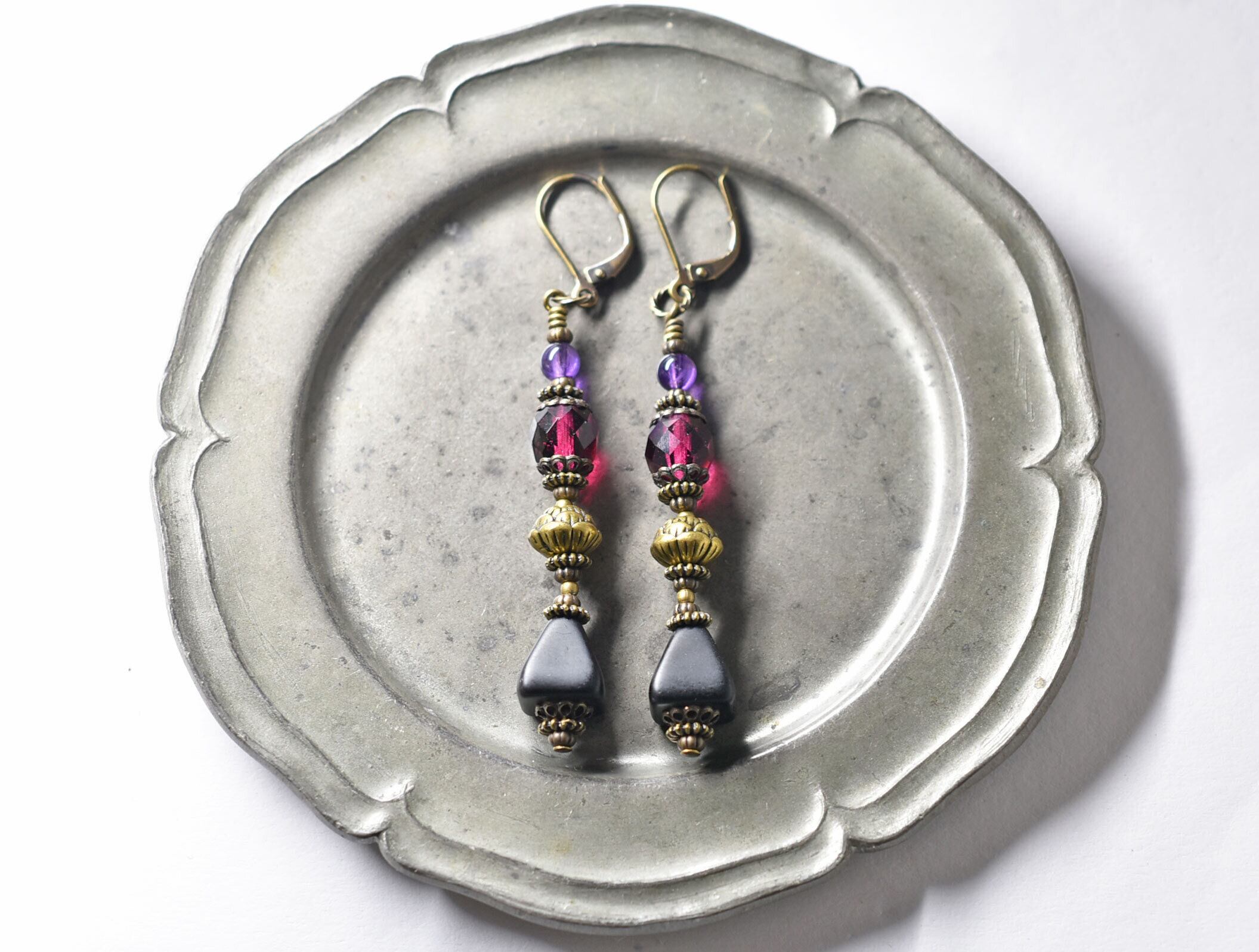 漆黒&ラズベリーカラーヴィンテージボヘミアビーズと蓮華ブラス、アメジストを繋いだピアスです。