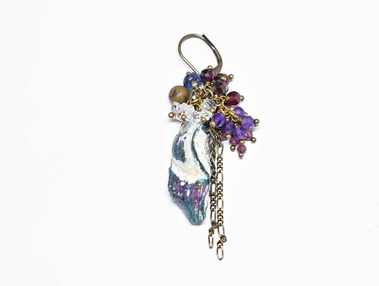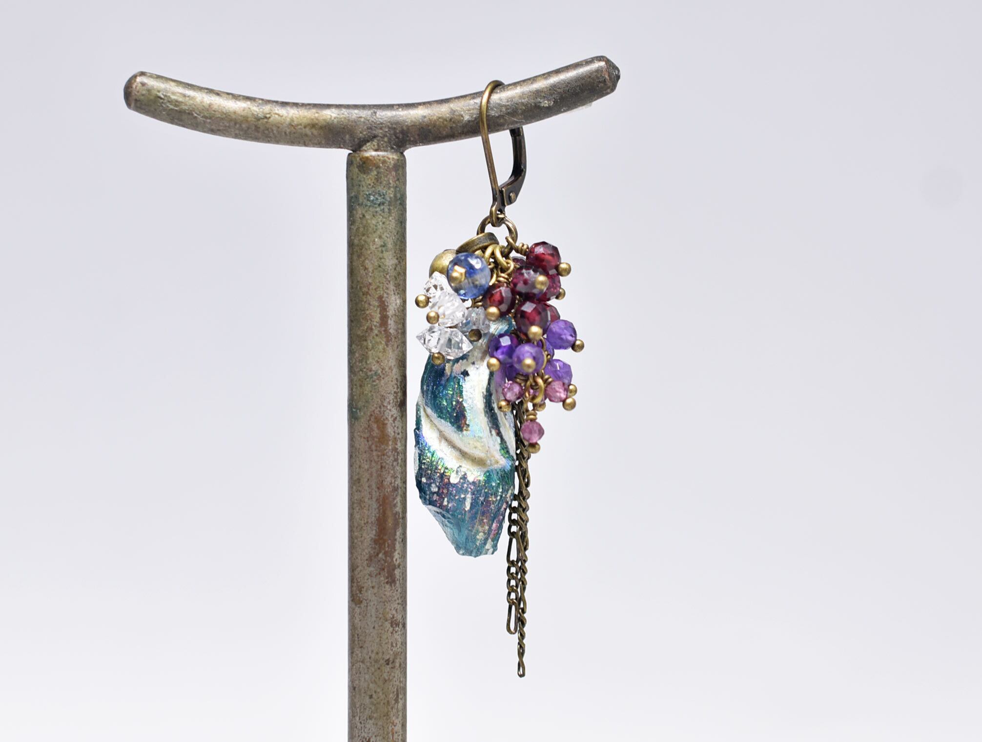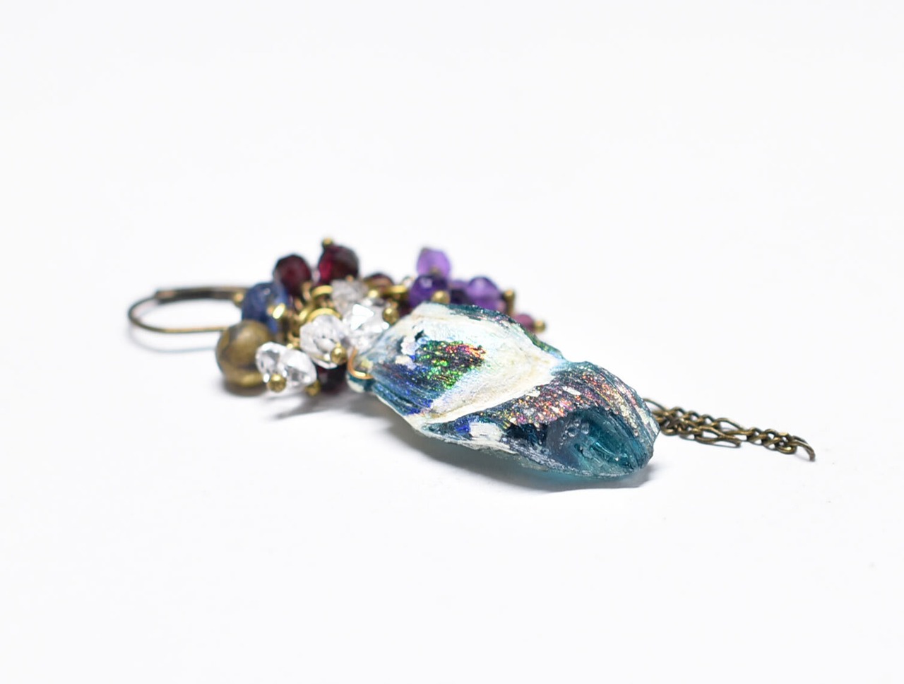 ブルーグリーン銀化ローマングラスとたわわなストーンビーズ、民族鈴、フィガロチェーンを繋いだ片耳ピアスです。