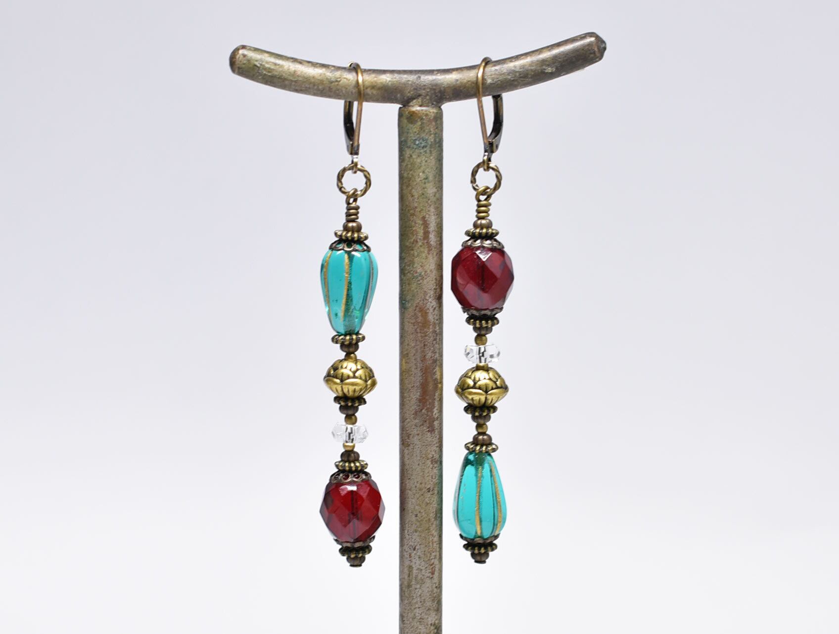 ピーコックグリーン&真っ赤なチェコビーズと蓮華ブラス、クォーツを繋いだアンシメトリーなピアスです。