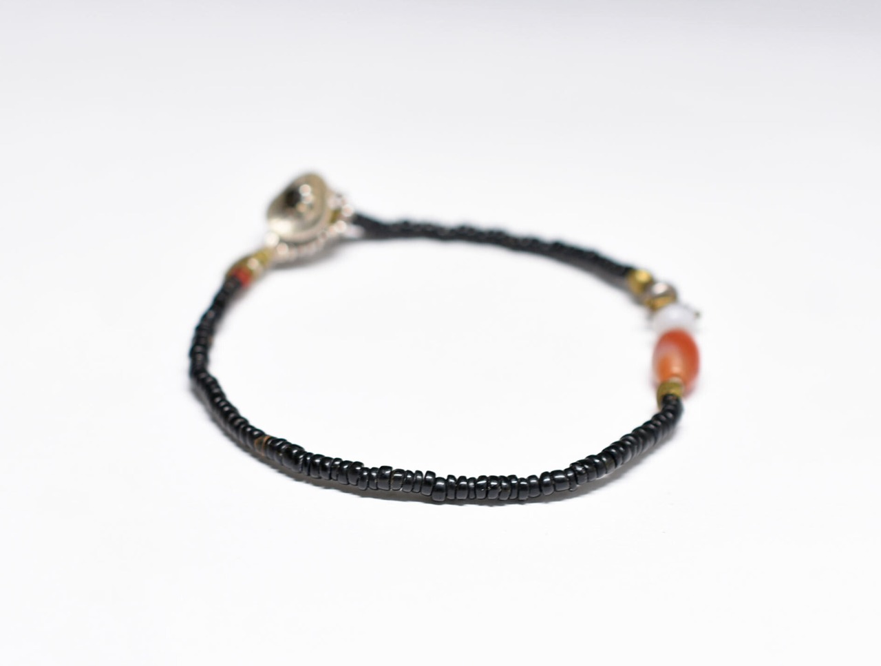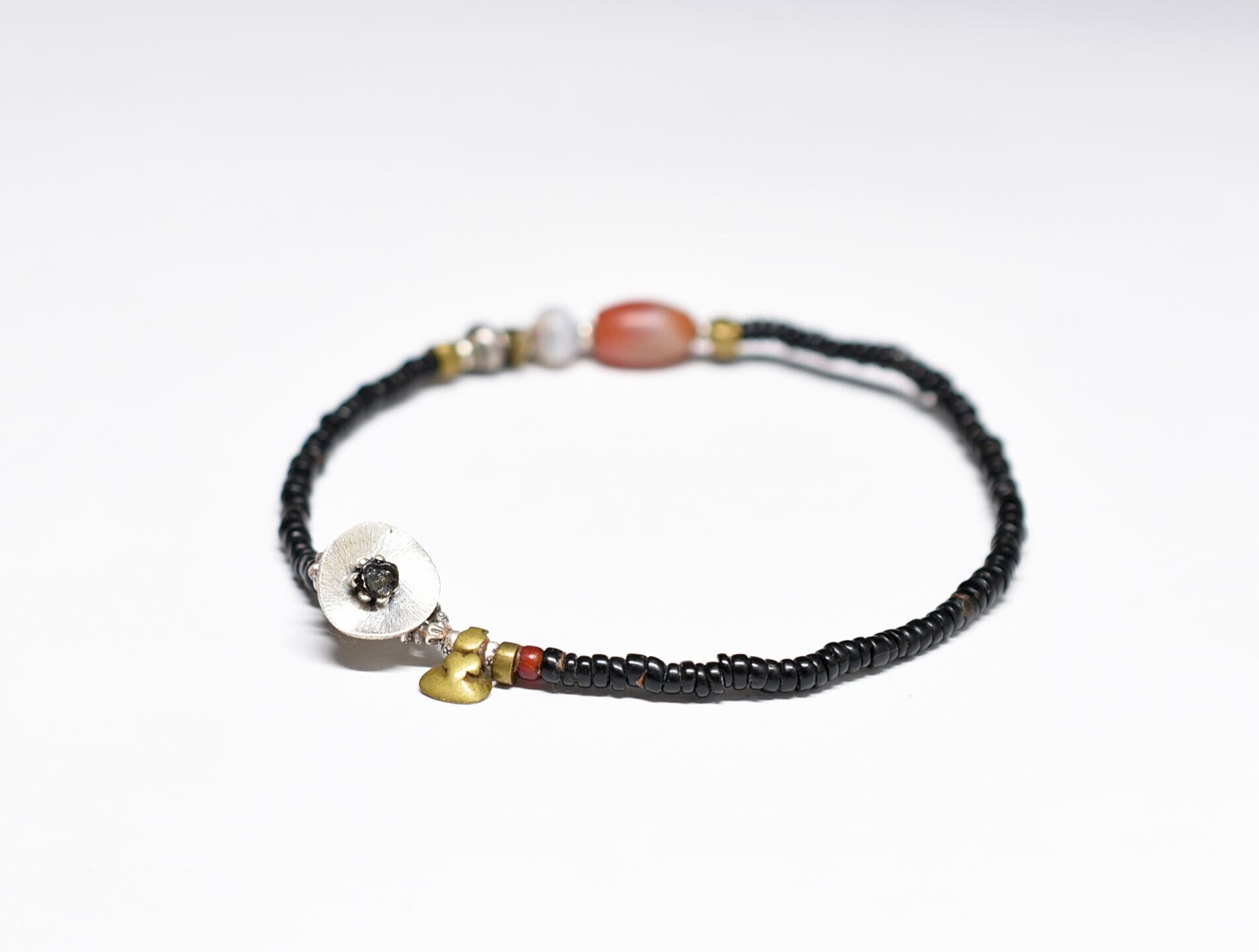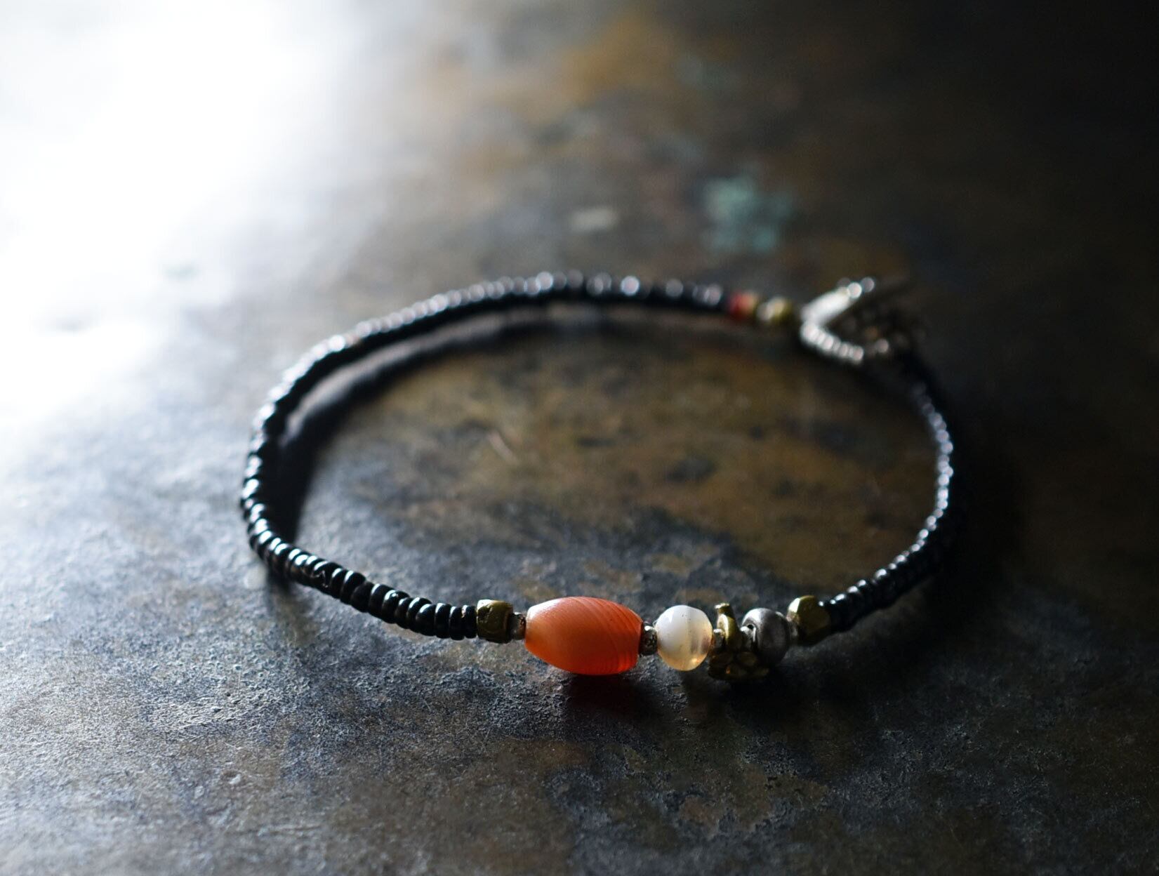漆黒シードビーズとシャン族ヴィンテージカーネリアン、古代瑪瑙、oldチンシルバー&オリッサブラスを繋いだ華奢なブレスです。