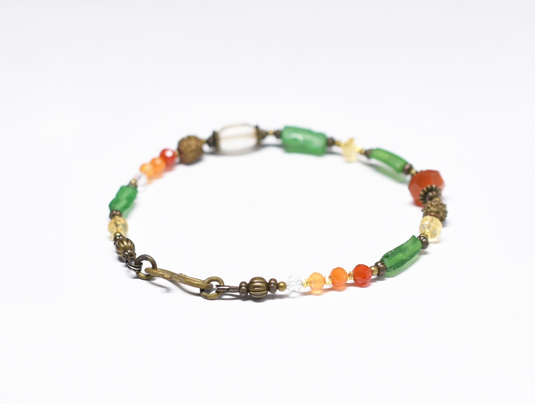 コバルトグリーンローマングラスとアンティークボヘミアビーズ、つぶつぶブラス、カーネリアン&シトリンを繋いだブレスです。
