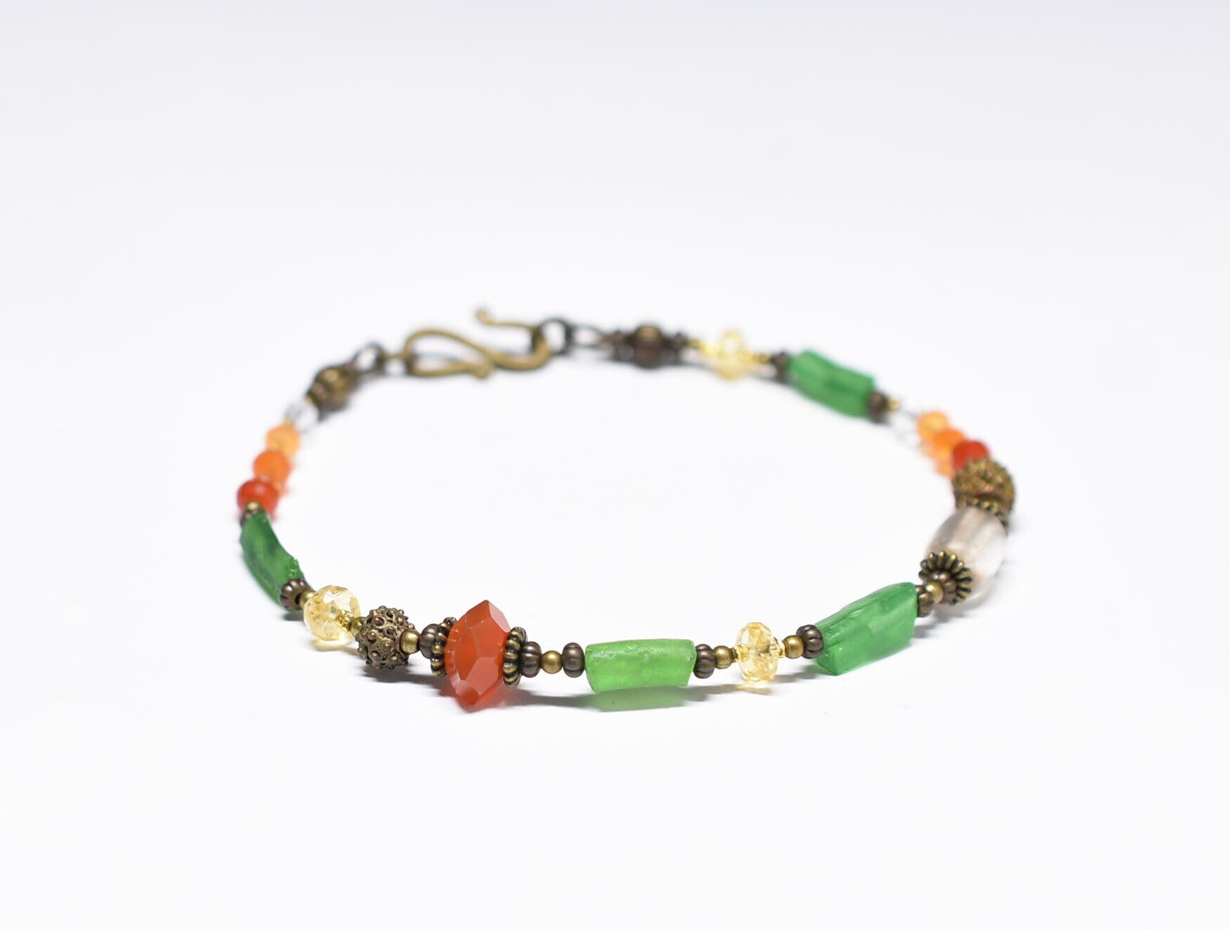コバルトグリーンローマングラスとアンティークボヘミアビーズ、つぶつぶブラス、カーネリアン&シトリンのブレス