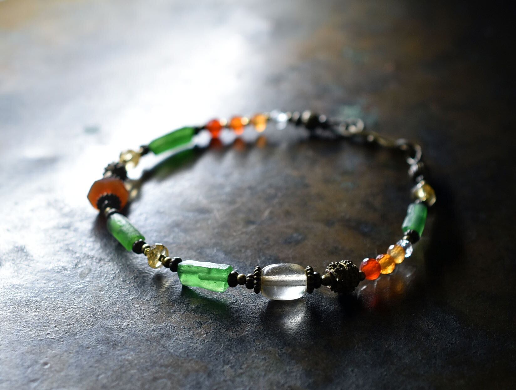 古代ガラスの味わいと、元気の出るビタミンカラーが楽しめるブレスです。