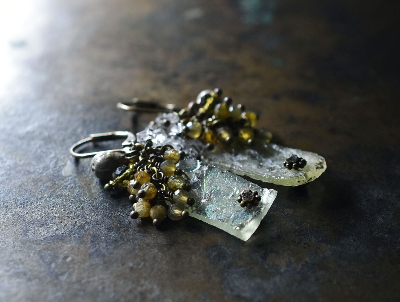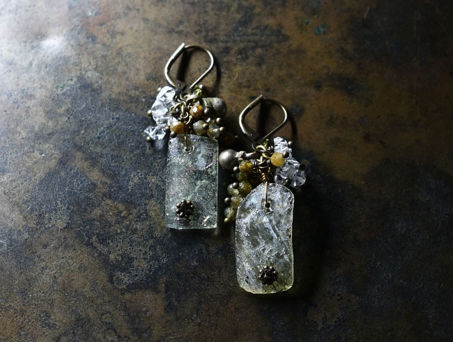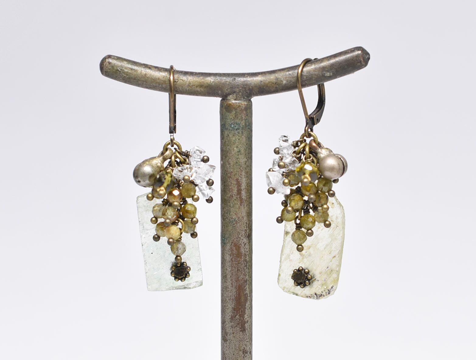 素材:ガラス、真鍮、ミックスメタル、ラブラドライト、ハーキマーダイヤモンド、トルマリン、カレンシルバー