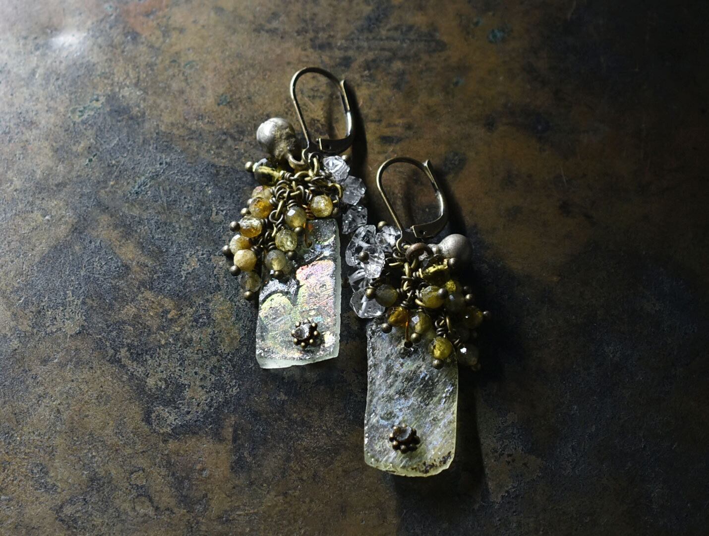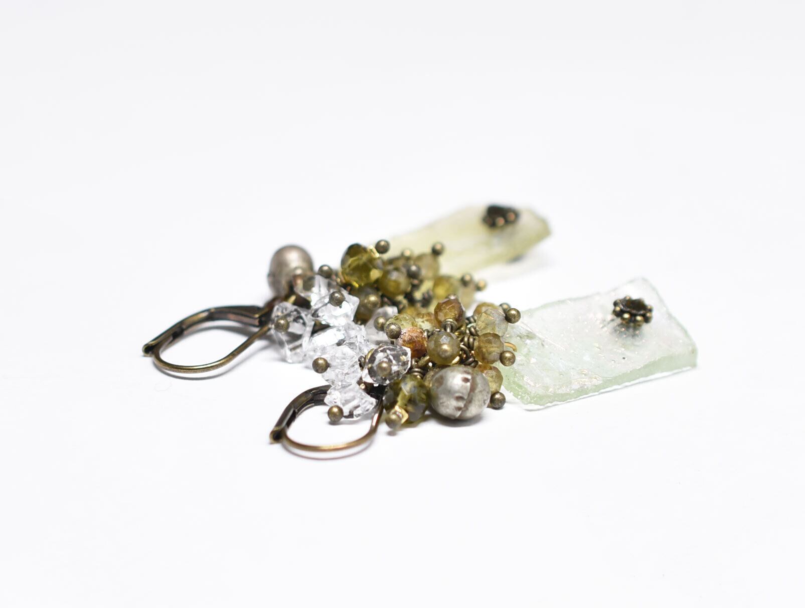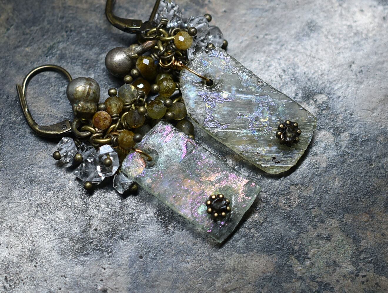 素材:ガラス、真鍮、ミックスメタル、ラブラドライト、ハーキマーダイヤモンド、トルマリン、カレンシルバー
