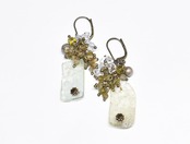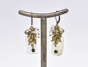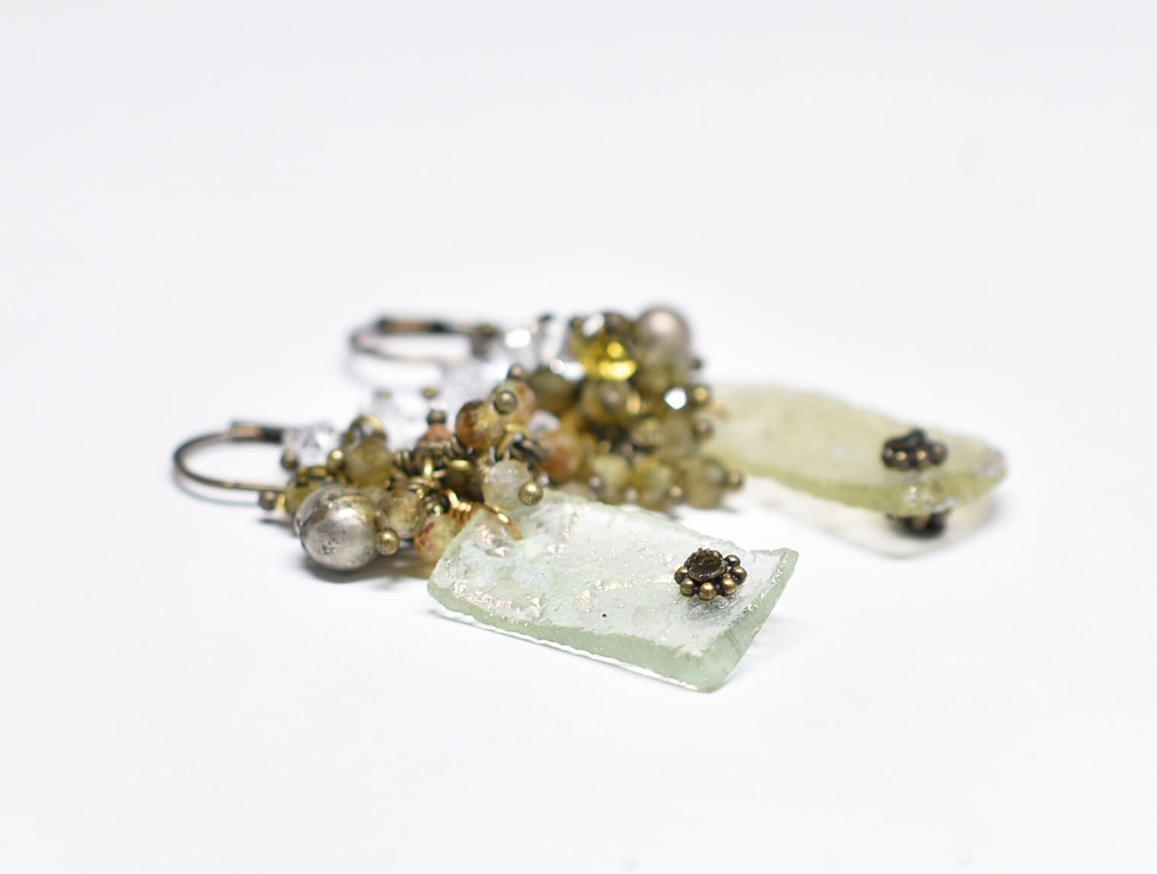 淡いオリーブグリーン&オリーブイエロー銀化ローマングラスとたわわなストーンビーズ、民族鈴のピアス