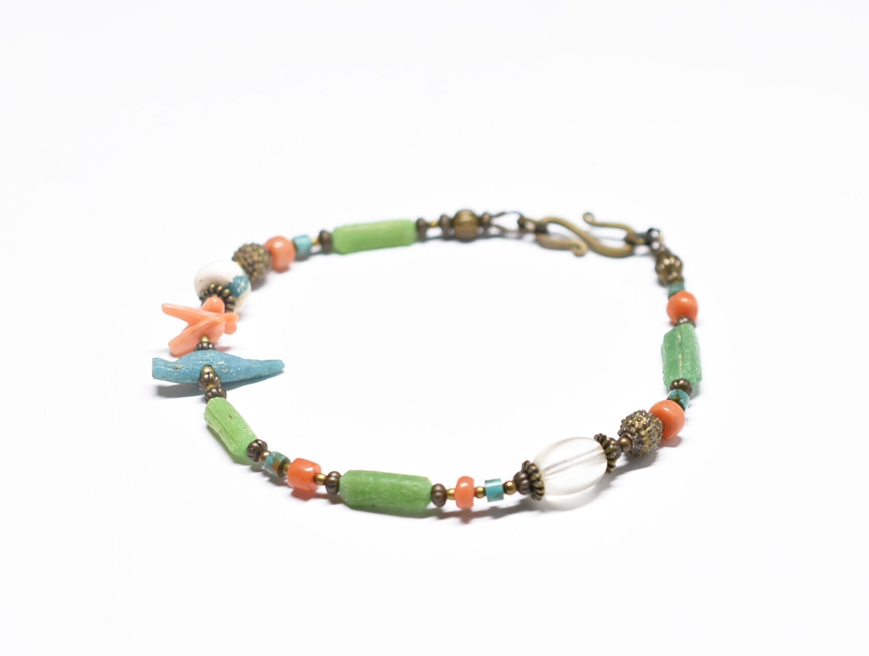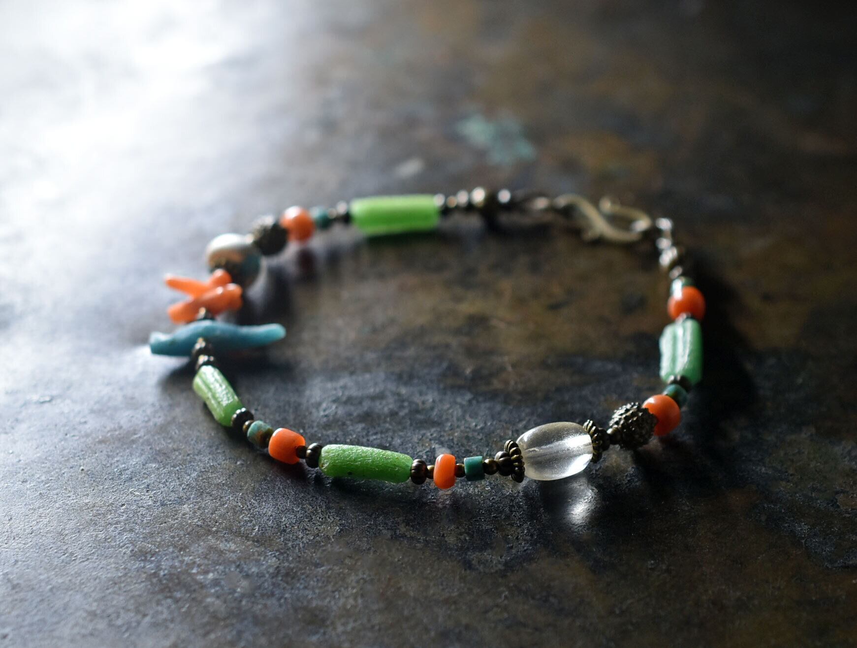 翡翠色ローマングラスとアンティークボヘミアビーズ、つぶつぶブラス、発掘ビーズ、チベタンコーラル&ターコイズのブレス