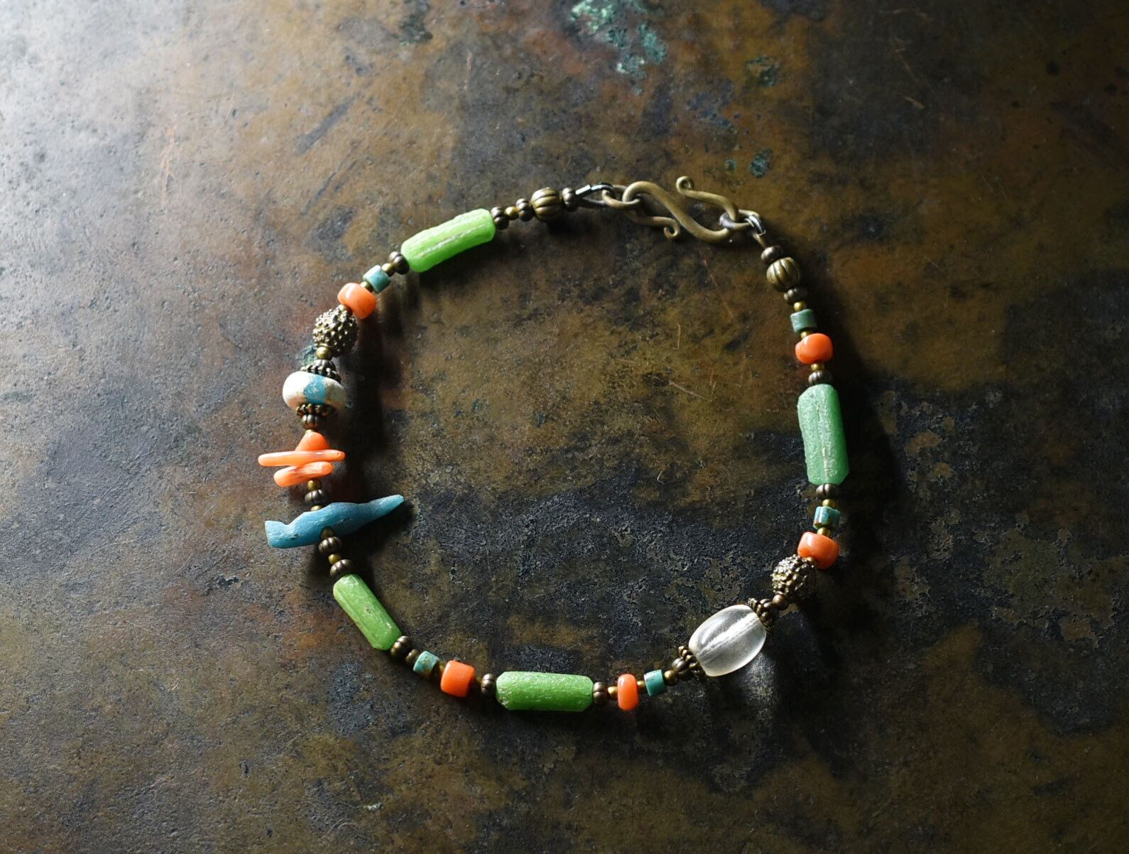 翡翠色ローマングラスとアンティークボヘミアビーズ、つぶつぶブラス、発掘ビーズ、チベタンコーラル&ターコイズを繋いだブレスです。
