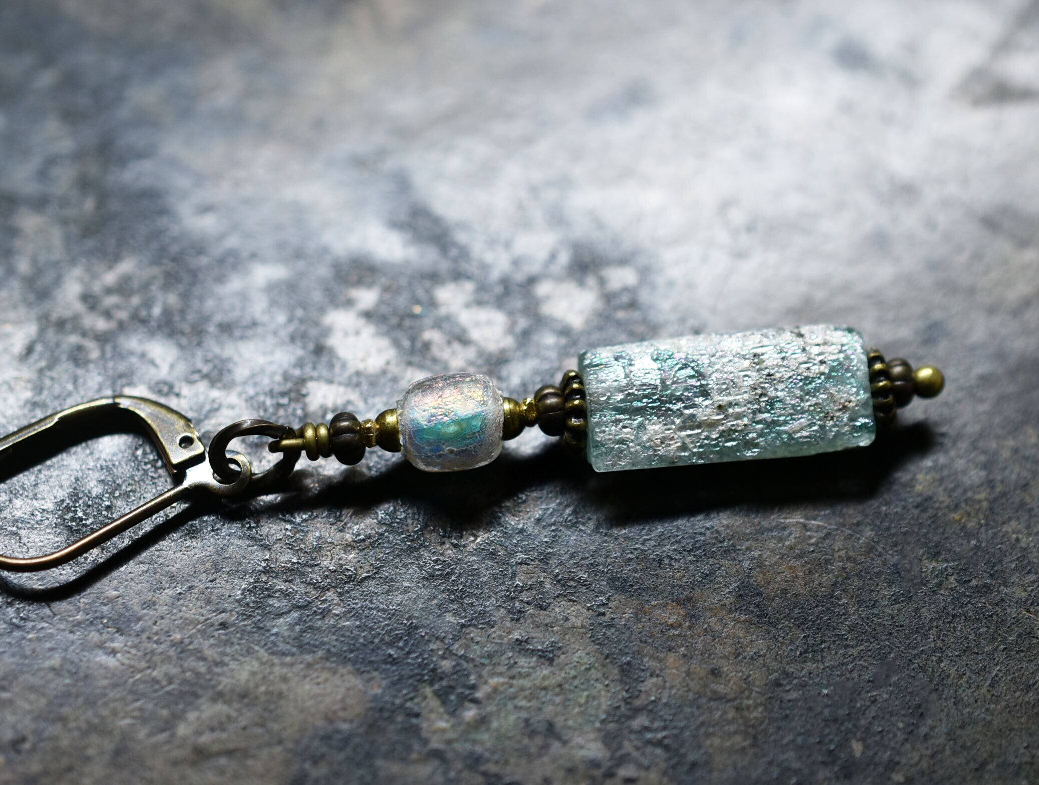 古代ガラスの魅力と輝きが楽しめる、神秘的なピアスです。